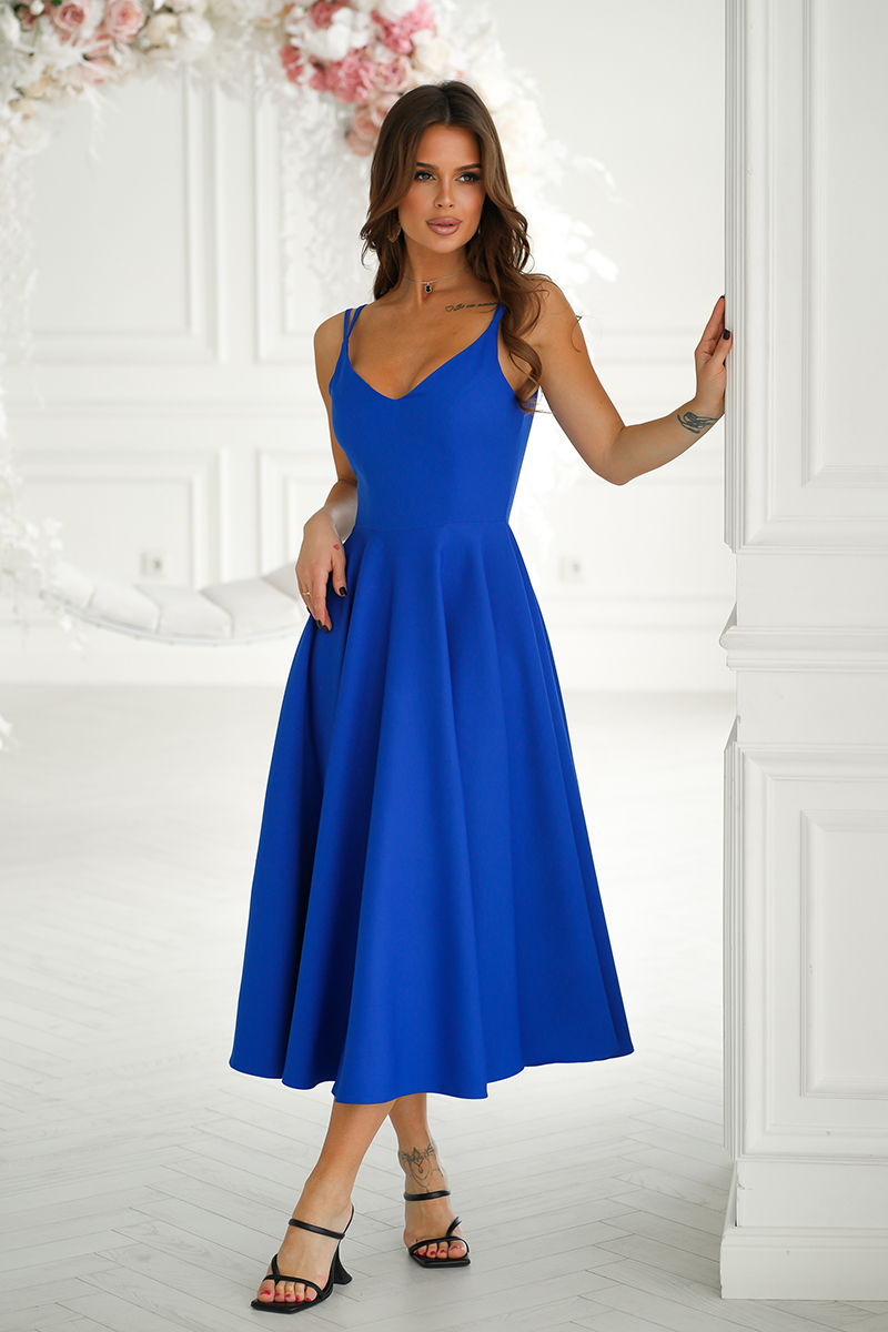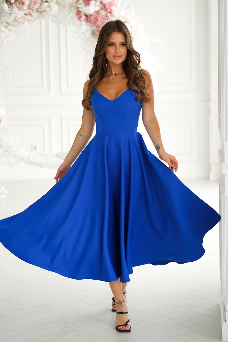 Ez a nőies, midi hosszúságú ruha könnyed és finom megjelenést biztosít. A felső része vékony pántokon fut, szépen kiemelve a vállakat és a hátat, miközben a deréknál tökéletesen követi a test vonalát. A szoknyarész enyhén bővülő szabása elegáns mozgást ad minden lépésnél, így igazán kifinomult és légies hatást kelt.