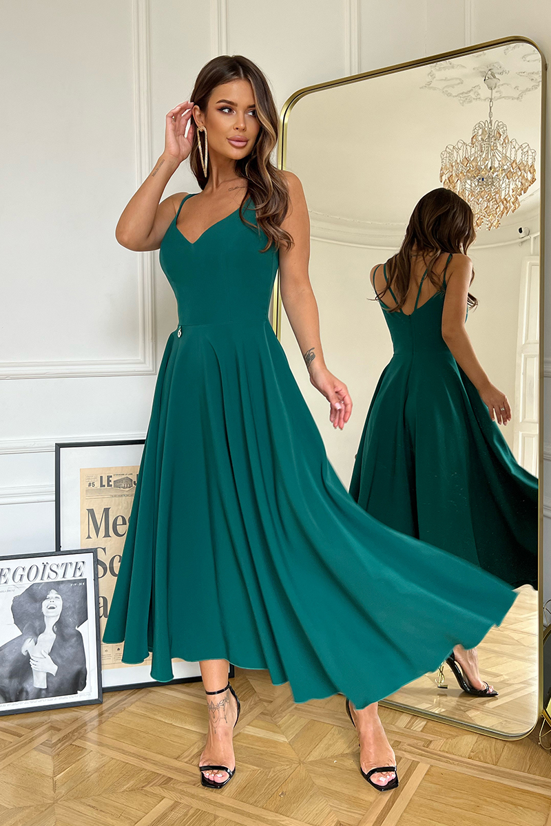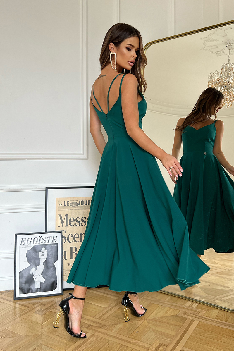 Ez a nőies, midi hosszúságú ruha könnyed és finom megjelenést biztosít. A felső része vékony pántokon fut, szépen kiemelve a vállakat és a hátat, miközben a deréknál tökéletesen követi a test vonalát. A szoknyarész enyhén bővülő szabása elegáns mozgást ad minden lépésnél, így igazán kifinomult és légies hatást kelt.