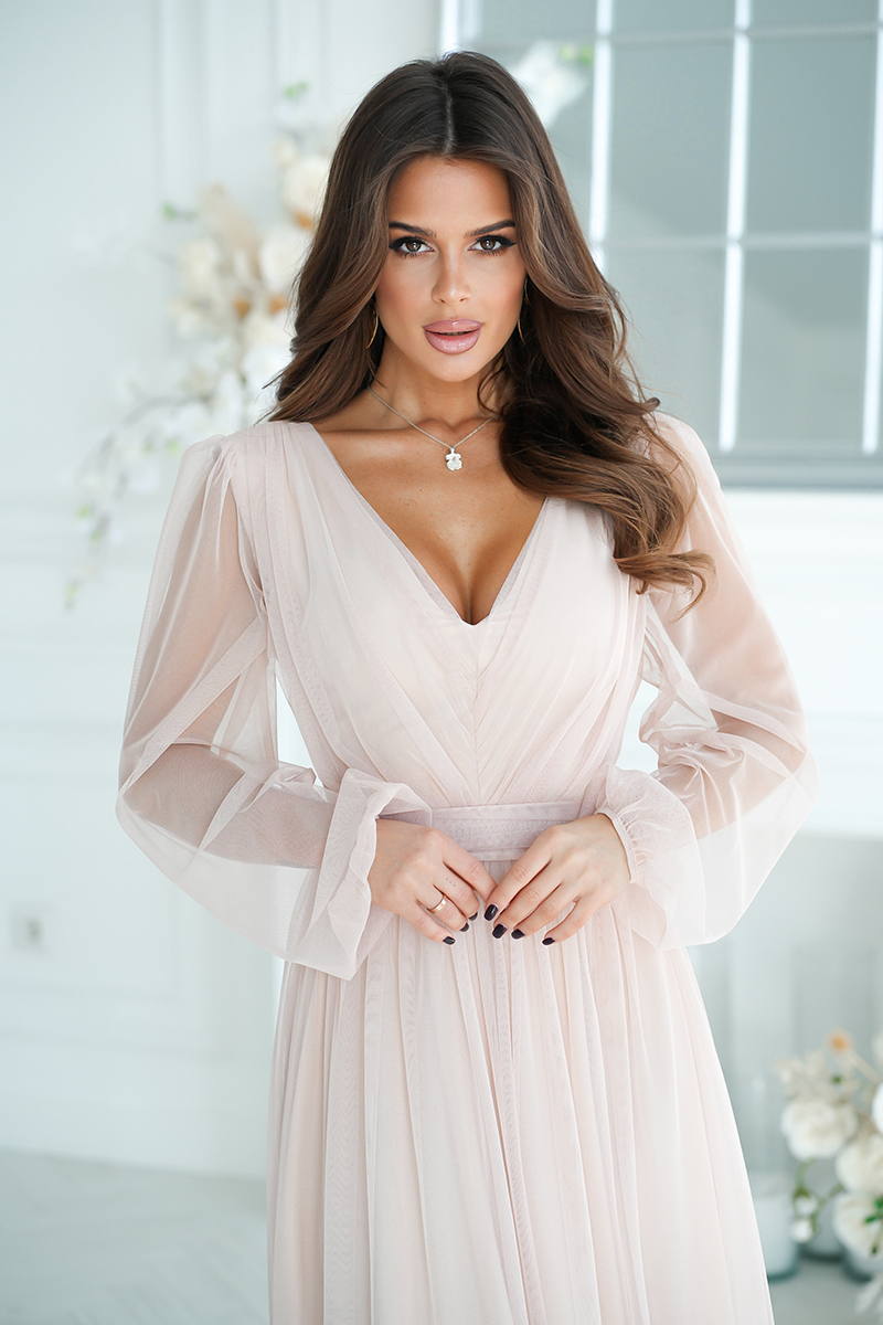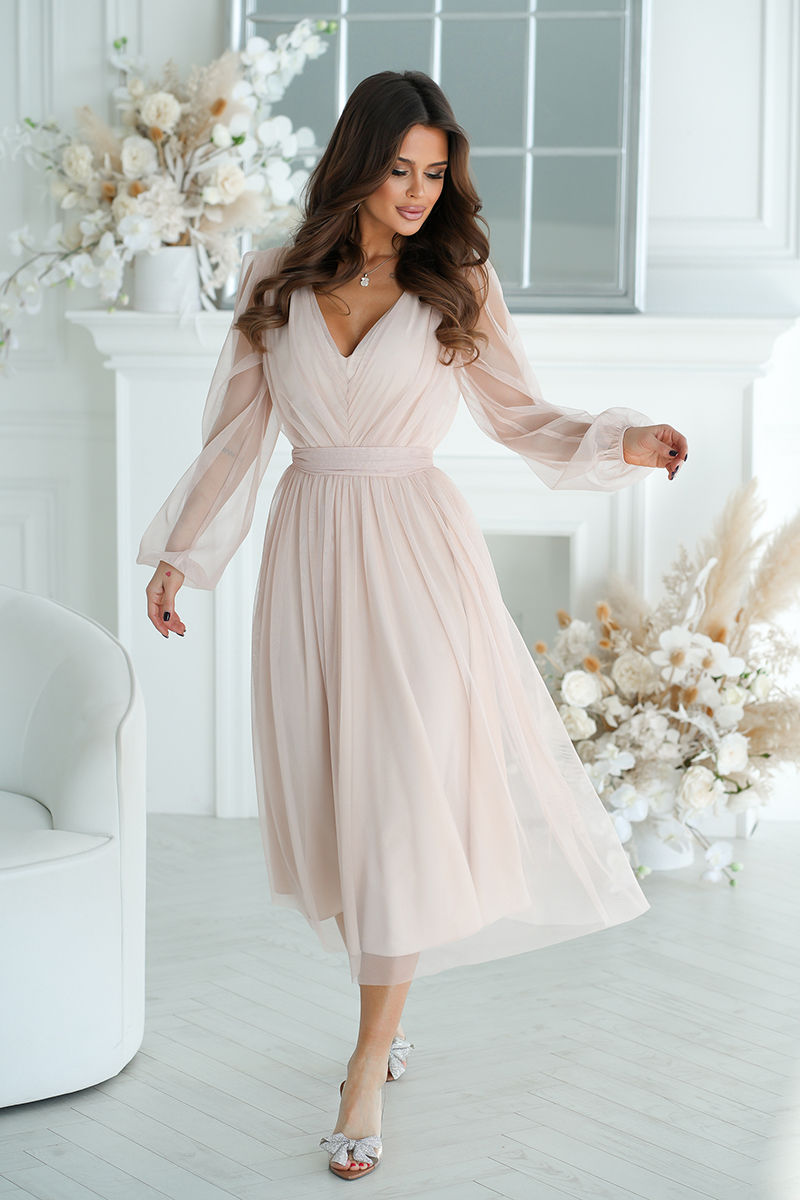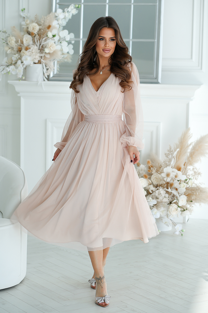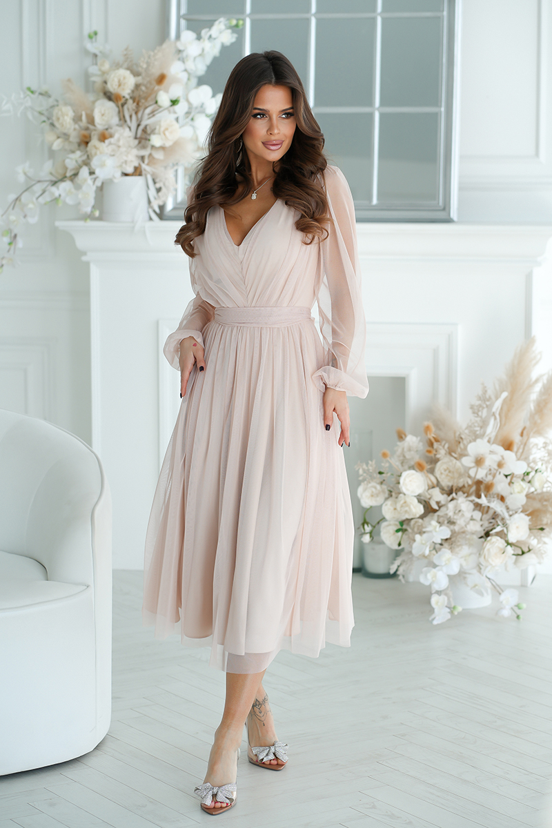 Sukienka midi z  lekko rozkloszowaną warstwową spódnicą wykończoną brokatową siateczką.
