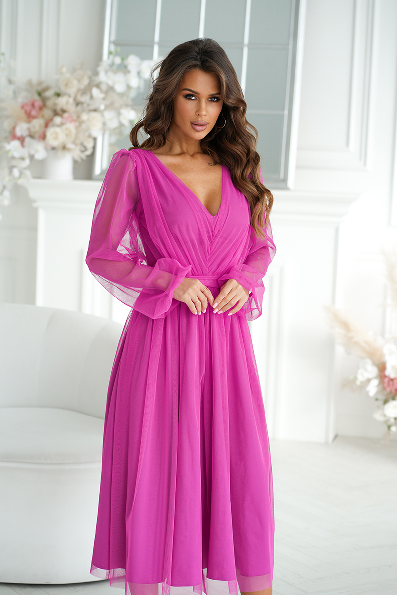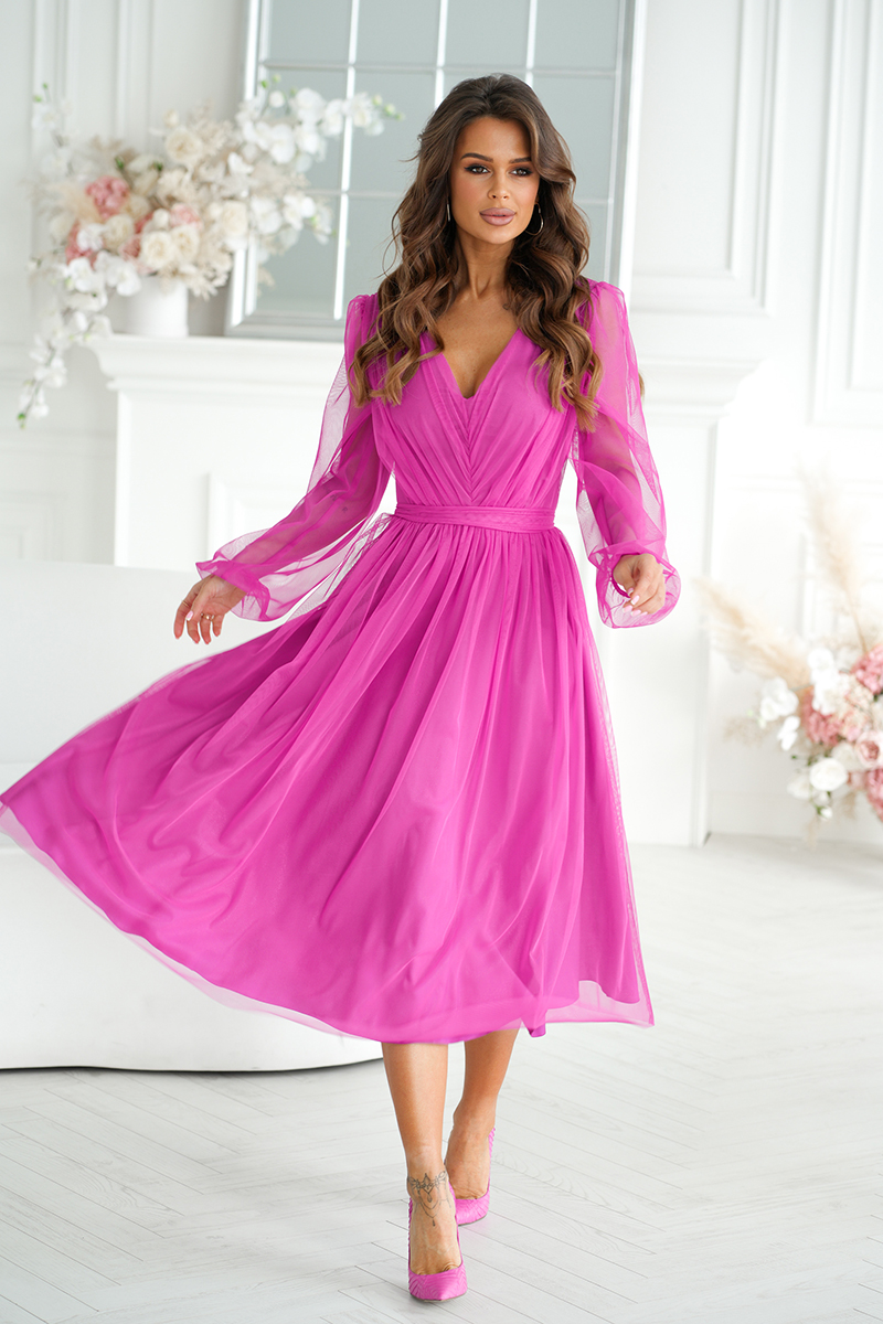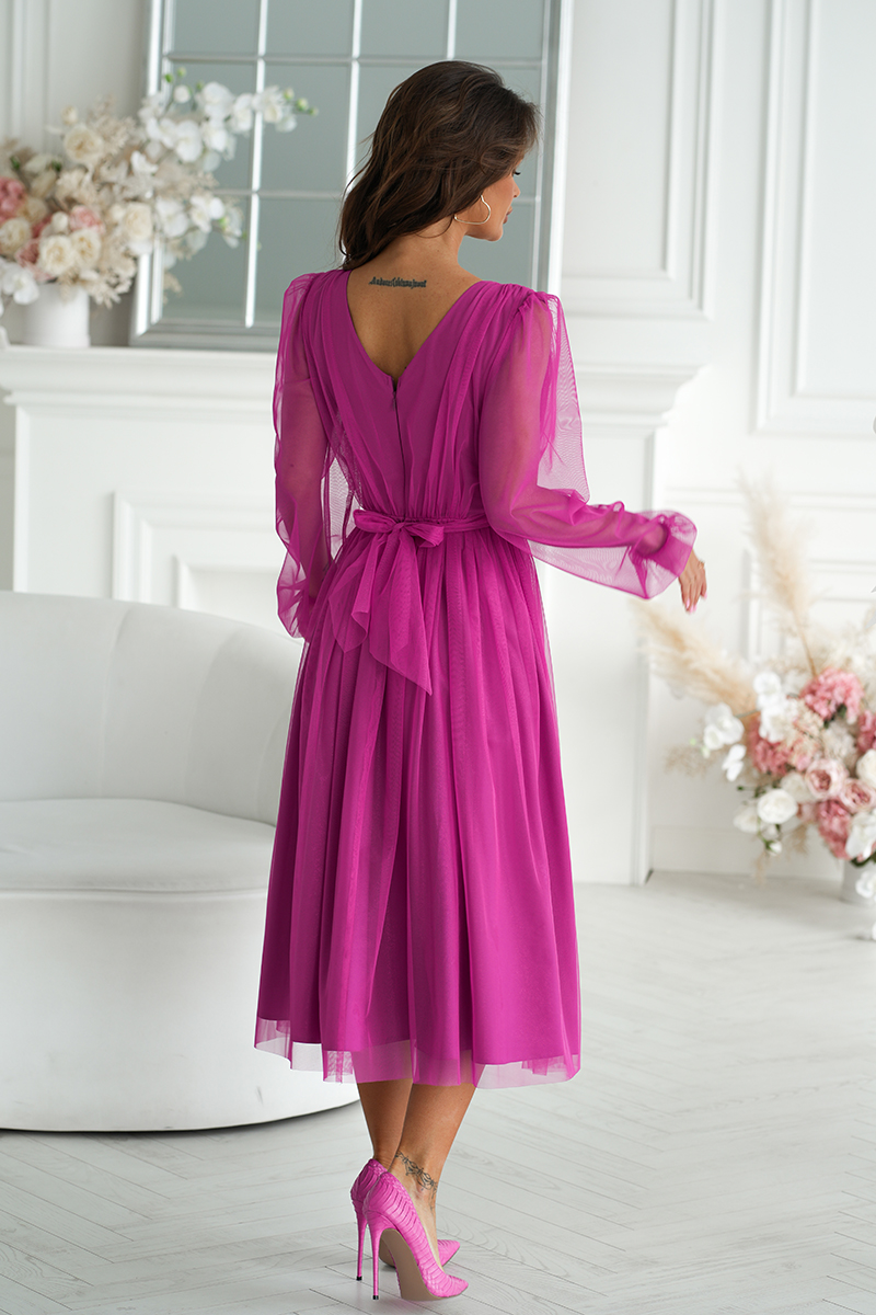 Ez a midi hosszúságú ruha igazán nőies, könnyed és látványos darab. A finoman bővülő, réteges szoknyarész csillogó hatású, csillámos hálóval készült, amely minden mozdulatnál elegánsan játszik a fényben. A felső részen lágy ráncolás található, a hosszú ujjak pedig gumírozott mandzsettával záródnak. Az ujjak ugyanabból a légies hálós anyagból készültek, mint a ruha többi része, így egységes, harmonikus összhatást teremtenek.