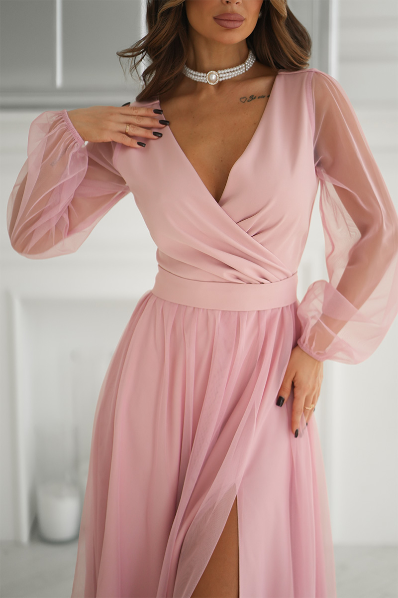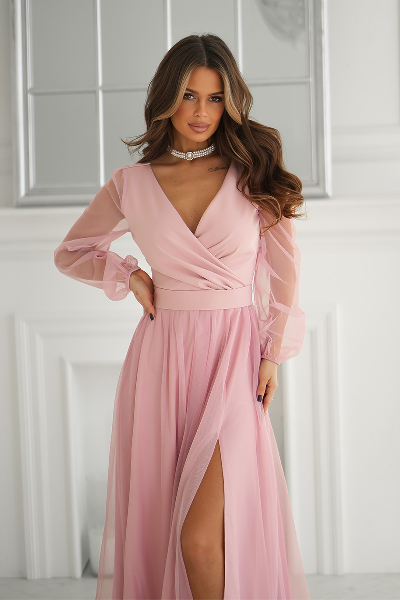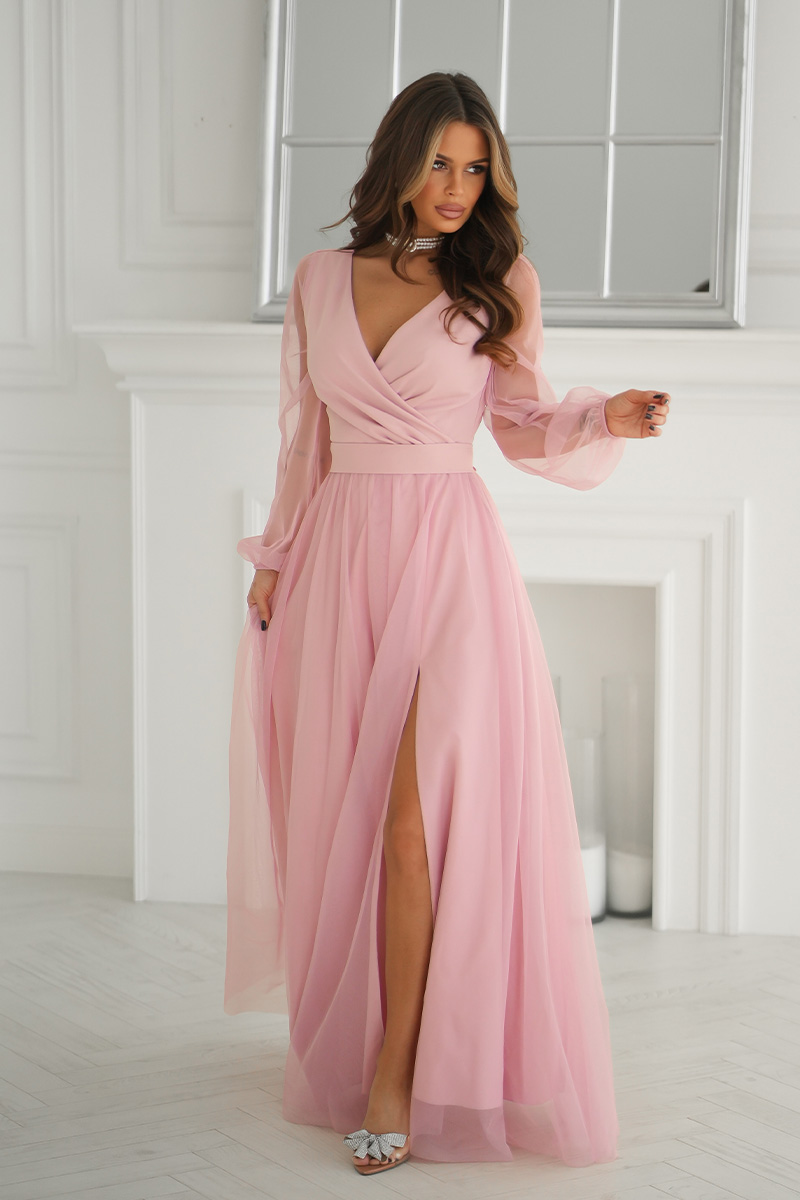 Ez a hosszú, nőies szabású ruha könnyed, légies anyagból készült, ami gyönyörűen követi az alak vonalait. A felsőrész finom, nőies dekoltázzsal rendelkezik, míg az alsó rész dupla rétegű, oldalsó sliccel díszített, amely elegáns bájt és játékosságot ad a ruhának. A csomaghoz tartozó övnek köszönhetően a derekadat egyénileg hangsúlyozhatod, így mindig a kívánt stílust alakíthatod ki. A ruha több, divatos színben elérhető, így könnyen megtalálhatod a személyiségedhez illőt.
