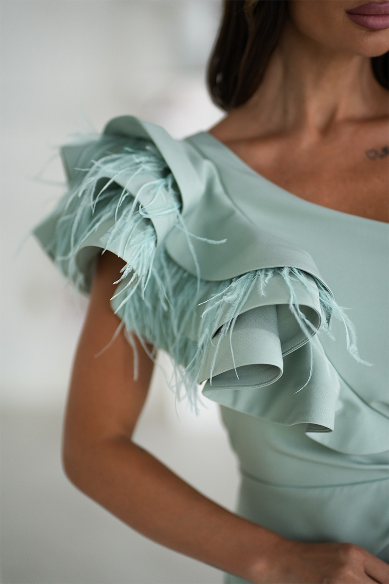 Ez a lenyűgöző, egyvállas alkalmi ruha igazi statement darab: rövid, modern szabásával, a vállat díszítő pihékkel és a finoman csillogó anyaggal azonnal magára vonzza a tekintetet. A fazon nőies, mégis különleges – a pihék különleges textúrát adnak, miközben a letisztult vonalvezetés elegáns összhatást teremt.
