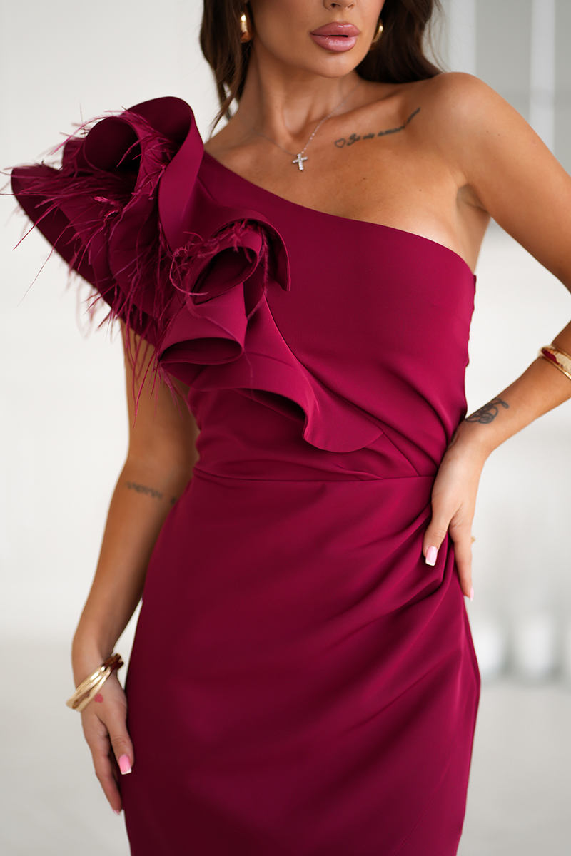 Ez a lenyűgöző, egyvállas alkalmi ruha igazi statement darab: rövid, modern szabásával, a vállat díszítő pihékkel és a finoman csillogó anyaggal azonnal magára vonzza a tekintetet. A fazon nőies, mégis különleges – a pihék különleges textúrát adnak, miközben a letisztult vonalvezetés elegáns összhatást teremt.