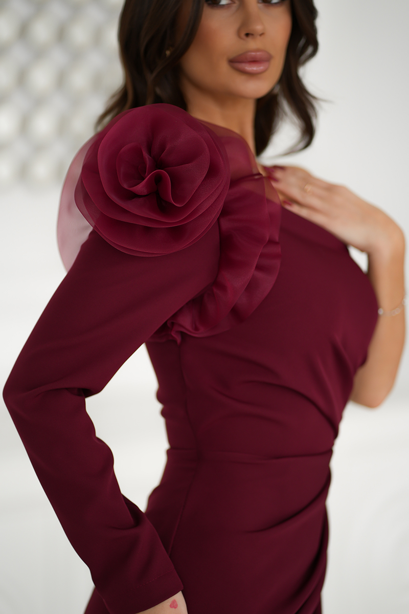 Bordó testhezálló ruha rózsadísszel a vállon