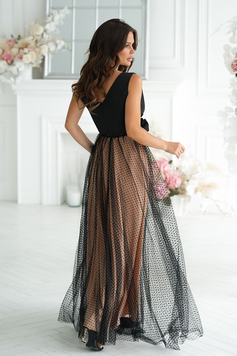 Ez a Bicotone hosszú ruha finoman lebbenő szabásával és különleges kialakításával ragadja meg a tekintetet. A lágy esésű anyag szépen követi az alak vonalát, a felsőrész pedig visszafogott, nőies kivágással indul. A kétszeres rétegű szoknya diszkrét combkivágással ad egy kis titokzatosságot minden lépéshez.