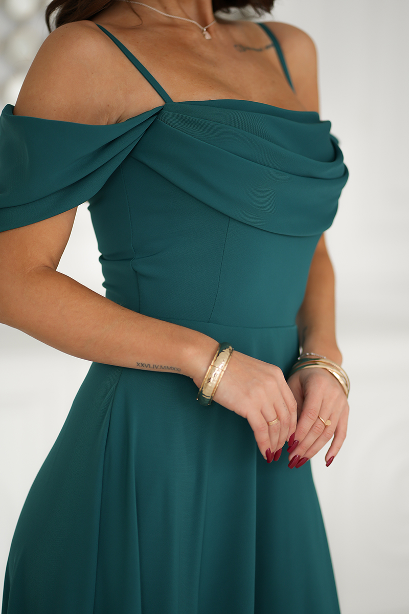 Elegáns ejtett vállú zöld ruha