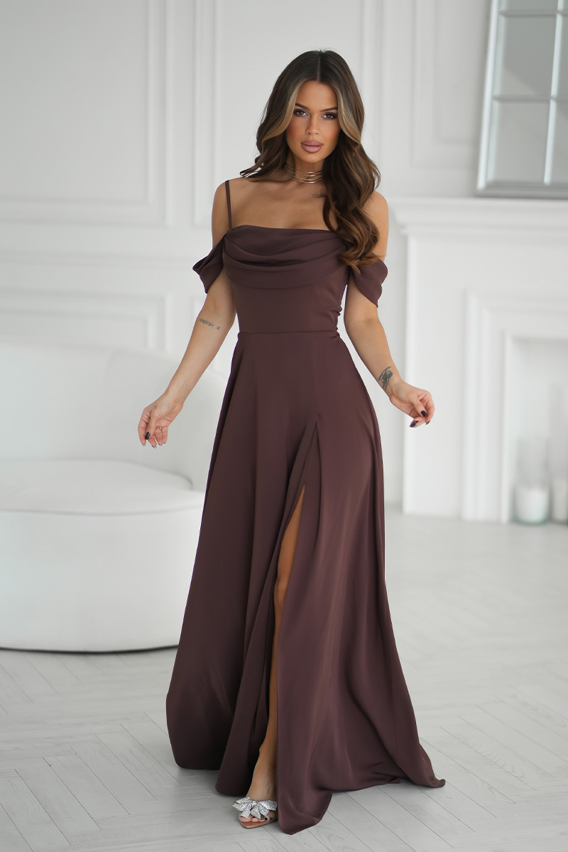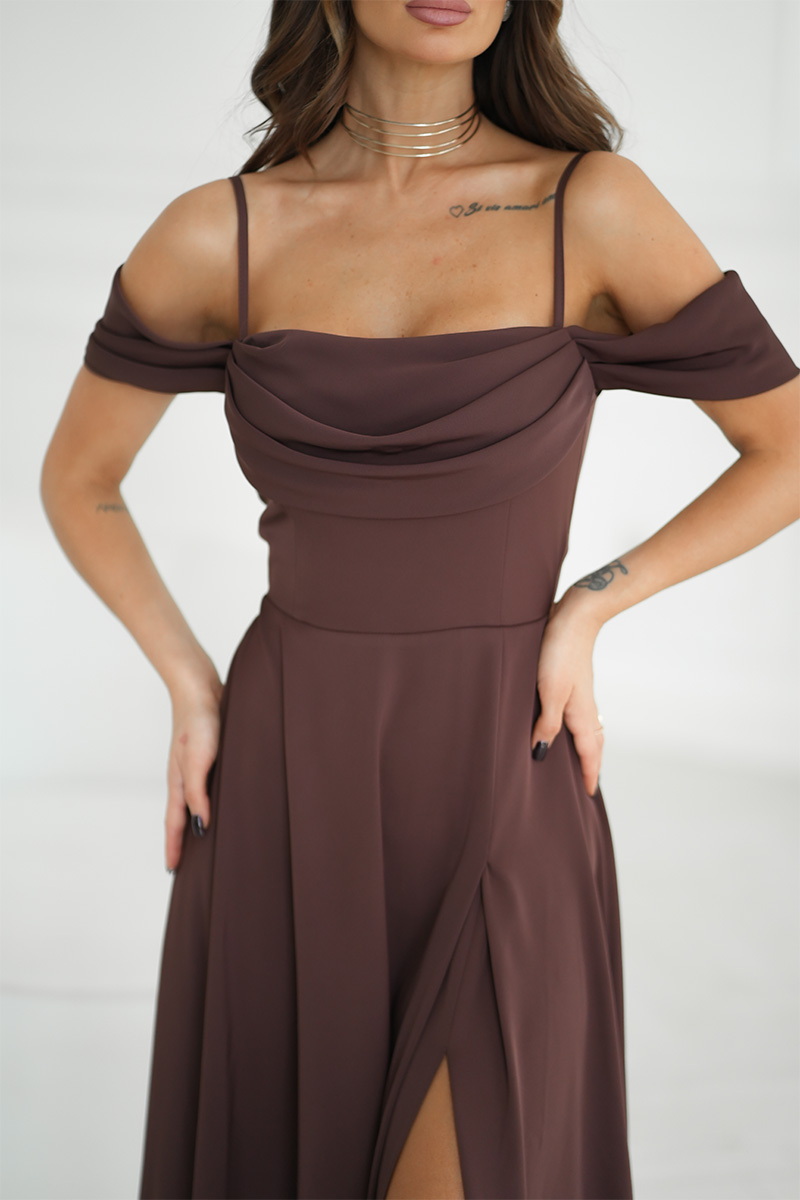 Elegáns ejtett vállú barna ruha