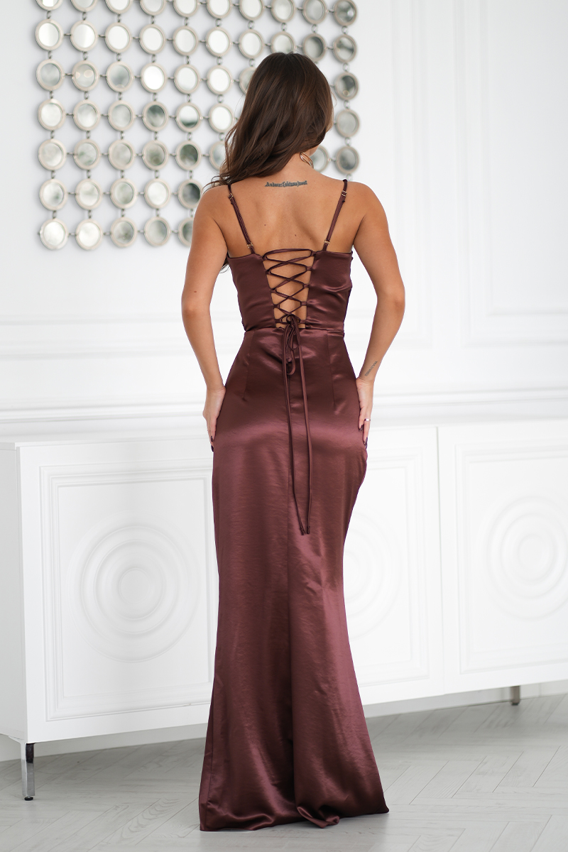 Hátul fűzős meggybarna szatén ruha