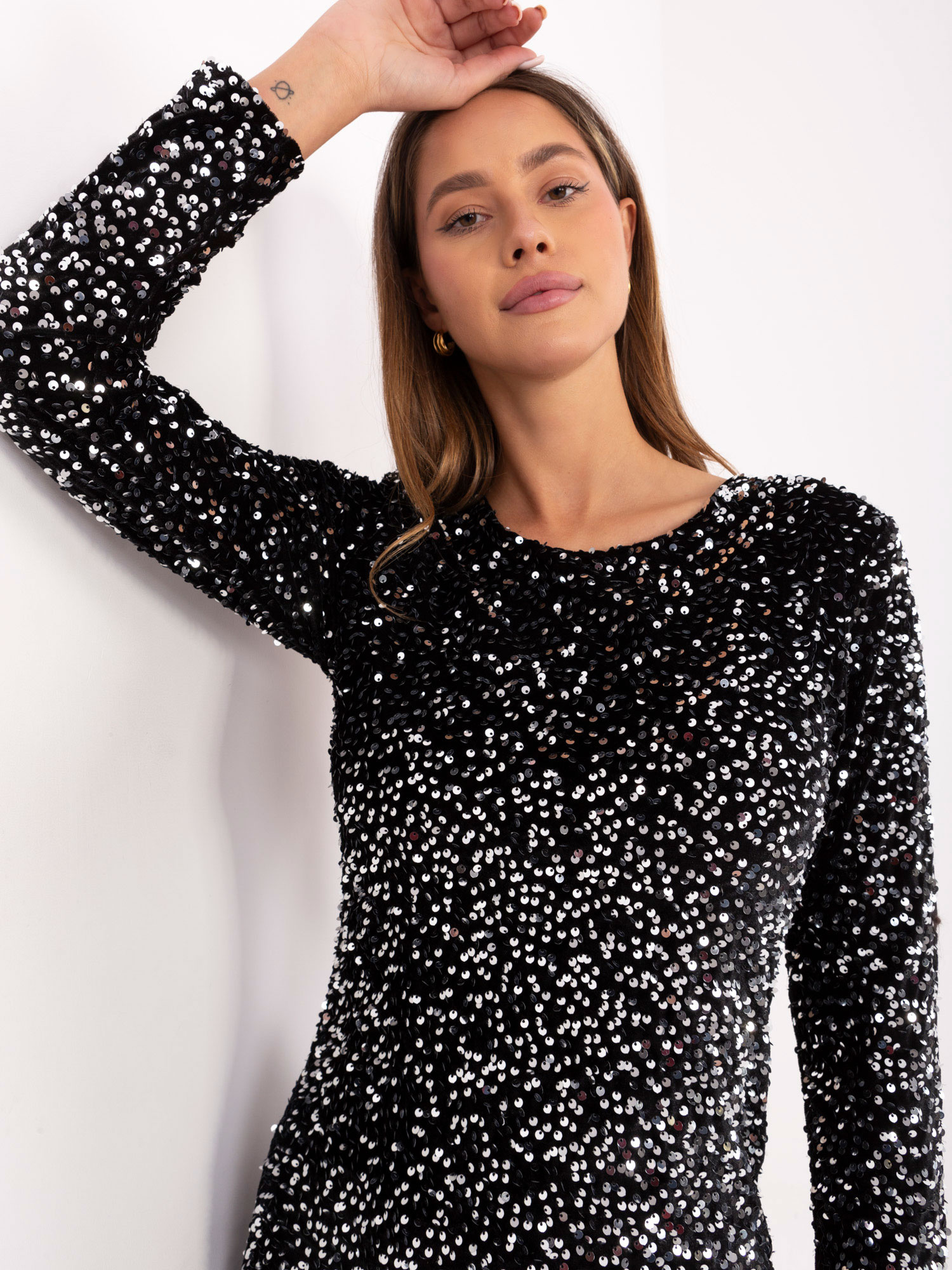 Ez az elegáns, aszimmetrikus szabású maxi ruha igazán különleges megjelenést biztosít alkalmi eseményekre és esti rendezvényekre. A hosszú fazon kifinomult, nőies hatást kelt, miközben az aszimmetrikus kialakítás modern és egyedi megjelenést ad a ruhának. A kerek nyakkivágás letisztult alapot teremt, amelyet a csillogó flitteres díszítés tesz igazán látványossá. A béléssel ellátott kivitel kényelmes viseletet biztosít, a puha viszkóz alapanyag pedig kellemes tapintású, jól eső érzetet nyújt viselés közben. Záródás nélküli kialakítása praktikus, az összhatás pedig elegáns és magabiztos.