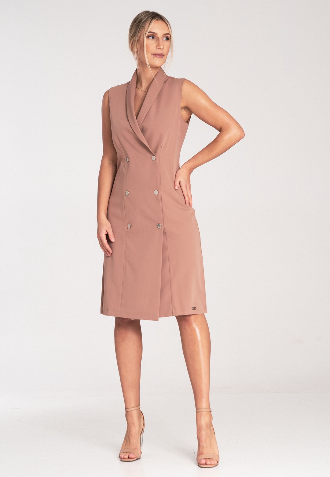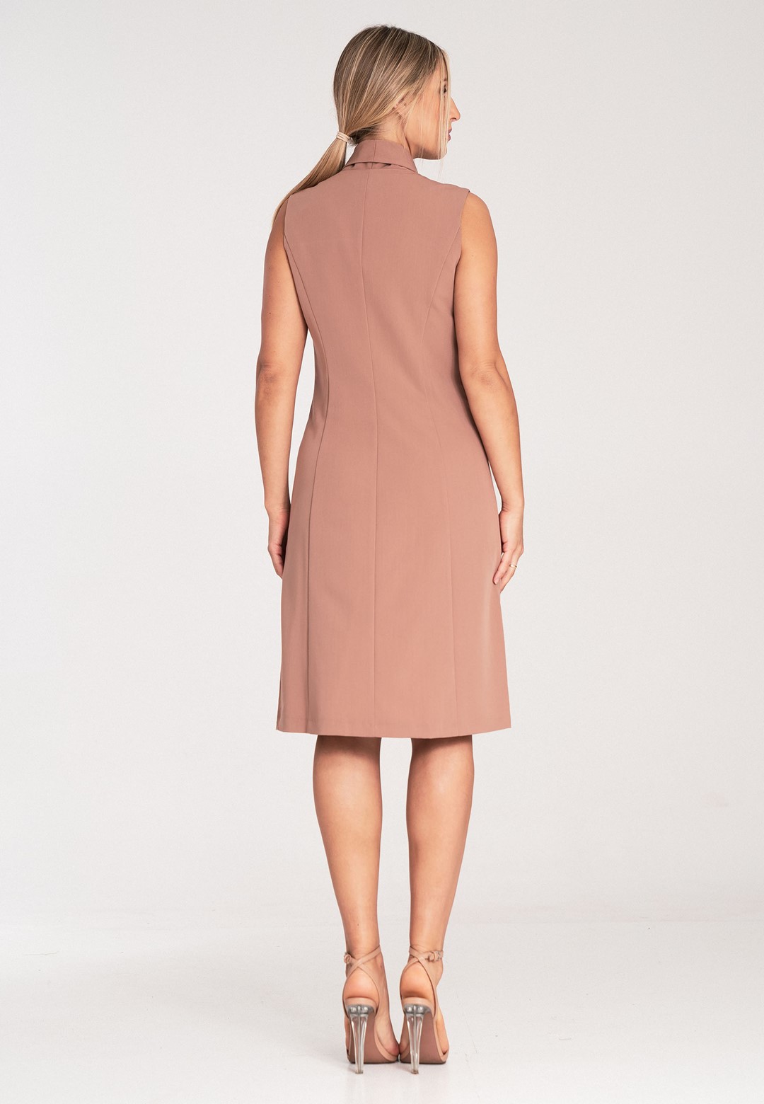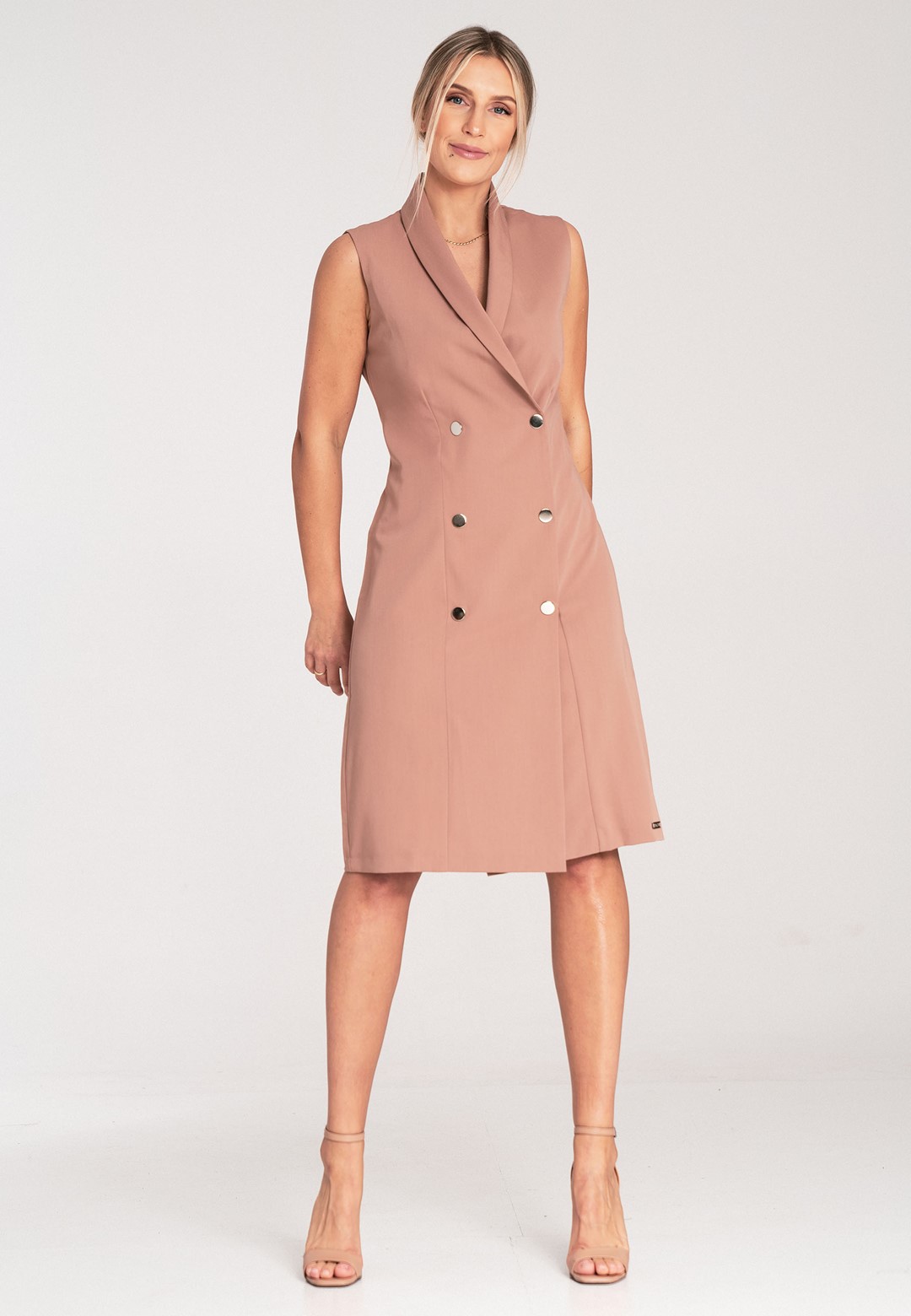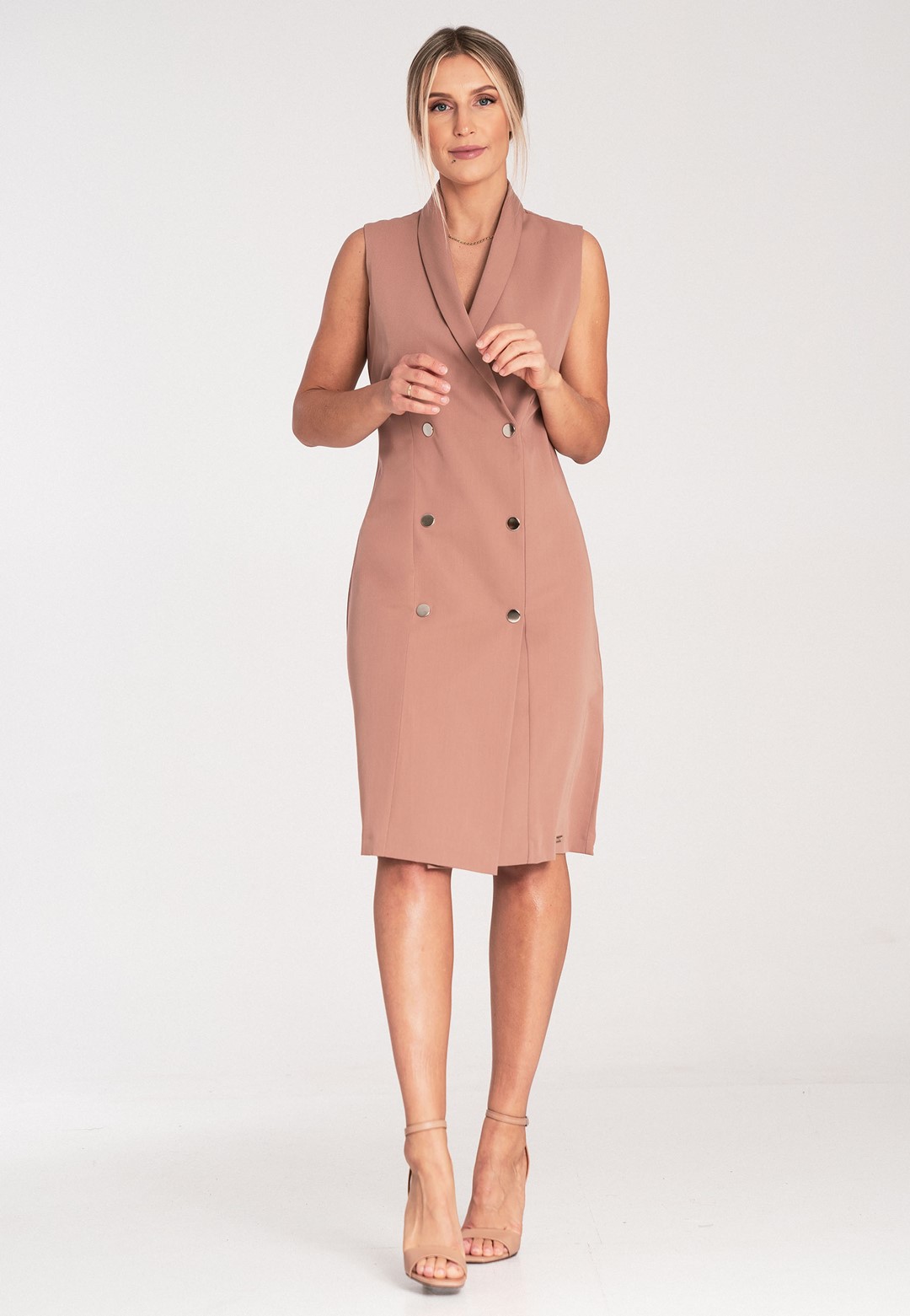 Ez az elegáns, ujjatlan midi ruha kifinomult és modern megjelenést biztosít. Az elöl kialakított keskeny hajtókák és az átlapolt, V-alakú dekolt karakteres, mégis nőies vonalvezetést adnak a modellnek. A kétsoros záródás nagyméretű, díszes patentokkal különleges, exkluzív részletként emeli ki az összhatást.