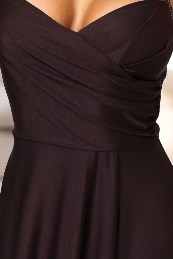 A vékony vállpántos felsőrész keresztbe omló, redőzött kialakítású, amely finoman formálja a dekoltázst és szépen kiemeli a vállak vonalát. A derékhangsúlyos szabás után a ruha hosszú, lágy esésű szoknyában folytatódik, amely mozgás közben elegánsan lebeg és optikailag nyújtja az alakot – különösen magassarkúval.