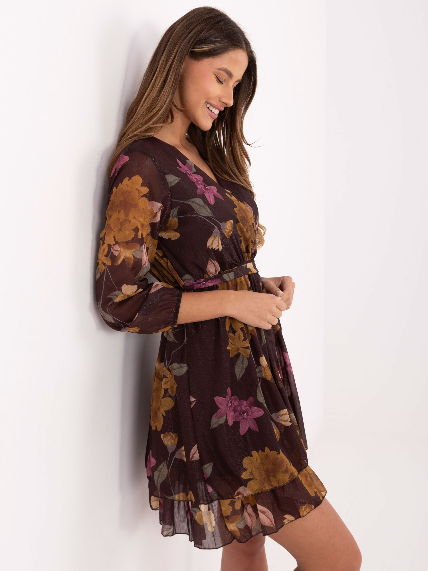 Barna virágmintás mini ruha