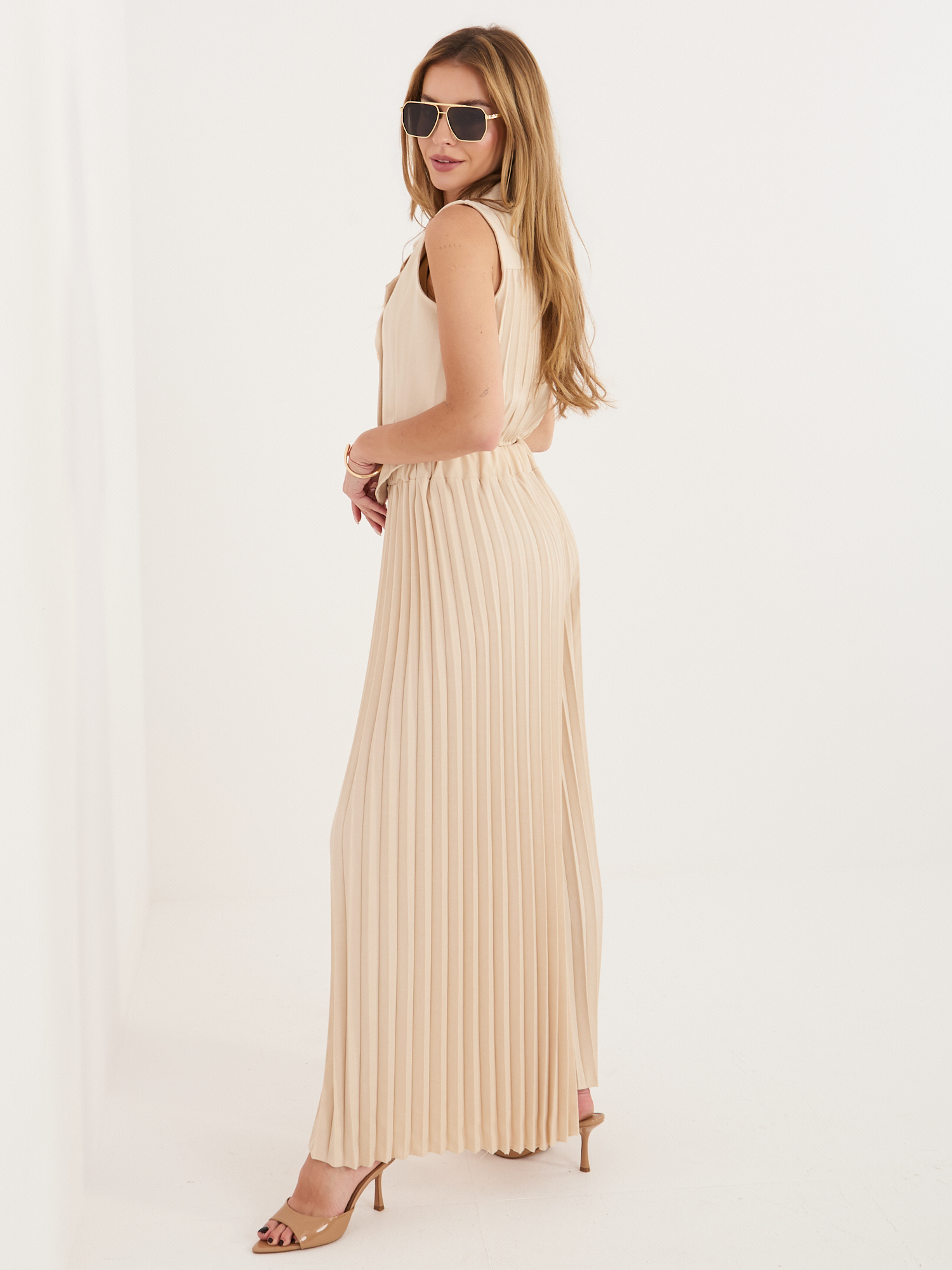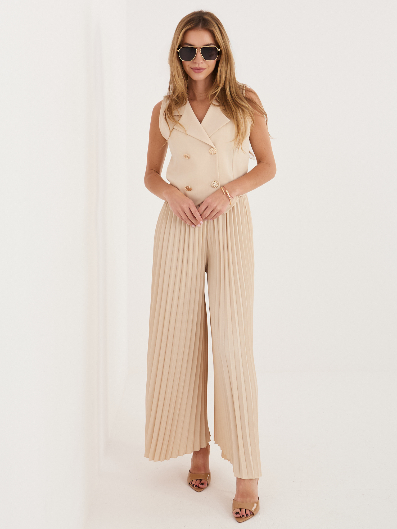 Az Italy Moda mellény és nadrág szettje modern eleganciát és letisztult nőiességet képvisel, amely tökéletes választás a mindennapokra, munkába vagy akár alkalmi eseményekre is. Az ujjatlan, galléros mellény dupla gombsoros kialakítása karakteres, mégis kifinomult megjelenést ad, miközben szépen kiemeli a felsőtest vonalát. A hozzá illő nadrág harmonikusan egészíti ki az összhatást, letisztult szabásával és kényelmes viseletével egyaránt stílusos és praktikus darab. Ez a szett magabiztos, ápolt megjelenést biztosít, és könnyedén beilleszthető egy elegáns, modern gardróbba.