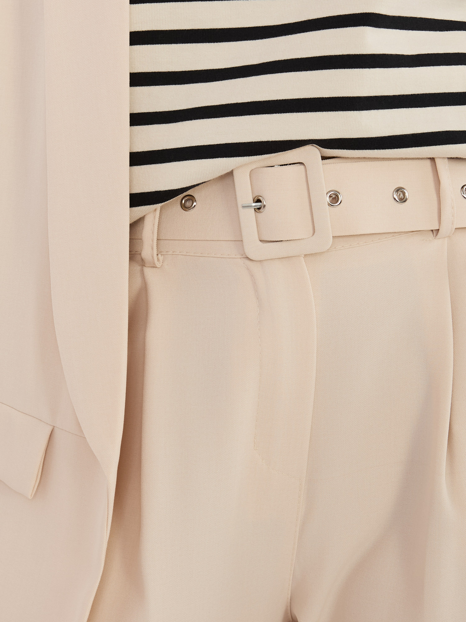 A nadrág magas derekú szabású, szűkülő szárú kialakítással készült, amely modern és elegáns megjelenést biztosít. A 7/8 hossz praktikus és divatos, így könnyen kombinálható magassarkúval vagy elegáns cipővel. Az oldalzsebek kényelmes viseletet biztosítanak, a ráncolt részletek pedig karaktert adnak a modellnek.