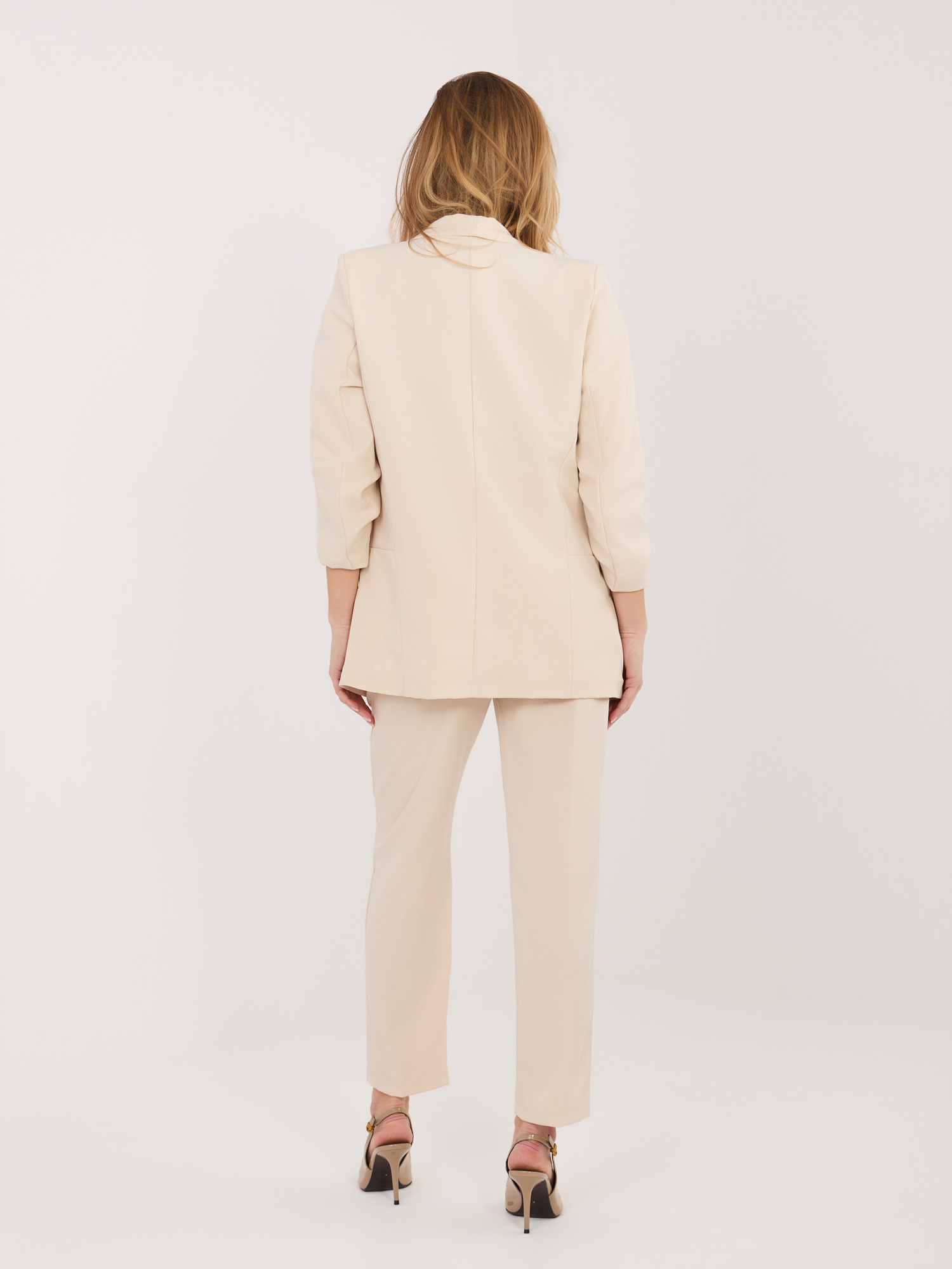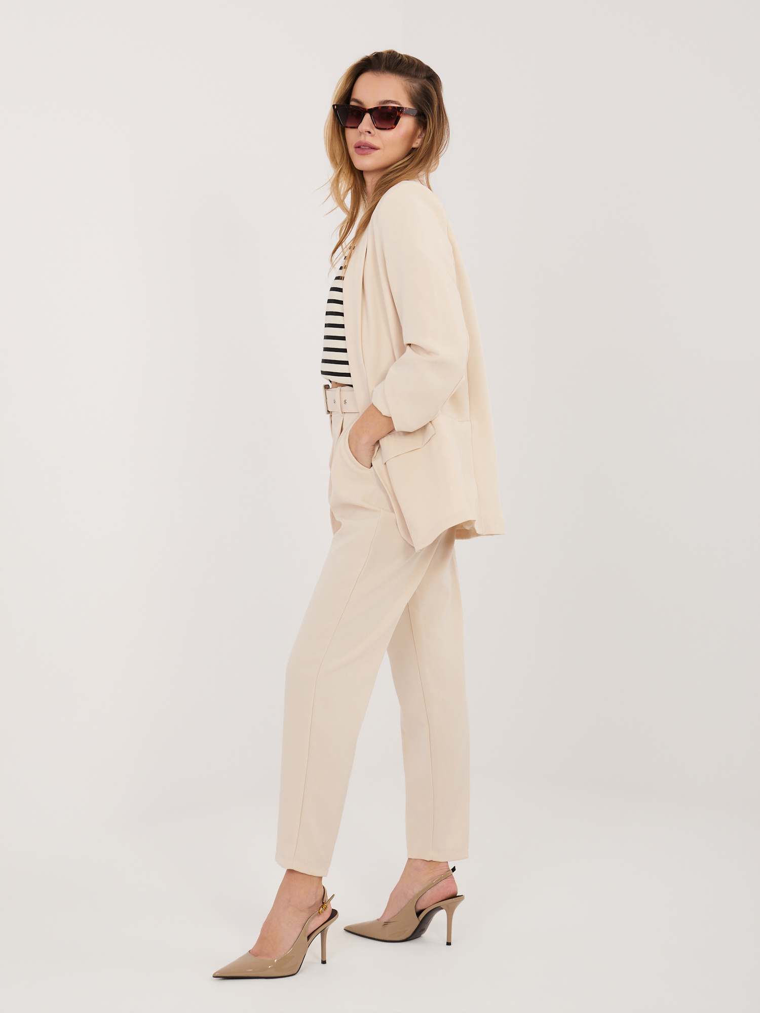 A RUE PARIS elegáns nadrágkosztüm stílusos és sokoldalú választás, amely ideális mindennapi, munkahelyi vagy alkalmi megjelenéshez. A hosszított fazonú blézer letisztult vonalvezetésű, a deréknál elhelyezett öv pedig kiemeli a sziluettet és nőies formát ad az összhatásnak.