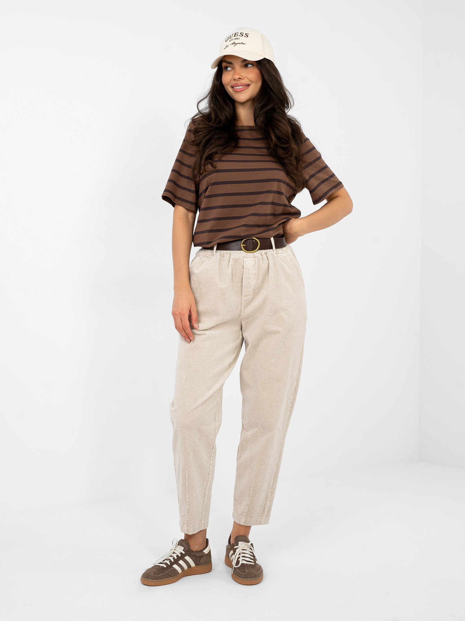 Ez a nadrág kényelmes és modern választás a hétköznapokra és munkába egyaránt. A magas derekú kialakítás szépen formálja a derékvonalat, miközben komfortos viseletet biztosít egész nap. A lefelé szűkülő szár és a 7/8-os hossz divatos, letisztult megjelenést ad, amely sportos és nőies szettekhez is jól illeszkedik. Az oldalzsebek praktikusak, a nadrághoz tartozó öv pedig tovább hangsúlyozza az alakot. A pamut alapanyag elasztánnal kiegészítve rugalmas, kellemes tapintású és jól alkalmazkodik a mozgáshoz.