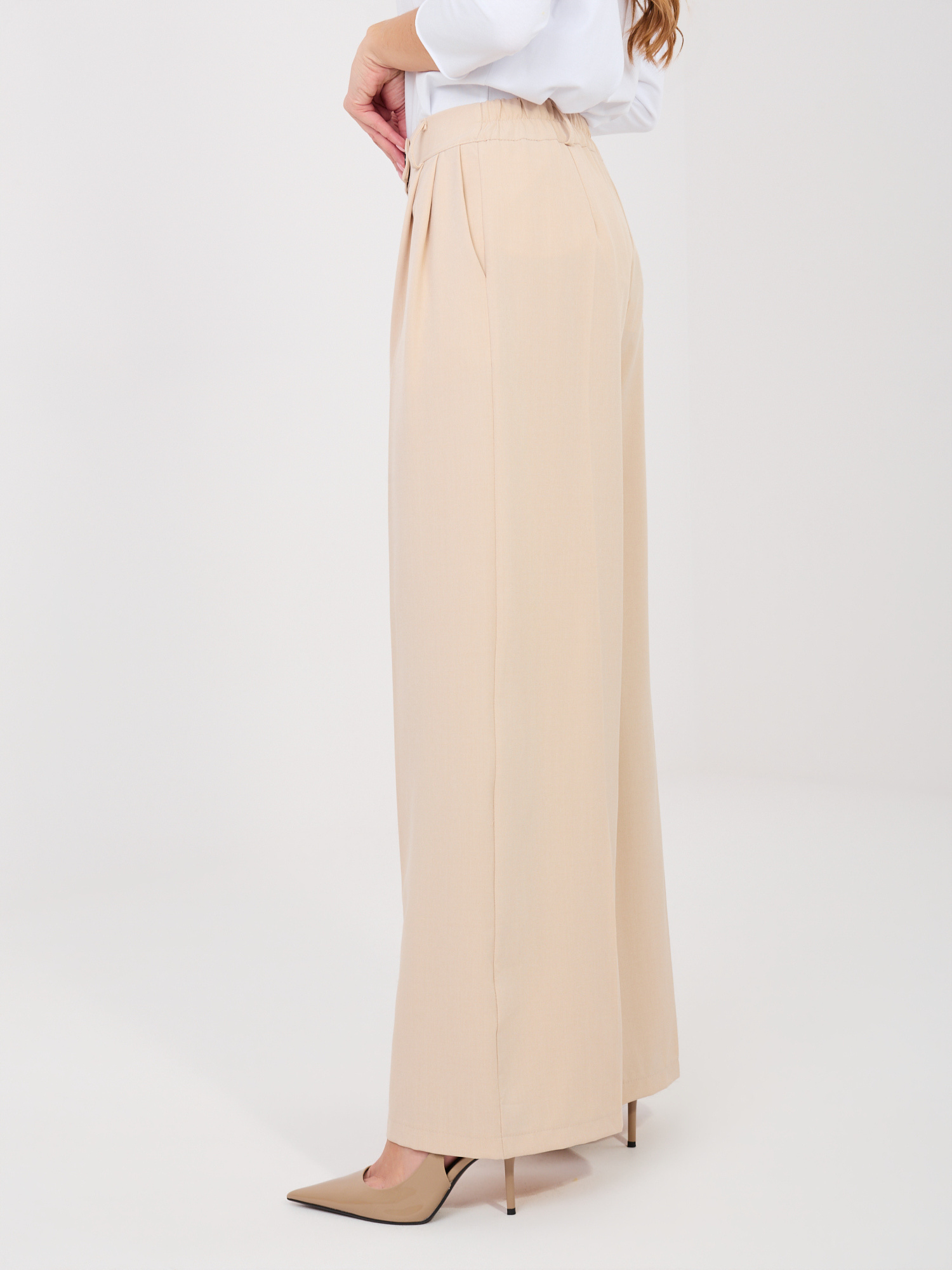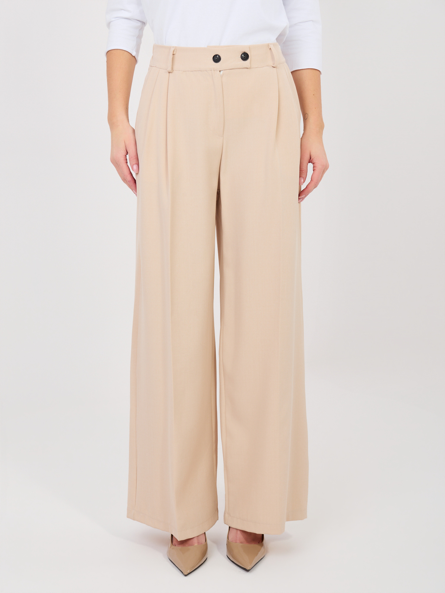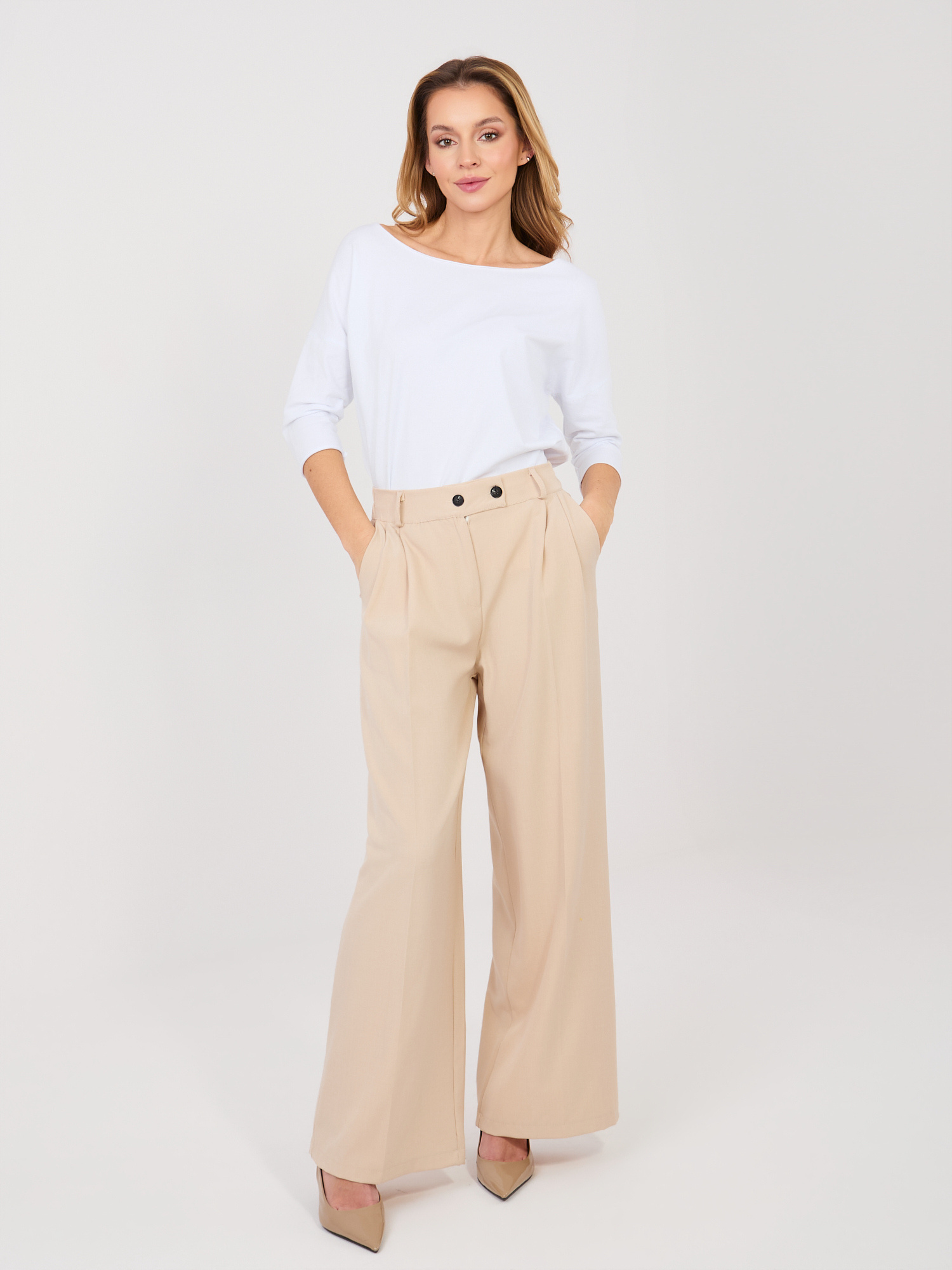 Az oldalzsebek praktikusak, a cipzáras és gombos záródás pedig stabil illeszkedést biztosít. A hosszú, bő szár elegáns esést ad a nadrágnak, így blúzzal, inggel vagy blézerrel kombinálva kifinomult összhatást teremt.