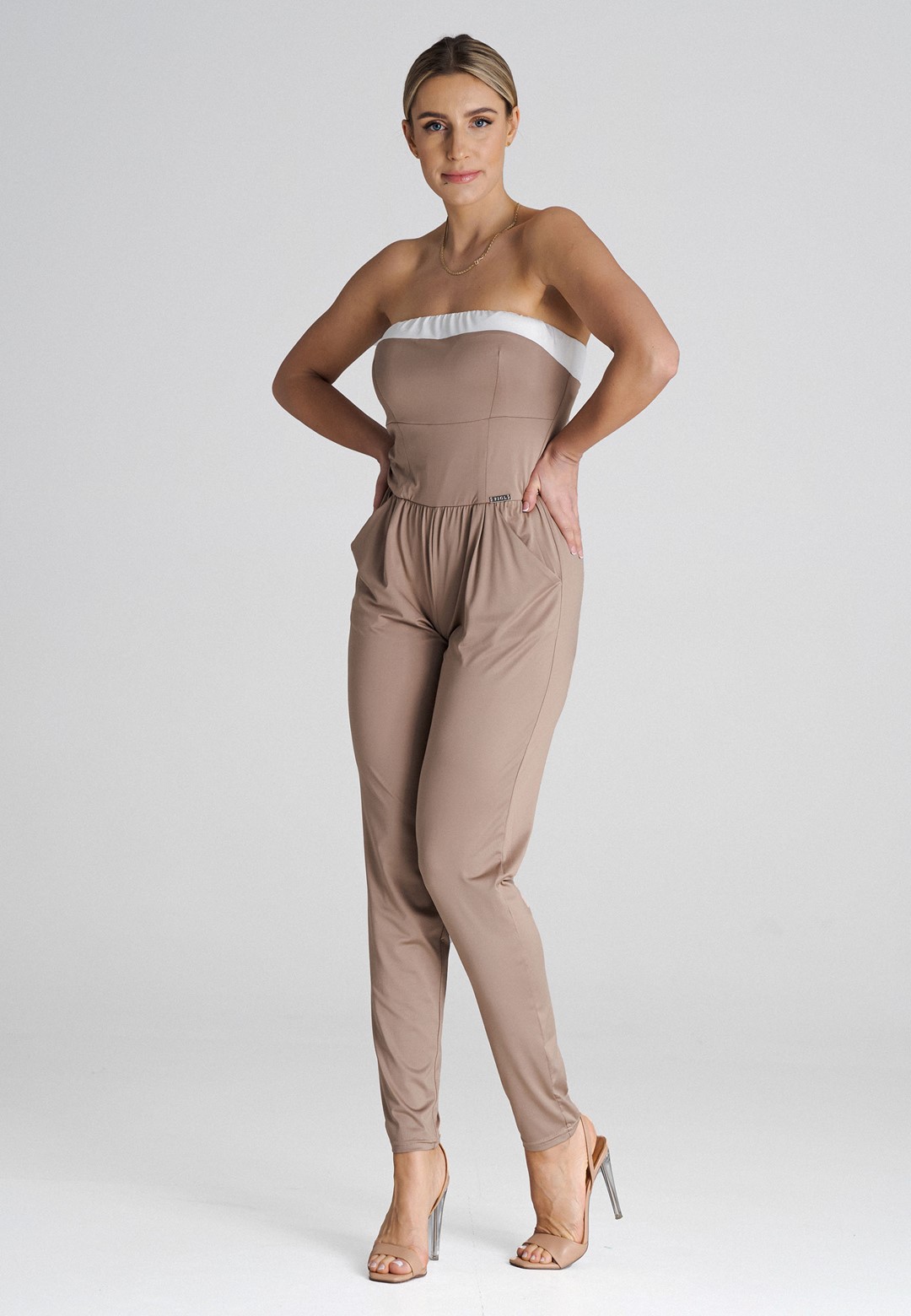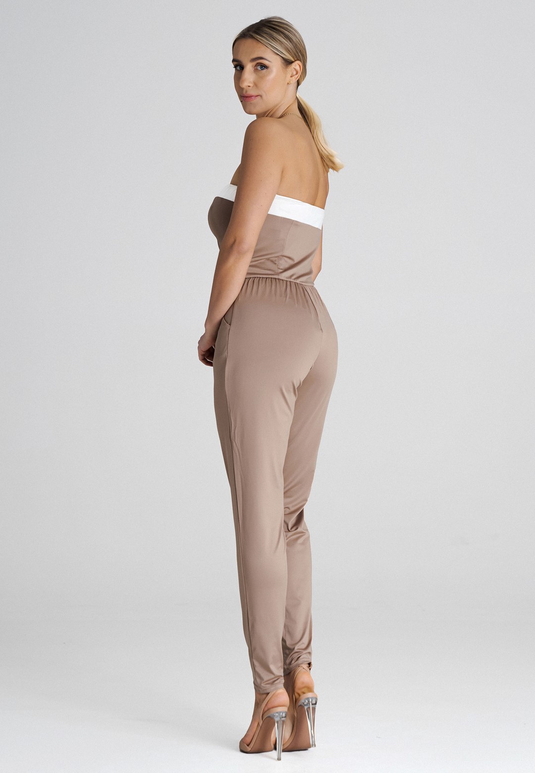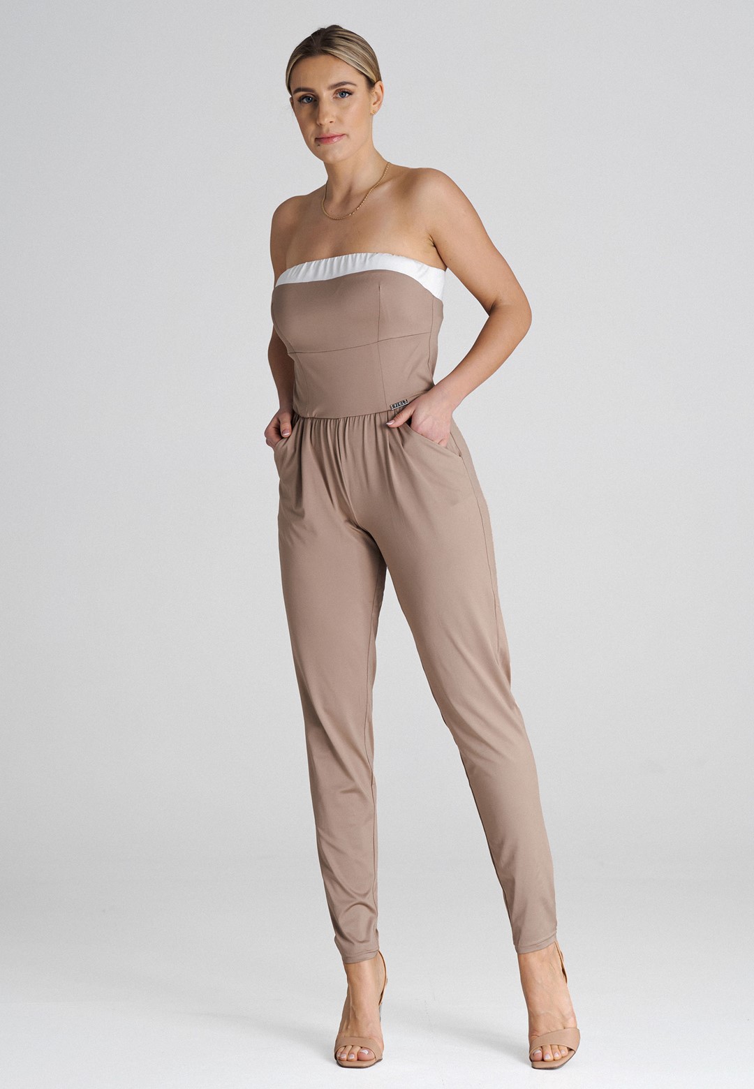 Ez a laza szabású, klasszikus fazonú overál elegáns és modern megjelenést biztosít egész évben. A pánt nélküli felsőrész letisztult, nőies vonalvezetésű, amelyet egy kontrasztos betét tesz különlegessé és karakteressé. Az alsórész hosszú szárú kialakítása optikailag nyújtja az alakot, míg a dekoratív ráncolások finoman formálják a sziluettet és egyedi részletként emelik ki a modellt.