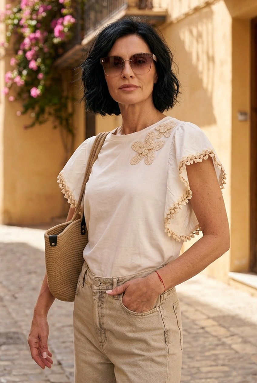 Az Italy Moda hétköznapi blúza letisztult, mégis nőies darab, amely könnyed eleganciát visz a mindennapi megjelenésbe. Az egyszerű szabásvonalat a finom applikáció teszi különlegessé, amely visszafogott, mégis stílusos részletként jelenik meg. A rövid ujjú kialakítás és a kerek nyakkivágás kényelmes, harmonikus összhatást biztosít, míg a pamut alapú, enyhén rugalmas anyag kellemes viseletet nyújt egész nap. Ez a blúz ideális választás, ha egy könnyen kombinálható, mégis karakteres alapdarabot keresel.