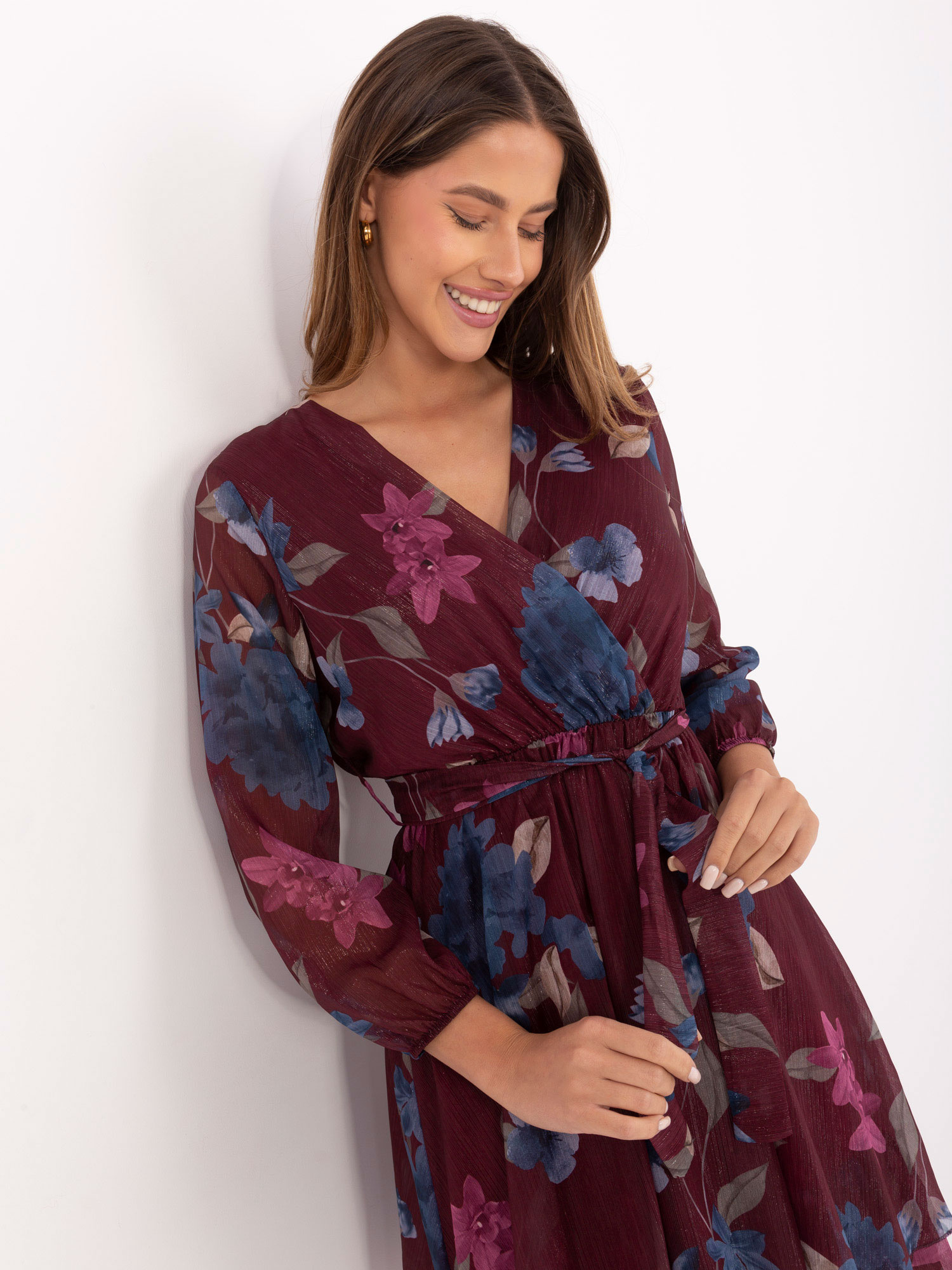 Ez a kényelmes, hétköznapi ruha könnyed, A-vonalú fazonjával és virágmintás kialakításával igazán nőies megjelenést ad. Az átlapolt dekoltázs finoman kiemeli a felsőtestet, míg a hosszú ujj és a mellékelt öv extra eleganciát és szabályozhatóságot nyújt. A ruha puha, enyhén rugalmas anyagból készült, teljes béléssel, így komfortos viselet akár egész napra. Ideális választás hétköznapokra, munkába vagy könnyed alkalmi eseményekre.