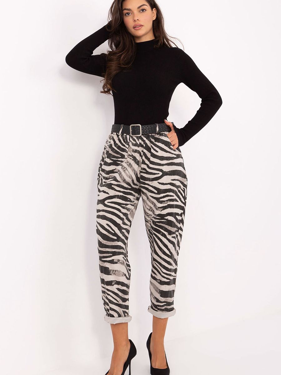 Az ITALY MODA nadrágja a kényelmes casual stílust képviseli, amely tökéletes választás a mindennapokra. Állatmintás kialakítása divatos és karakteres megjelenést biztosít. Magas derekú fazonja kiemeli a nőies vonalakat, a szűkített szár pedig modern, letisztult hatást kelt. Oldalzsebekkel és övvel kiegészítve praktikus és stílusos viselet, amely könnyen kombinálható különböző felsőkkel. Anyagösszetétele: 77% viszkóz, 20% poliészter és 3% elasztán – így puha, rugalmas és kényelmes a mindennapi használat során.