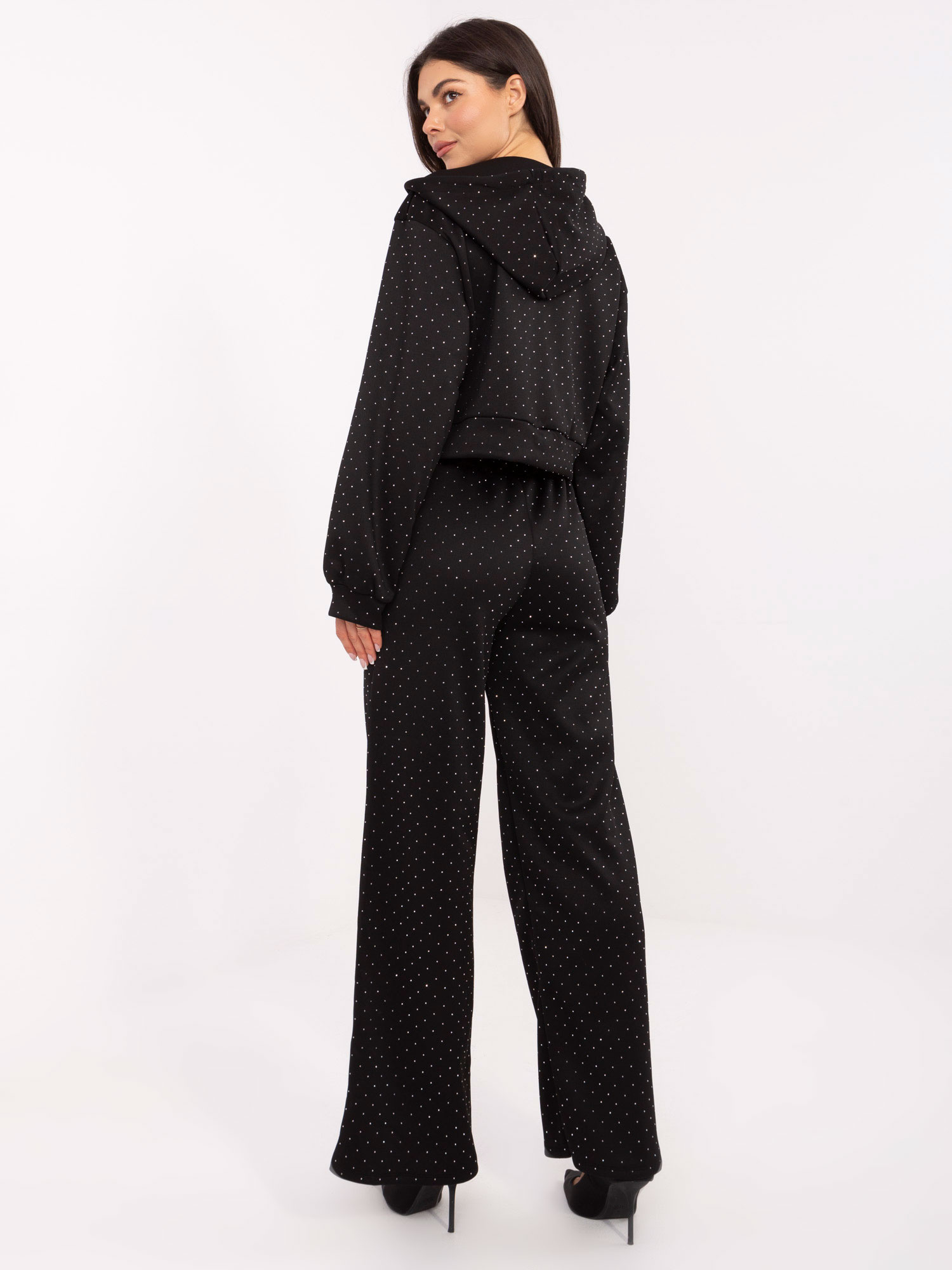 A RUE PARIS elegáns női melegítőszett tökéletes választás mindennapi viseletre, ha szereted az egyedi, nőies kényelmet. A szett díszített, enyhén fényes anyaga és apró részletei – mint a díszkövek és a húzózsinóros kapucni – elegáns megjelenést kölcsönöznek. A felső rövid, modern fazonú, míg a nadrág magas derekú, széles szárú és oldalán zsebekkel készült, így egyszerre divatos és kényelmes.