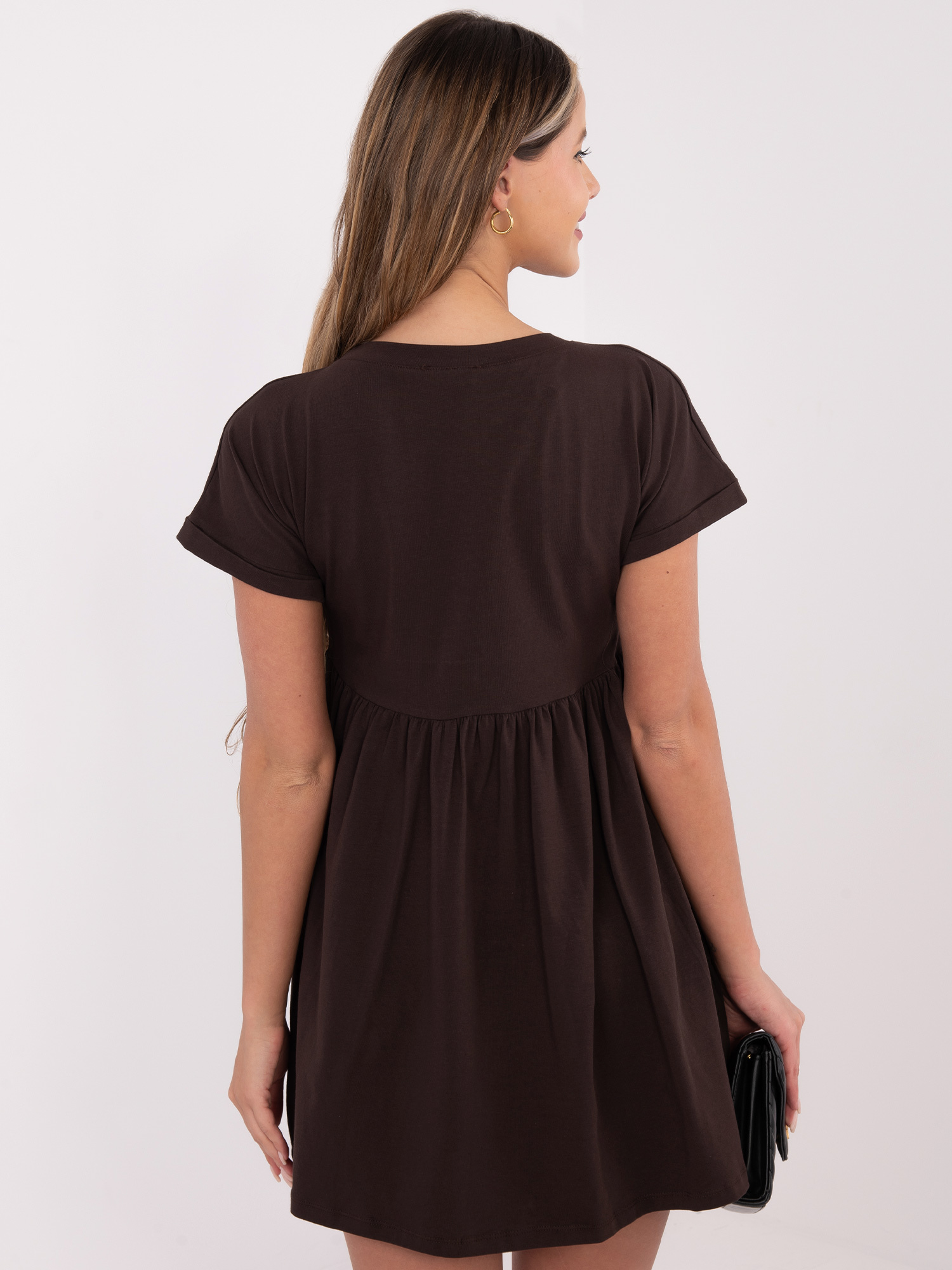 Ez a könnyed, nyári hangulatú ruha ideális választás a hétköznapi viselethez. A bővülő, enyhén A vonalú fazon kényelmes mozgást biztosít, miközben nőies megjelenést kölcsönöz. A rövid ujjak és a finom ráncolások játékos részletekkel gazdagítják az összhatást. A puha tapintású, rugalmas pamut–elasztán anyag kellemes viseletet nyújt melegebb napokon is, így ez a ruha remek választás városi sétához, munkába vagy hétköznapi programokra.
