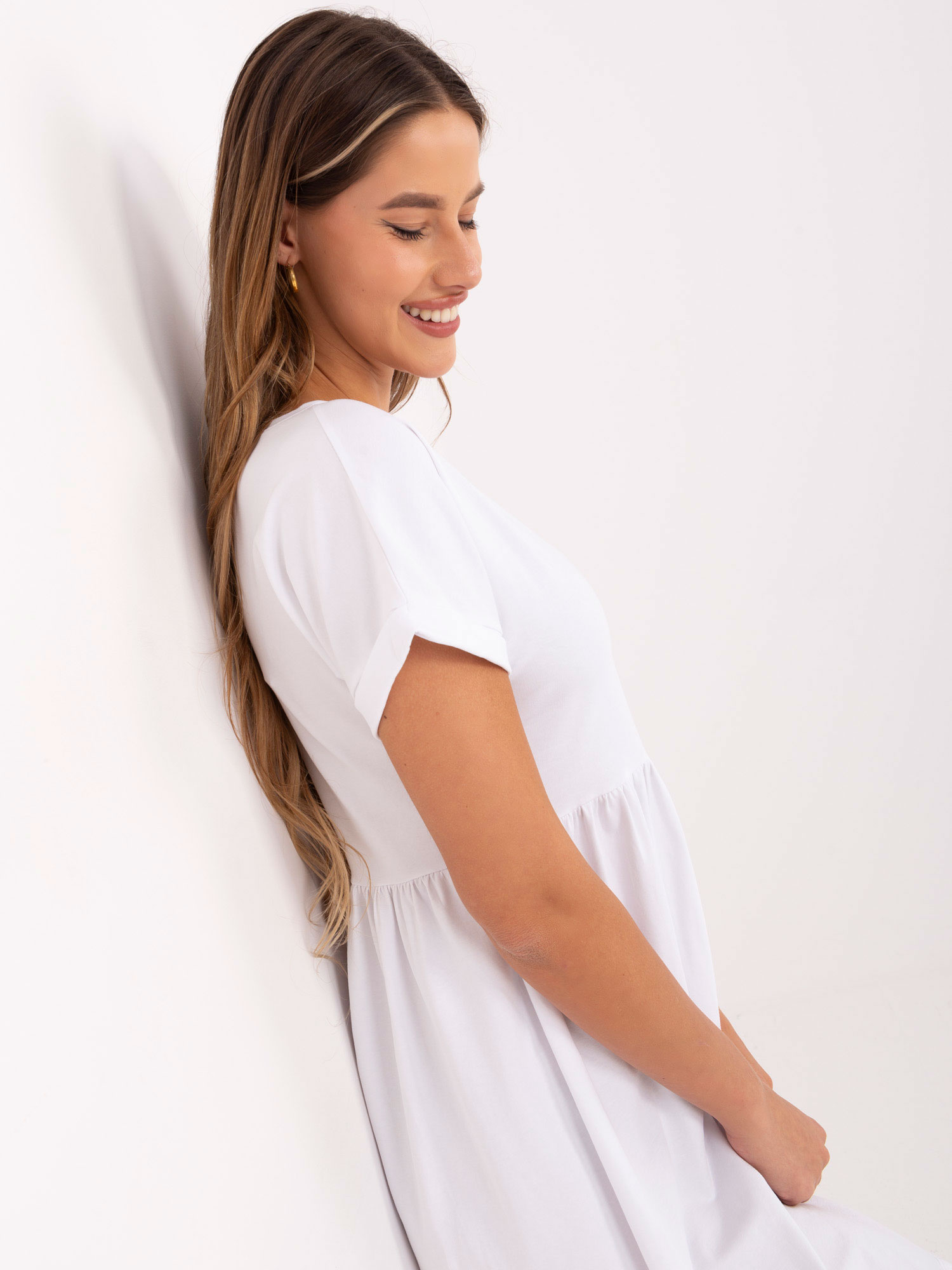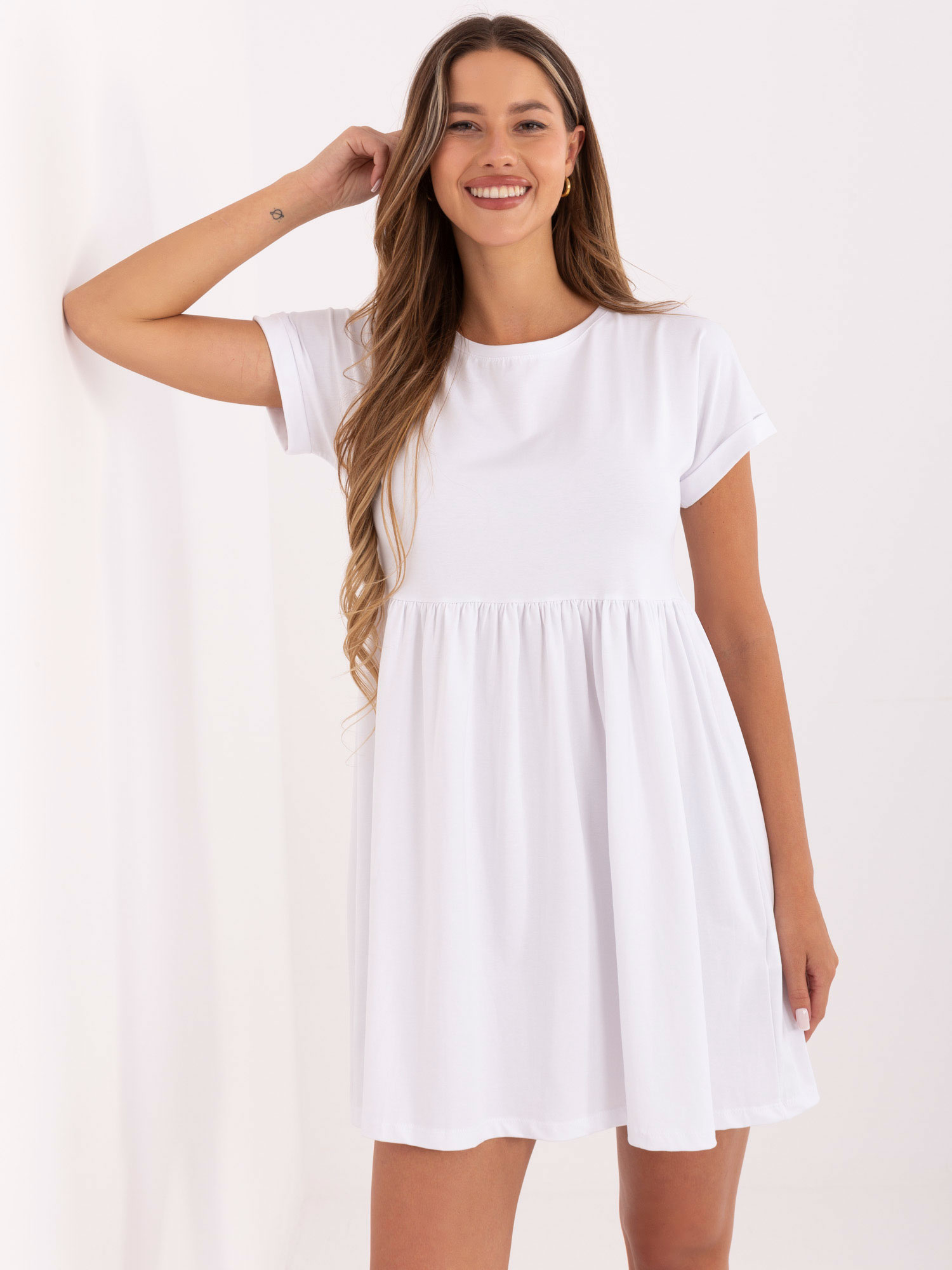 Ez a könnyed, nyári hangulatú ruha ideális választás a hétköznapi viselethez. A bővülő, enyhén A vonalú fazon kényelmes mozgást biztosít, miközben nőies megjelenést kölcsönöz. A rövid ujjak és a finom ráncolások játékos részletekkel gazdagítják az összhatást. A puha tapintású, rugalmas pamut–elasztán anyag kellemes viseletet nyújt melegebb napokon is, így ez a ruha remek választás városi sétához, munkába vagy hétköznapi programokra.