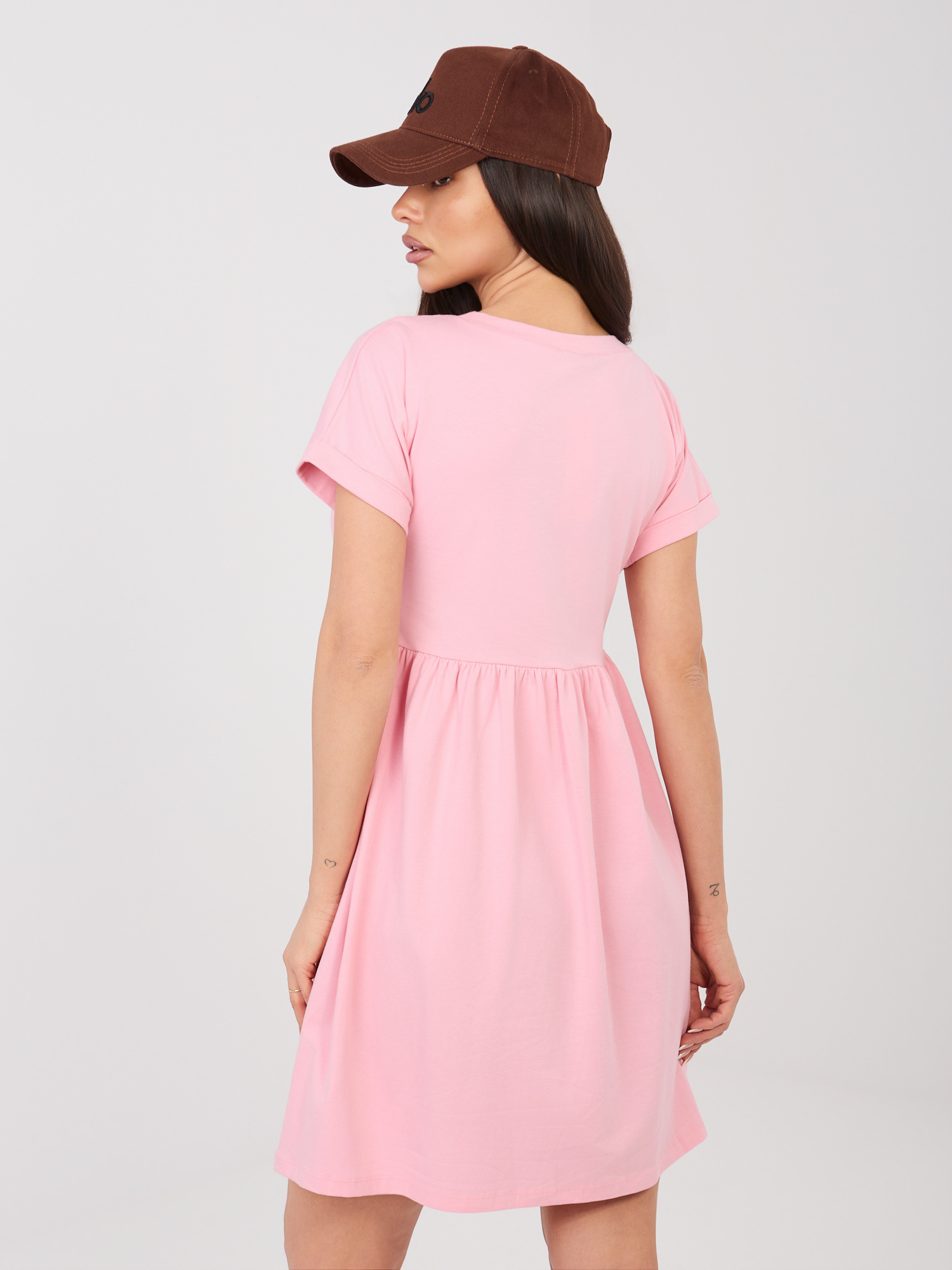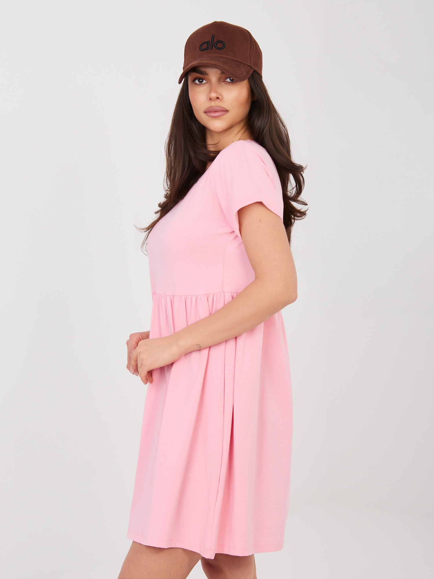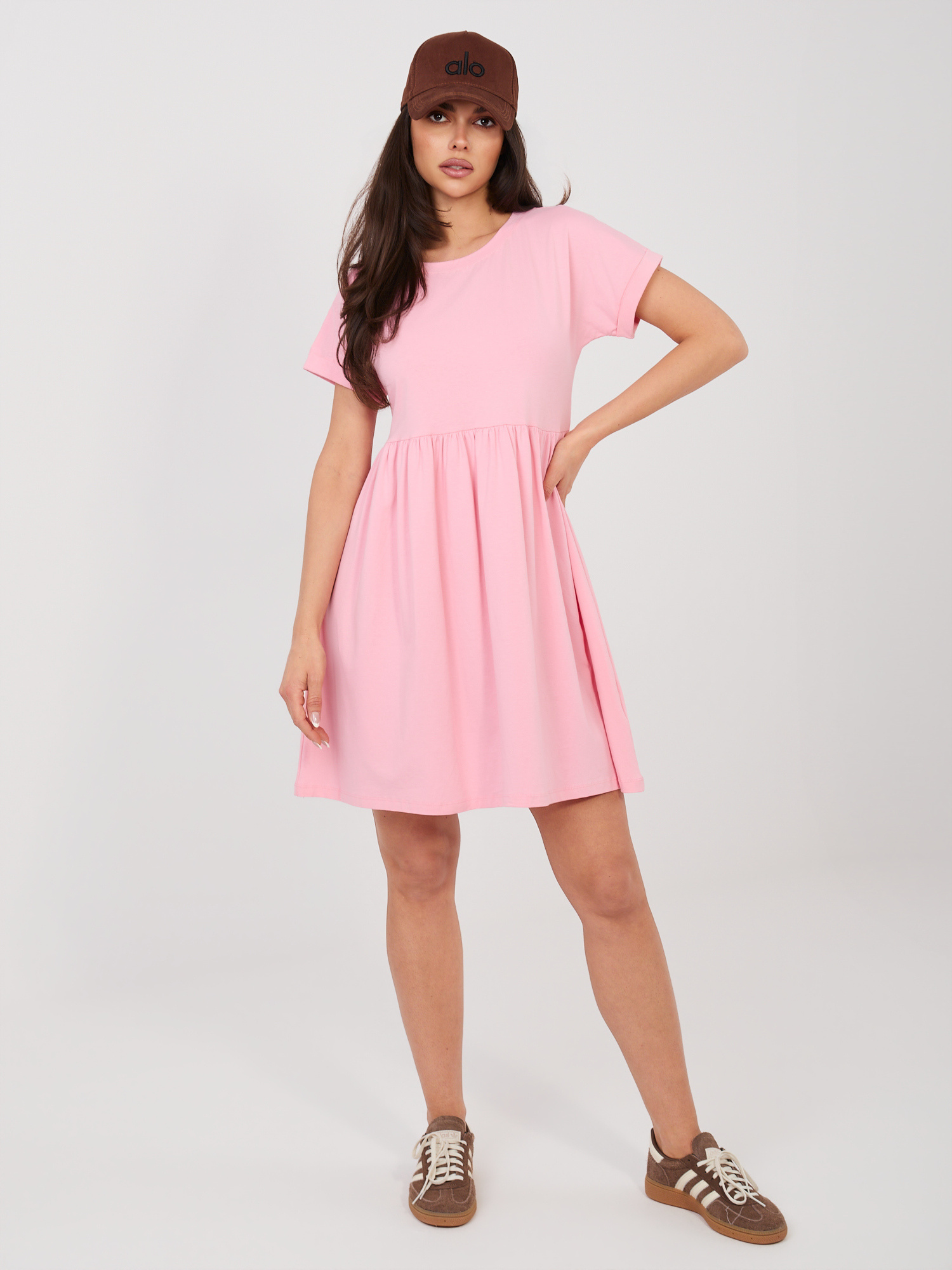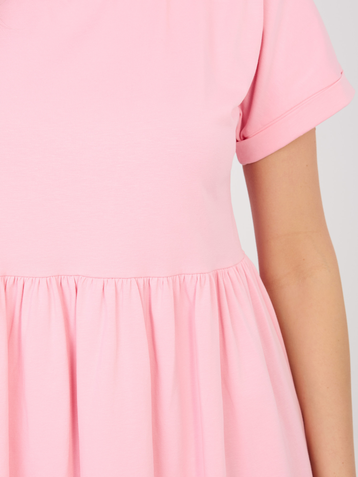 Ez a könnyed, nyári hangulatú ruha ideális választás a hétköznapi viselethez. A bővülő, enyhén A vonalú fazon kényelmes mozgást biztosít, miközben nőies megjelenést kölcsönöz. A rövid ujjak és a finom ráncolások játékos részletekkel gazdagítják az összhatást. A puha tapintású, rugalmas pamut–elasztán anyag kellemes viseletet nyújt melegebb napokon is, így ez a ruha remek választás városi sétához, munkába vagy hétköznapi programokra.