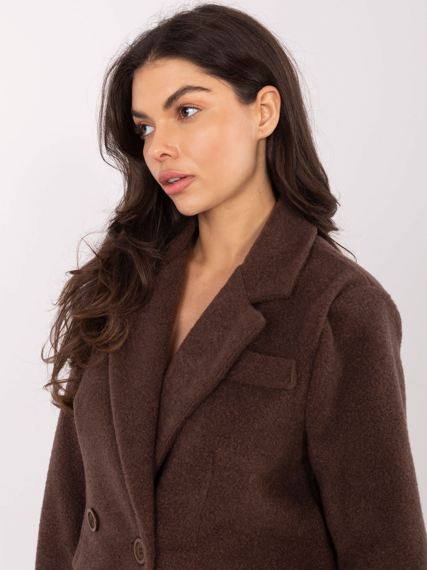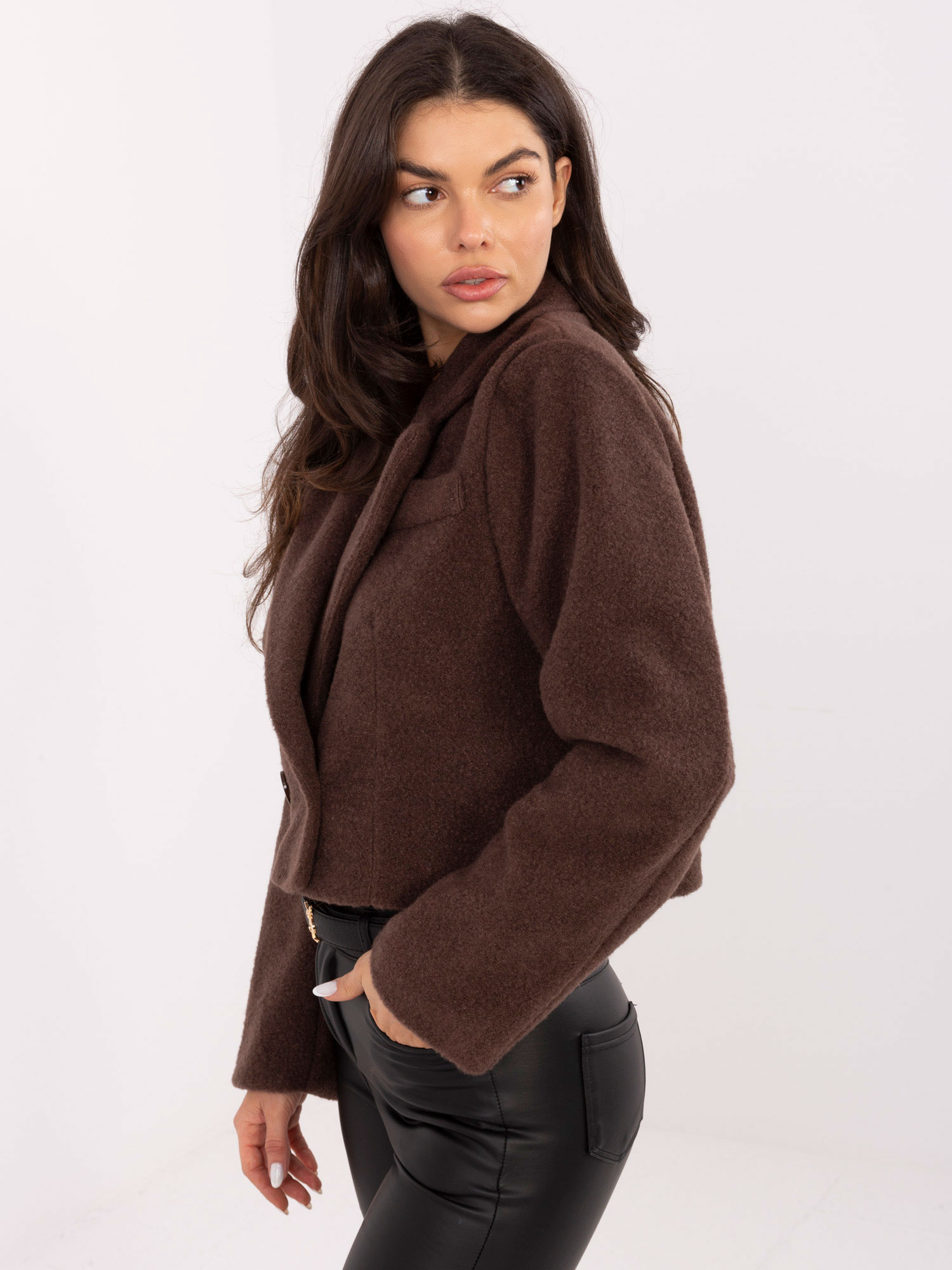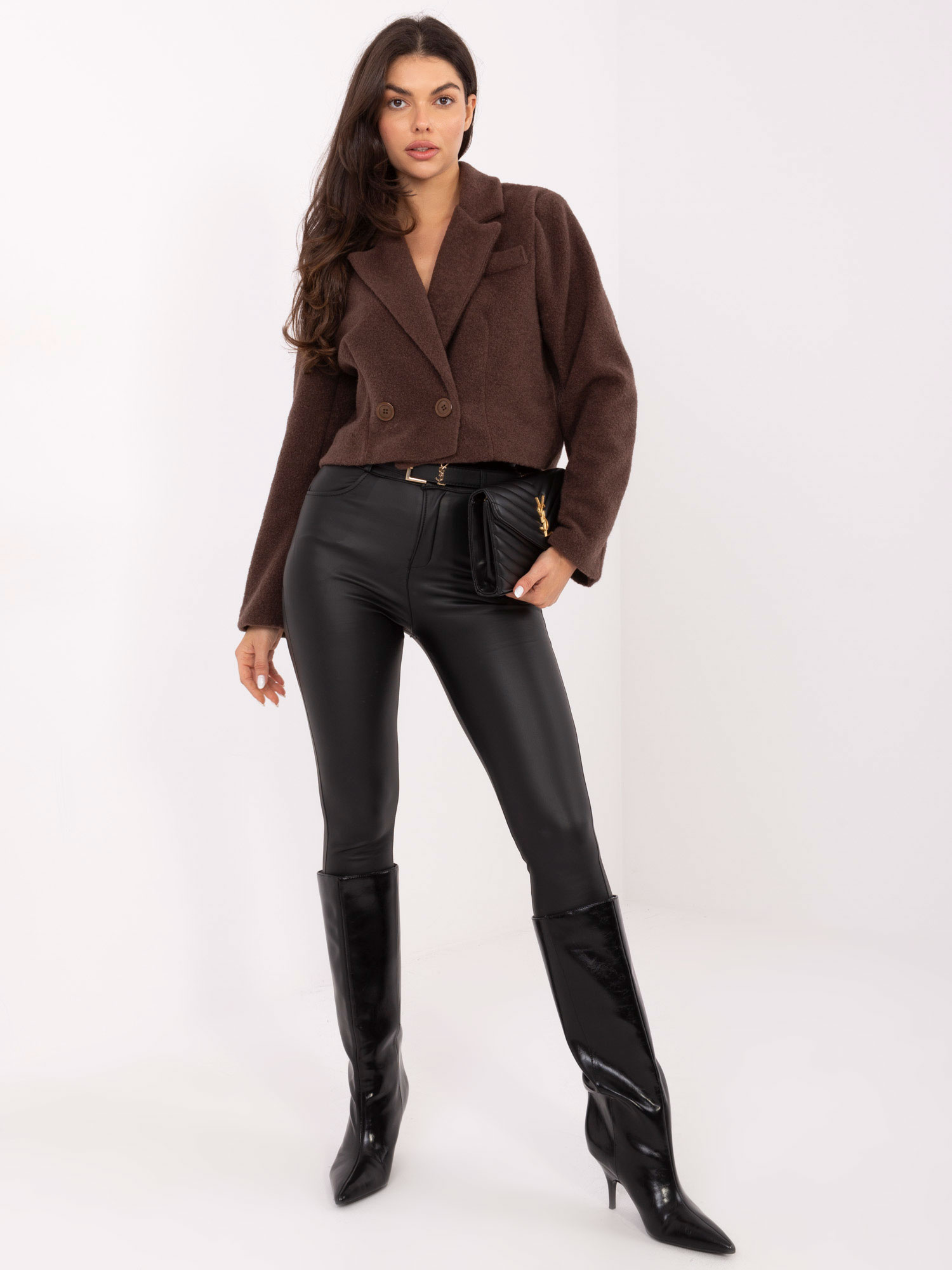 Elegáns, bélelt, kétsoros gombolású rövid kabát, amely minden összeállításnak stílust és kifinomultságot ad.