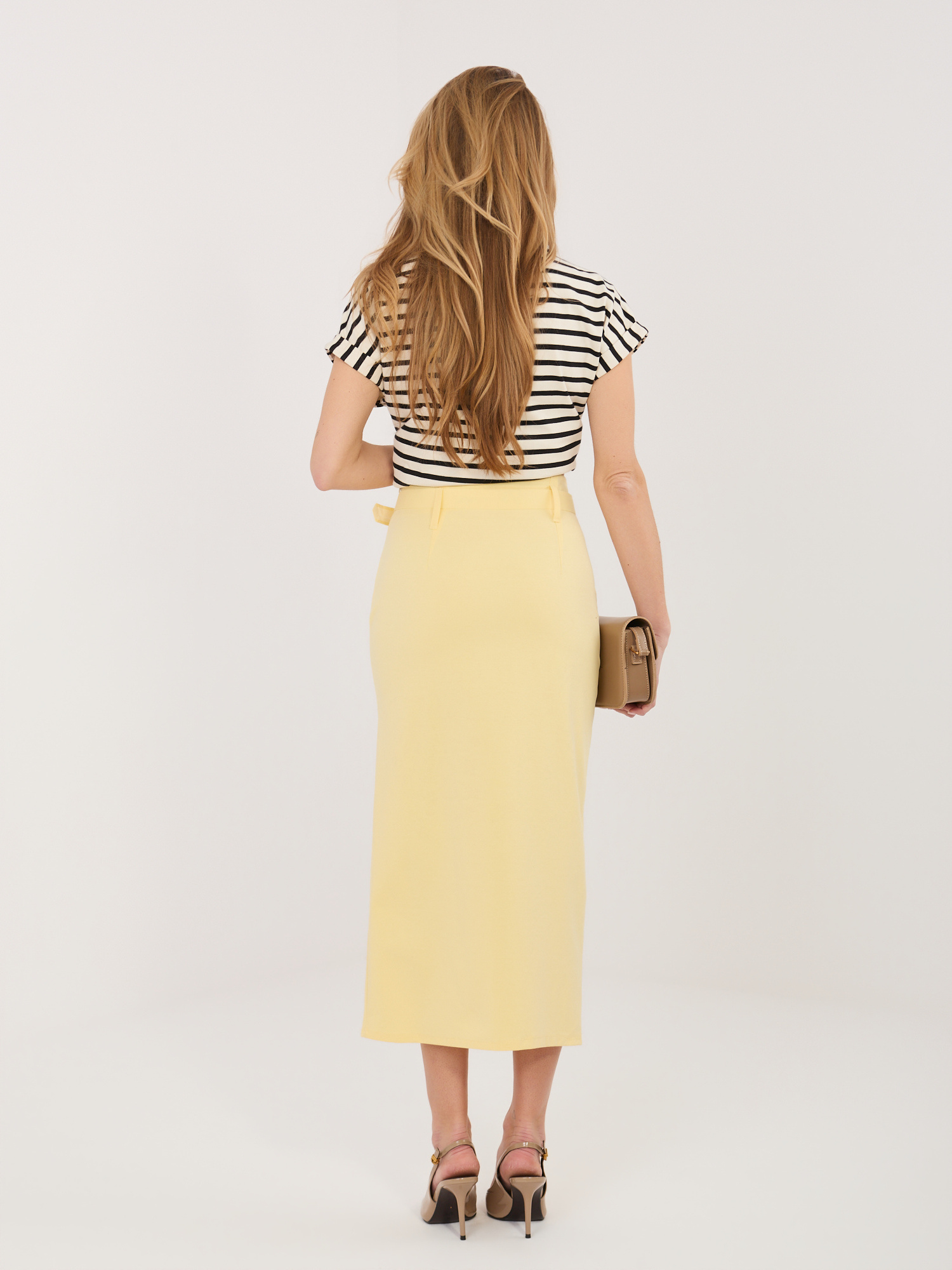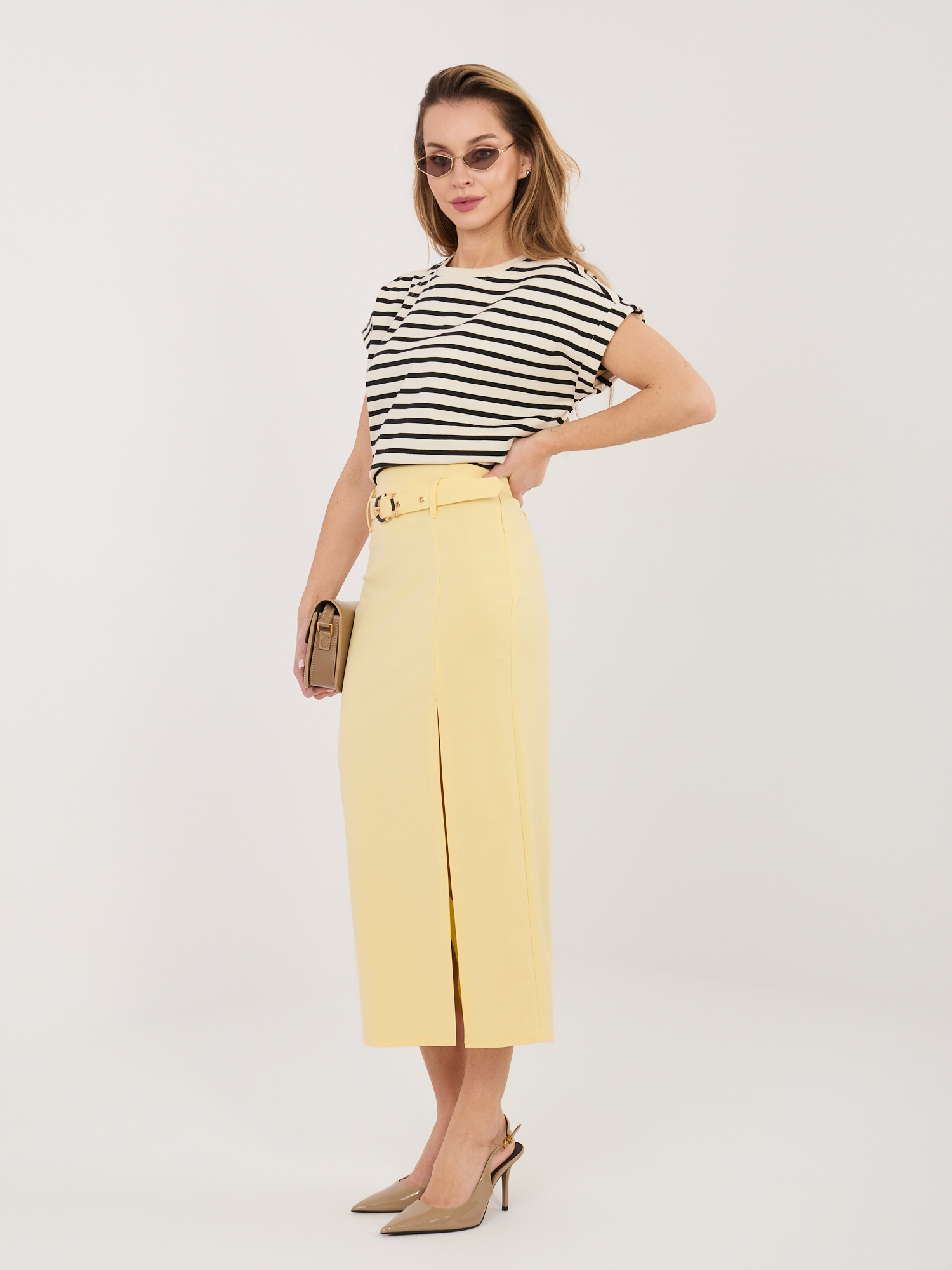 Elegáns sárga midi szoknya övvel