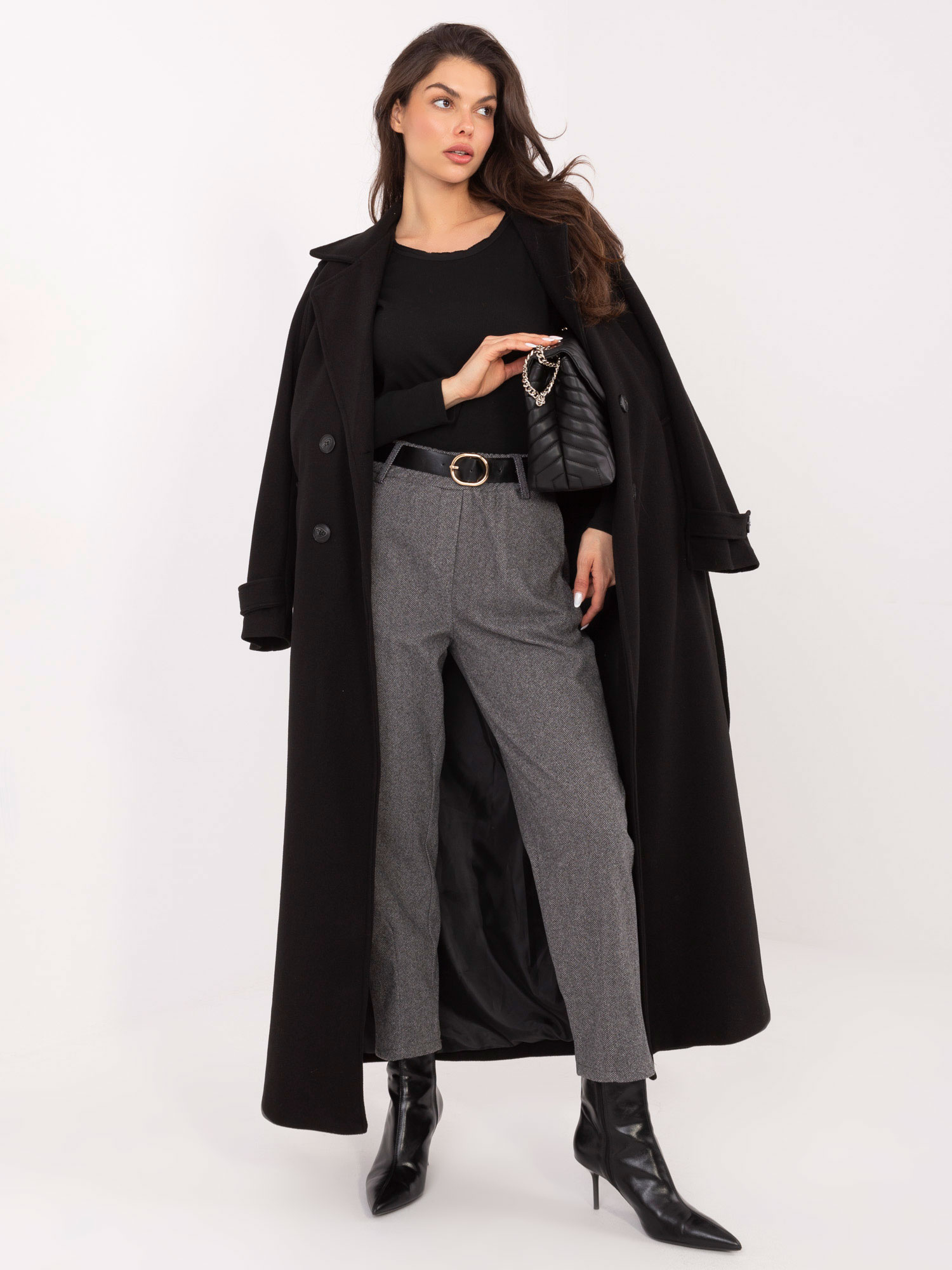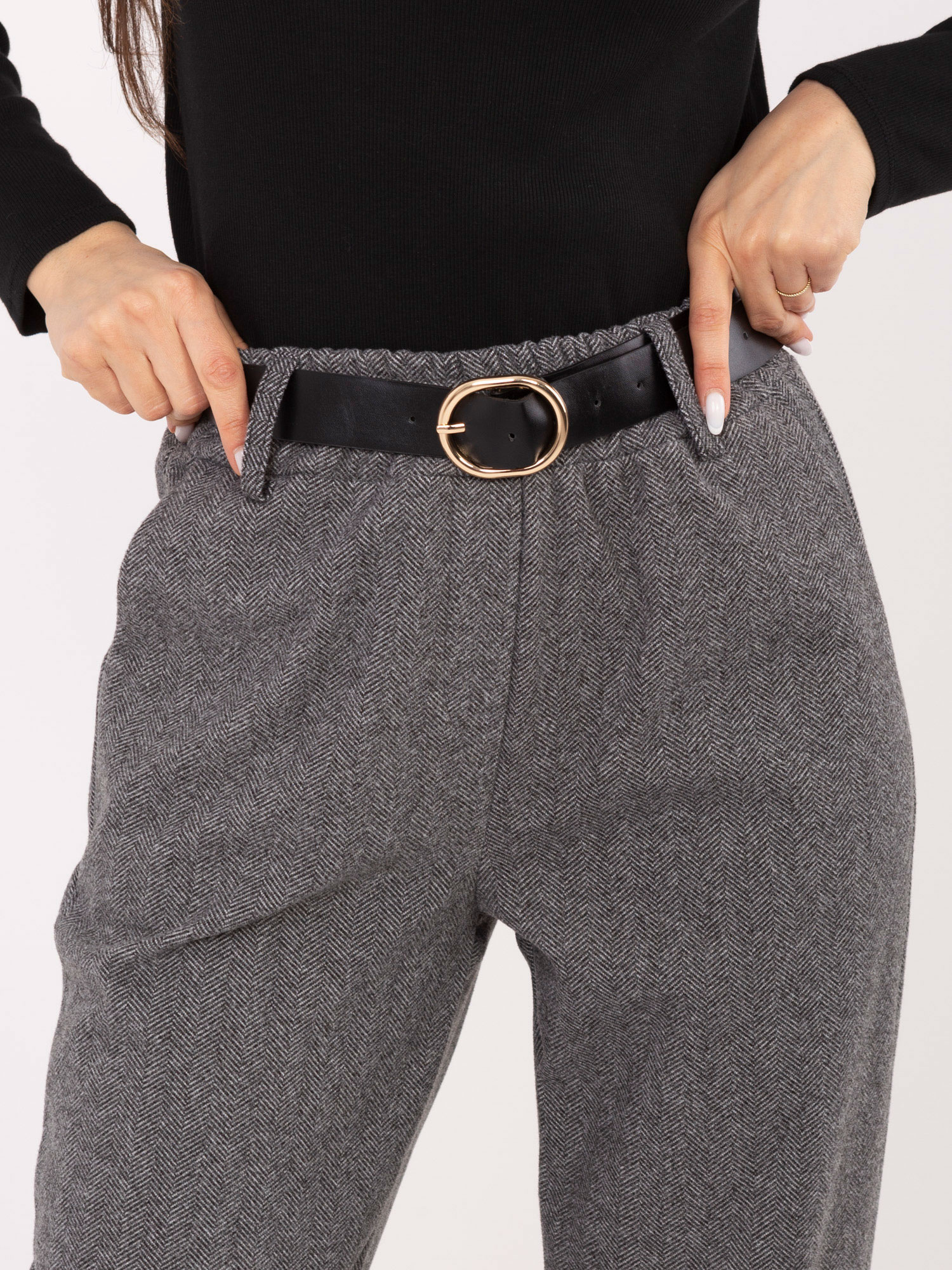 A nadrág oldalán zsebek találhatók, valamint egy hozzá illő öv is része, amely szépen kiemeli a derekat. Mintázata halszálkás hatású, ami elegáns, visszafogott megjelenést ad.