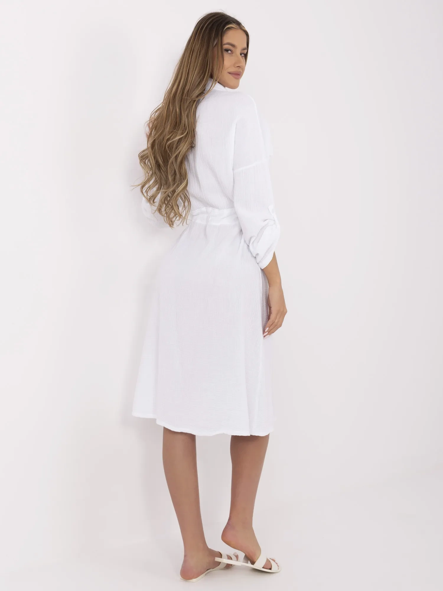 Az Italy Moda ingruhája a letisztult elegancia és a természetes kényelem tökéletes kombinációja, amely ideális választás a mindennapokra. A klasszikus galléros kialakítás és a végig gombos megoldás időtálló megjelenést ad, miközben a derekánál megköthető rész finoman formálja az alakot. A hosszú ujjú fazon és a midi hossz kiegyensúlyozott, nőies sziluettet teremt, amely egyszerre kényelmes és stílusos. A praktikus zsebek tovább növelik a viselési komfortot, így ez a darab könnyedén beilleszthető egy modern, jól variálható gardróbba.