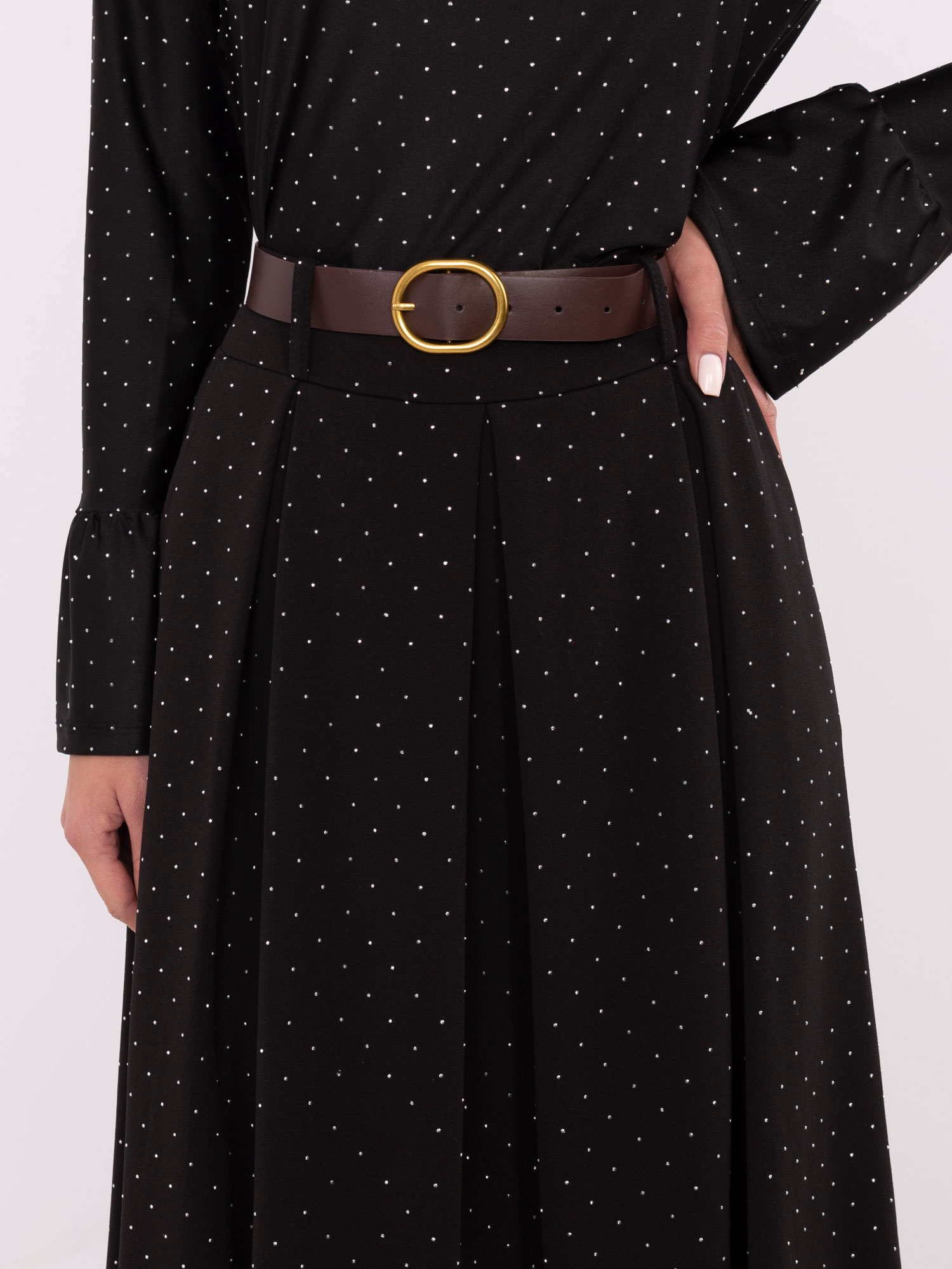 Ez az Italy Moda elegáns, maxi fazonú szoknya stílusos és nőies megjelenést biztosít bármilyen alkalomra. Az applikációval és díszítő kövekkel ellátott részletek finom eleganciát kölcsönöznek, míg a deréköves kialakítás szépen kiemeli az alakot. Könnyű, lágyan leomló anyaga miatt ideális választás alkalmi eseményekre, vacsorákra vagy ünnepi viseletként.