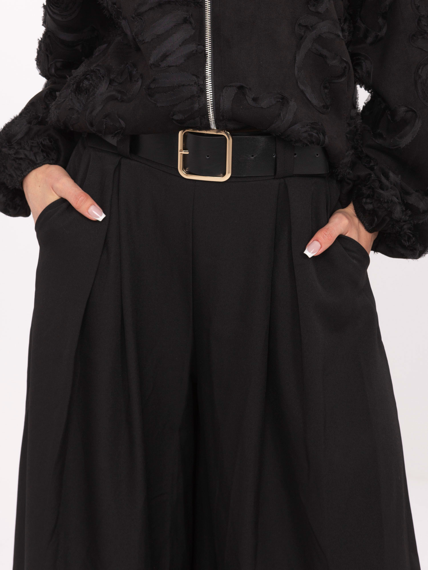 Az ITALY MODA elegáns, hosszú palazzo nadrágja tökéletes választás mindennapi viselethez, munkába vagy alkalmi megjelenéshez. A könnyed, lágy esésű viszkóz anyag rendkívül nőies hatást kelt, a bő szárú fazon pedig optikailag nyújtja a lábakat és kecses sziluettet ad. A magasított derékrész kényelmesen követi a testet, a hozzá tartozó öv pedig tovább formálja az alakot.