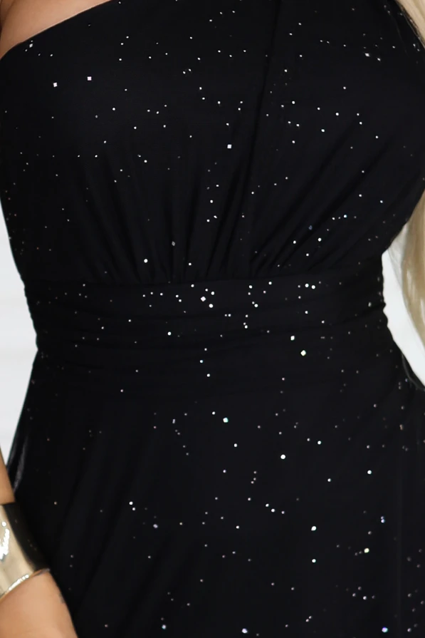 A maxi hosszúságú estélyiruha könnyű, lágy esésű, enyhén áttetsző anyagból készült, amelyet finom csillámhatás díszít. Az alatta található puha bélés kényelmes viseletet biztosít, miközben szépen tartja az anyag vonalát. A drapériás egyvállas felsőrész elegánsan formálja a vállakat és a dekoltázst, míg a hangsúlyos, széles megkötős derékrész gyönyörűen kiemeli a derekat. A több rétegből álló, légies szoknyarész minden mozdulatnál finoman hullámzik, így tánc közben különösen látványos.