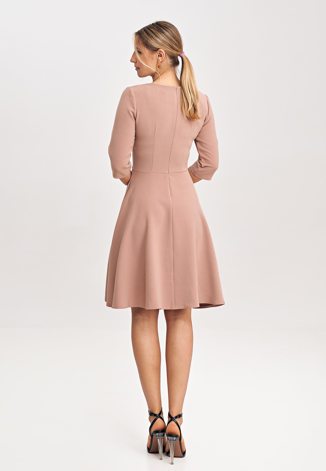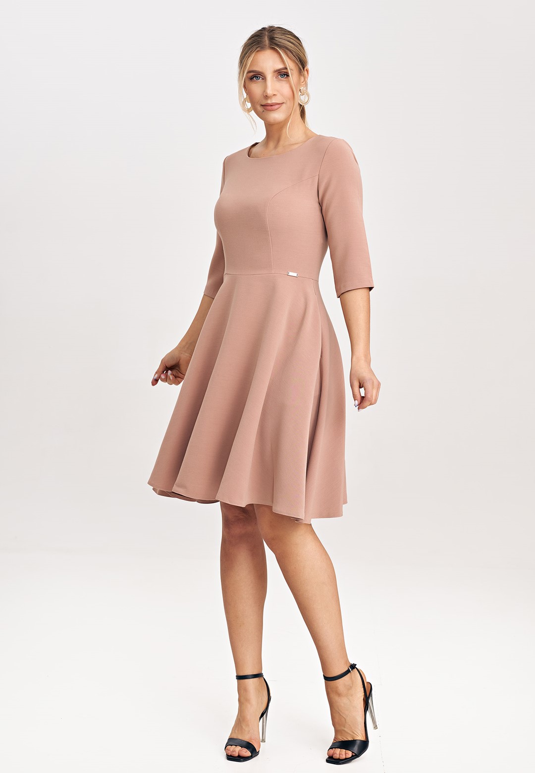 Ez a klasszikus szabású, bővülő fazonú ruha időtálló eleganciát és nőies megjelenést kínál. A derékban karcsúsított kialakítás szépen formálja a sziluettet, míg a 3/4-es ujjak kifinomult és praktikus megoldást jelentenek, így a modell több évszakban is ideális választás. A lágy esésű szoknyarész könnyed mozgást biztosít, harmonikus és elegáns összhatást teremtve.