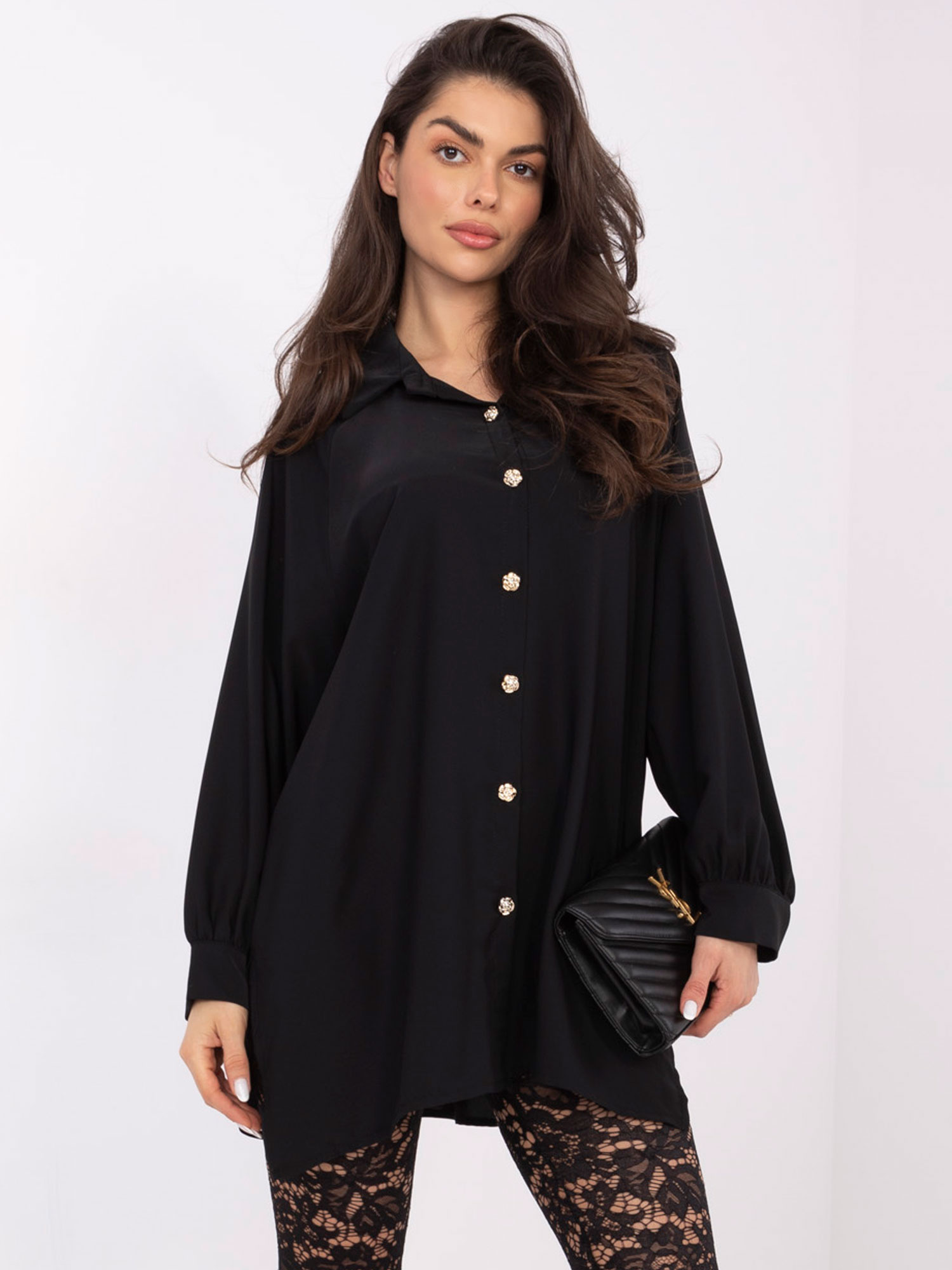 Ez a hosszított fazonú, elegáns Factory Price női ing tökéletes választás mindennapi irodai viselethez, üzleti találkozókra és alkalmi megjelenésekhez. Letisztult, sima anyagból készült, klasszikus gallérral, elöl gombolással és különleges, enyhén puffos ujjmegoldással, amely nőies karaktert ad az összhatásnak.