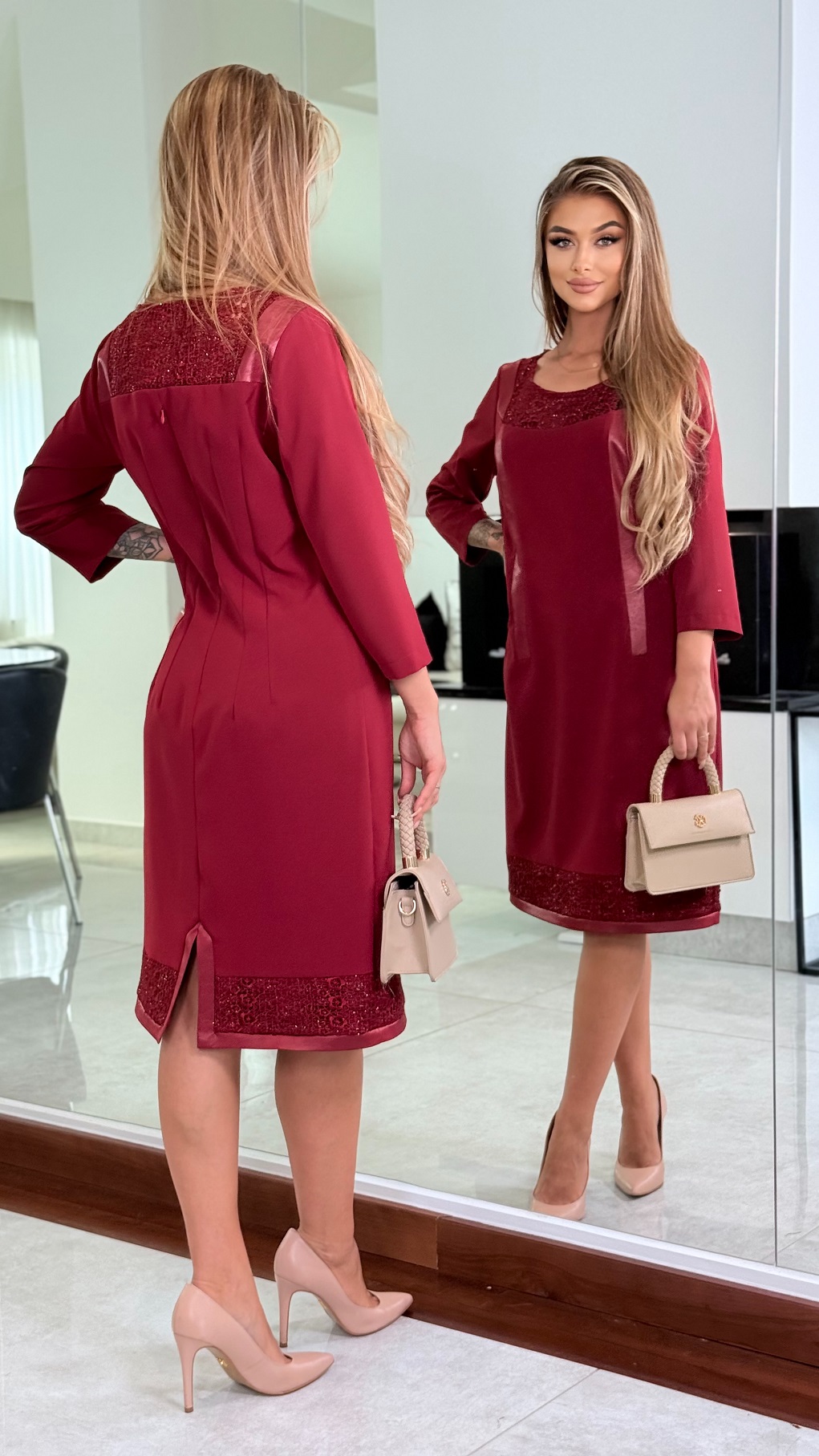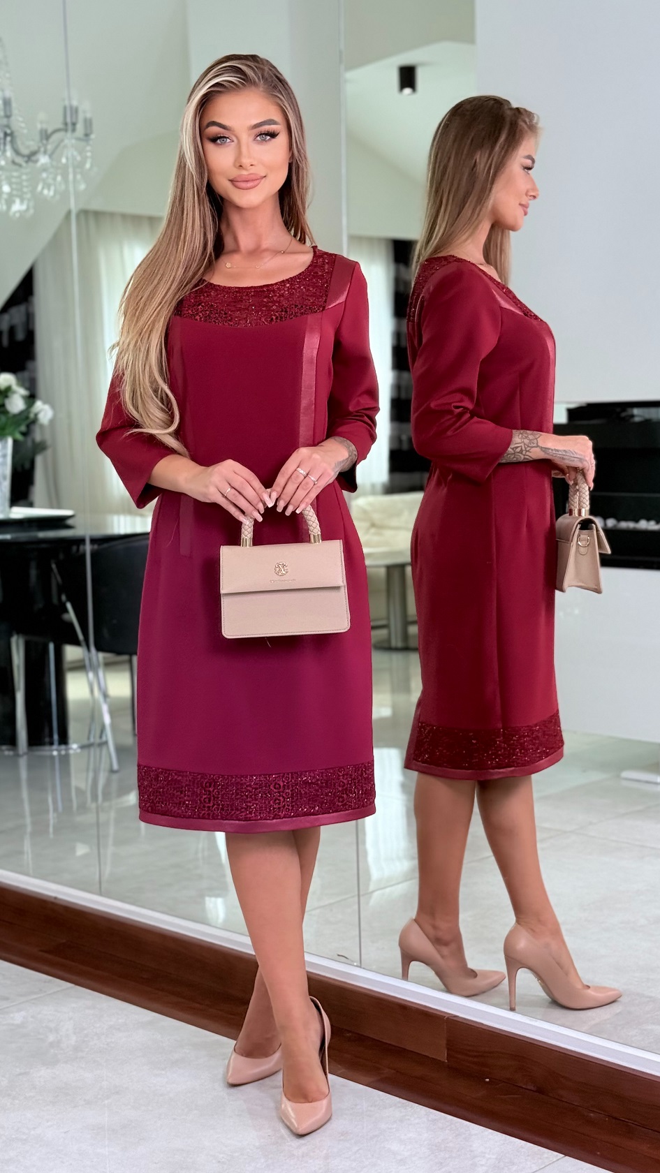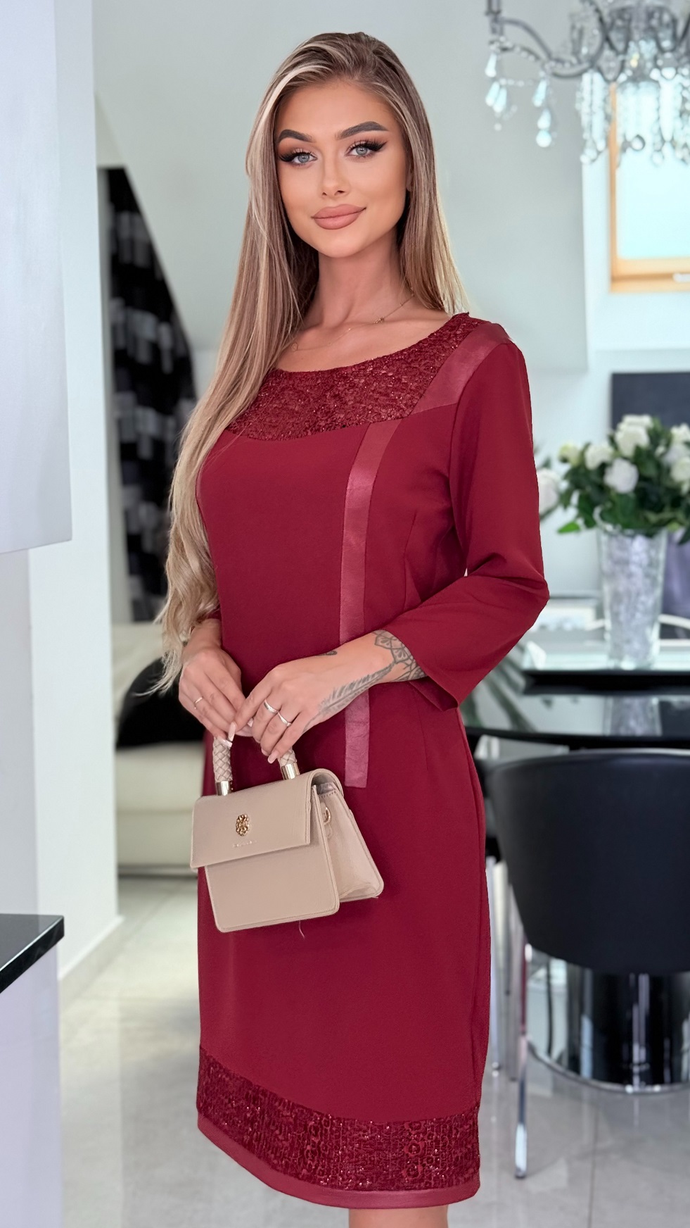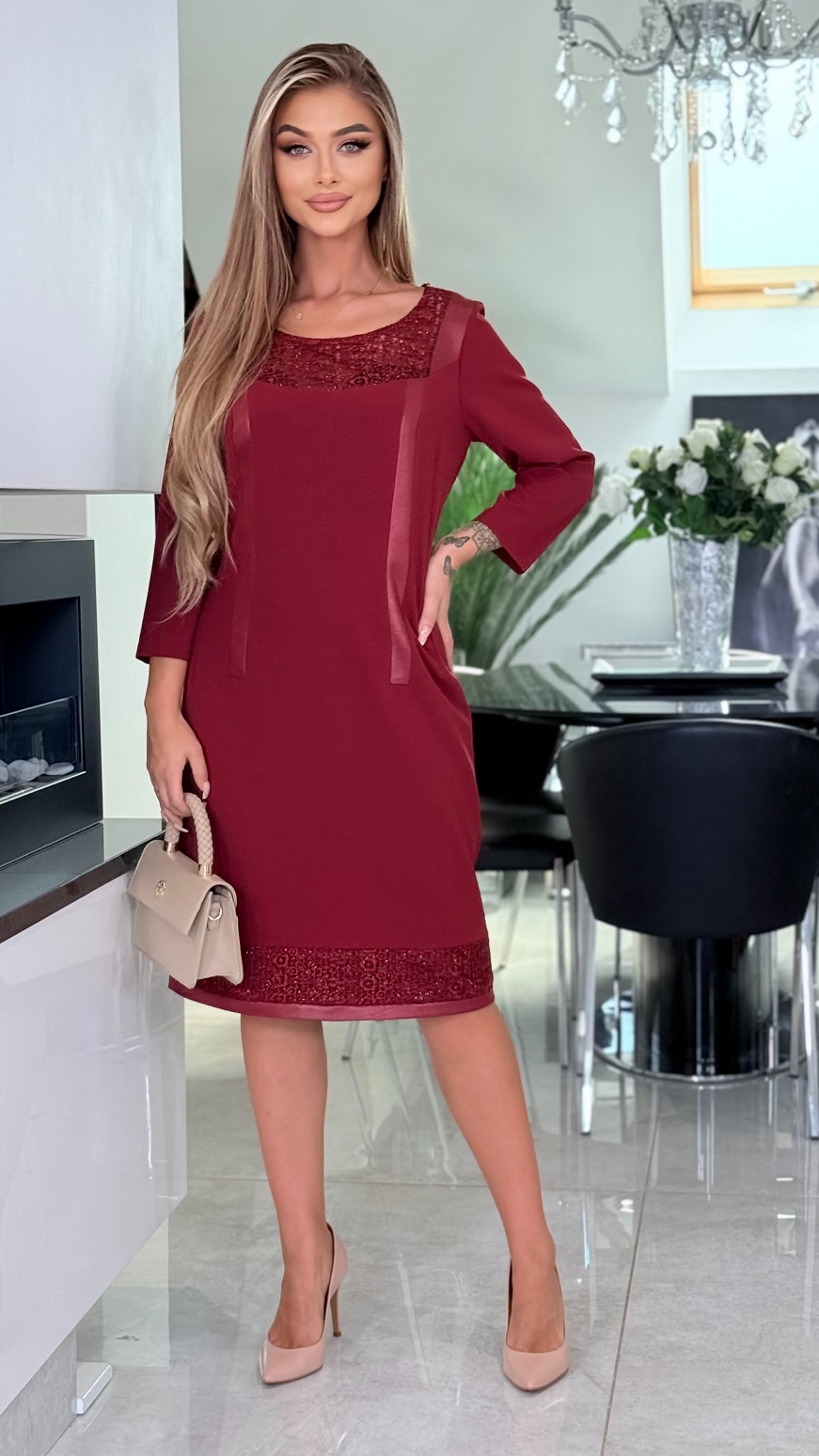 Elegáns egyszínű anyag és csipke kombinációja, dekoratív bőrhatású rakásokkal díszítve. Kifinomult választás, amely tökéletesen kiemeli a nőies vonalakat – alkalmakra és elegáns megjelenéshez egyaránt ideális.