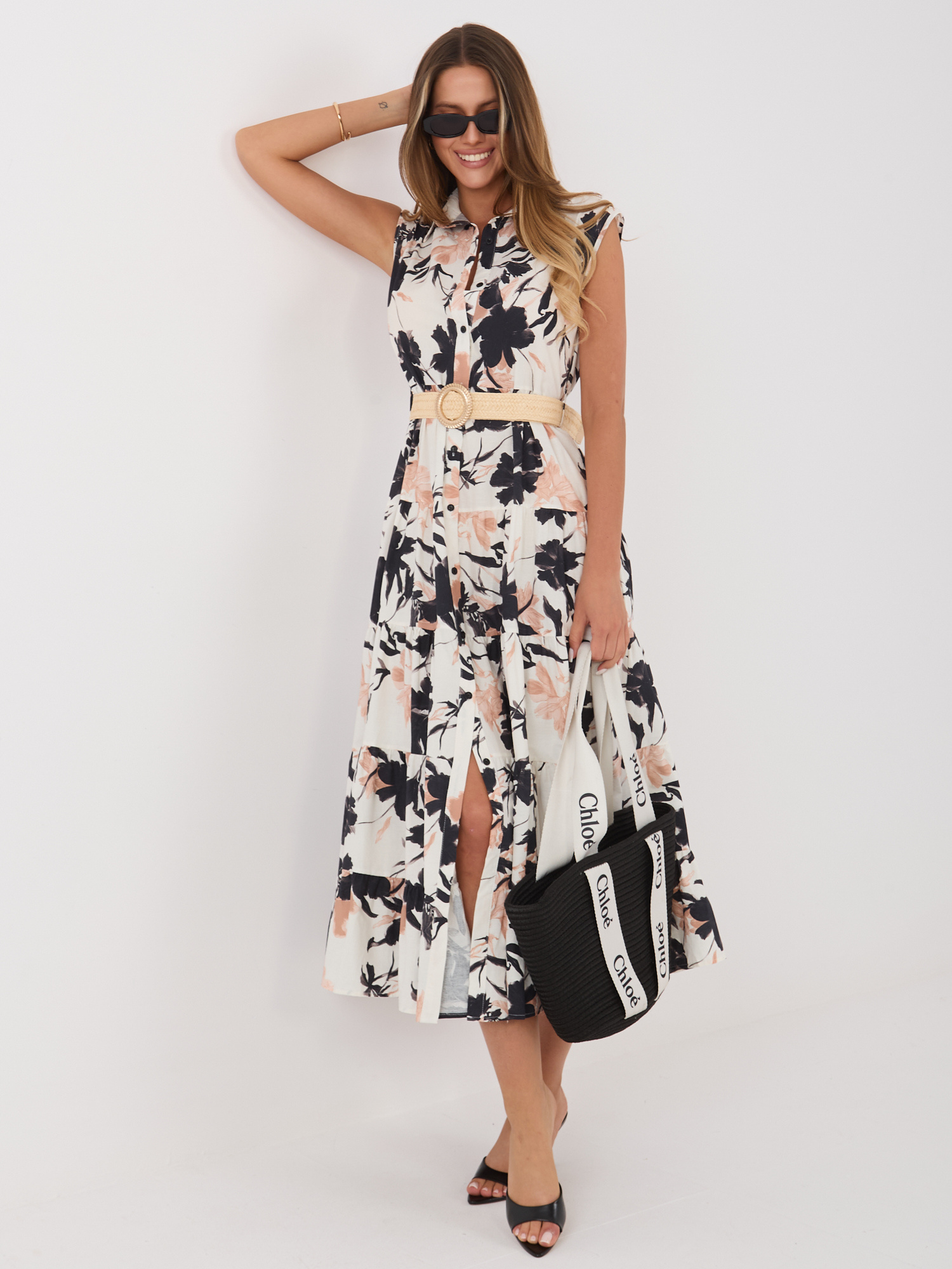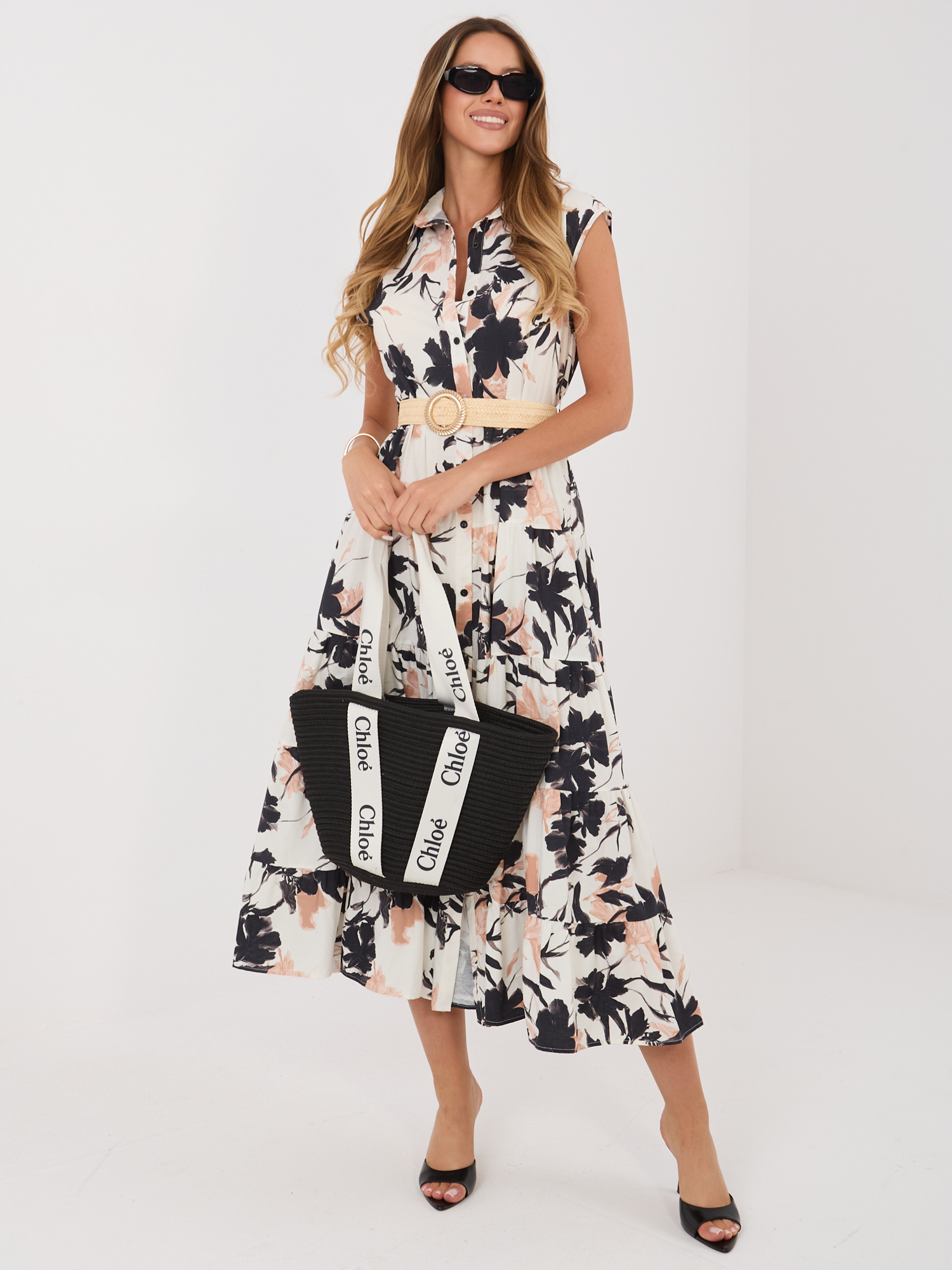 A galléros kialakítás klasszikus, rendezett hatást ad, amelyet a gombos záródás tesz praktikussá és időtállóvá. Az ujjatlan fazon friss és nyárias, míg a mintás felület stílusos, modern megjelenést kölcsönöz. A fodros részletek játékos nőiességet visznek az összképbe, a deréknál elhelyezett öv pedig szépen kiemeli a sziluettet.