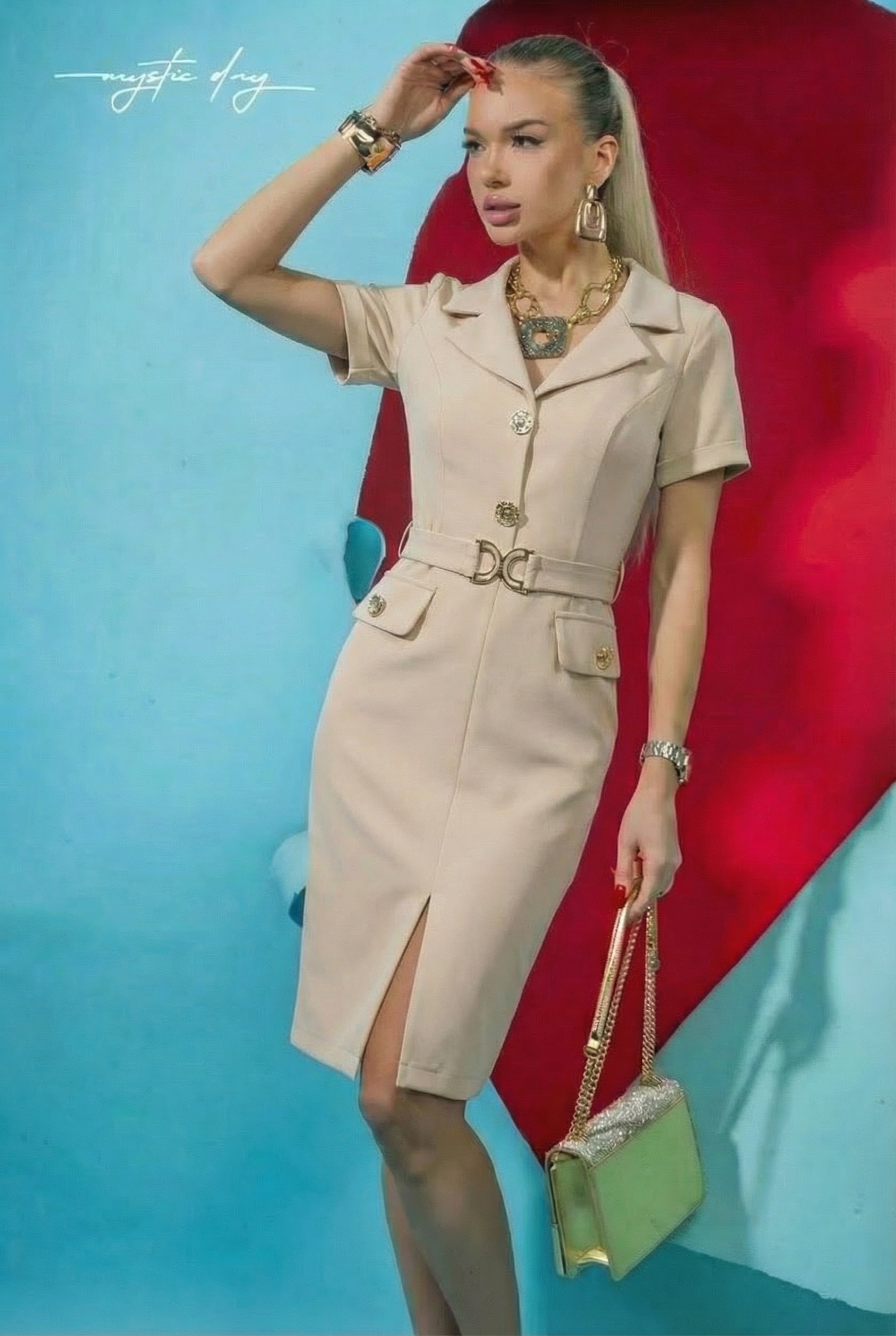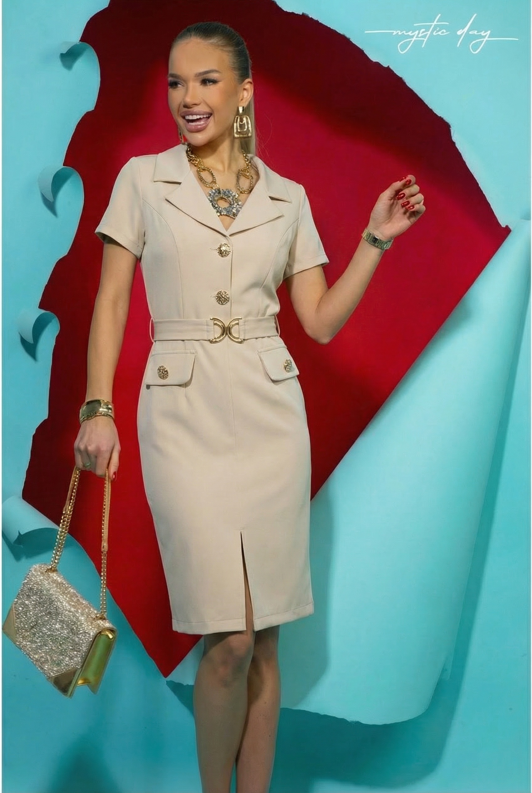 Ez a különleges, mégis letisztult szabású Mystic Day ruha tökéletes választás, ha elegáns és magabiztos megjelenésre vágysz akár munkahelyen, akár alkalmi eseményen vagy esti programon. A finoman karcsúsító V-nyakkivágás szépen nyújtja a felsőtest vonalát, míg a galléros kialakítás kifinomult, modern karaktert kölcsönöz az összhatásnak.