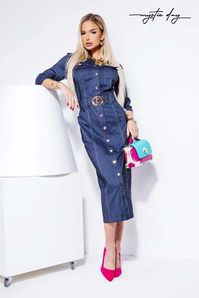 Ez a farmerkék árnyalatú, midi hosszúságú ceruza fazonú ruha elegáns és nőies megjelenést biztosít, miközben szépen követi az alak vonalát. A testhezálló szabás karcsú sziluettet formál, a deréknál kialakított szabásvonal pedig tovább hangsúlyozza a nőies formákat. Az elöl végig gombos kialakítás divatos és karakteres részletként teszi különlegessé a ruhát, miközben a hozzá tartozó rugalmas öv kiemeli a derékvonalat és harmonikus arányokat teremt. Az övbújtatóknak köszönhetően más övvel is könnyen variálható. A kerek nyakkivágás klasszikus és időtálló megoldás, a háromnegyedes ujjak pedig kényelmes, mégis elegáns összhatást adnak. A praktikus zsebek tovább növelik a ruha komfortját, így ez a modell egyszerre stílusos és jól hordható választás a mindennapokra vagy alkalmi megjelenéshez.