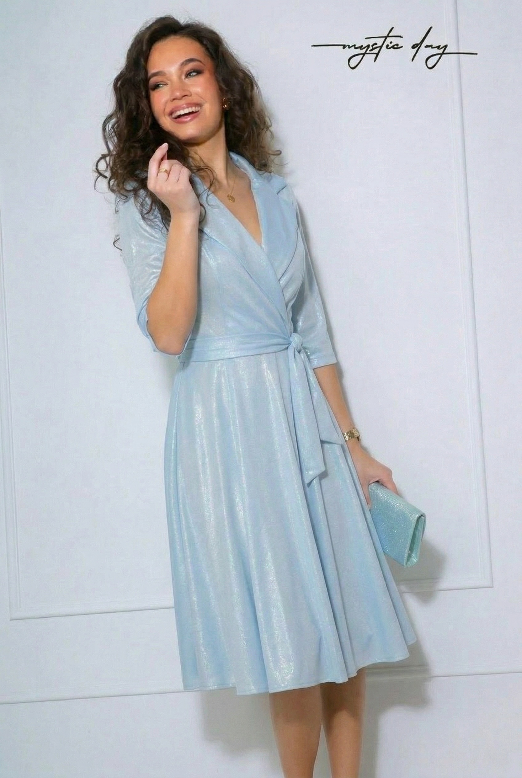 Ez az elegáns, világoskék színű Mystic Day ruha letisztult és nőies megjelenést biztosít. A ruha átlapolt, V-kivágású felsőrésze kiemeli a dekoltázst, miközben az övrésszel megkötött derék hangsúlyozza az alakot. A háromnegyedes ujj kényelmes viseletet ad, az enyhén bővülő, A-vonalú szoknyarész pedig elegáns esést és könnyed mozgást biztosít.