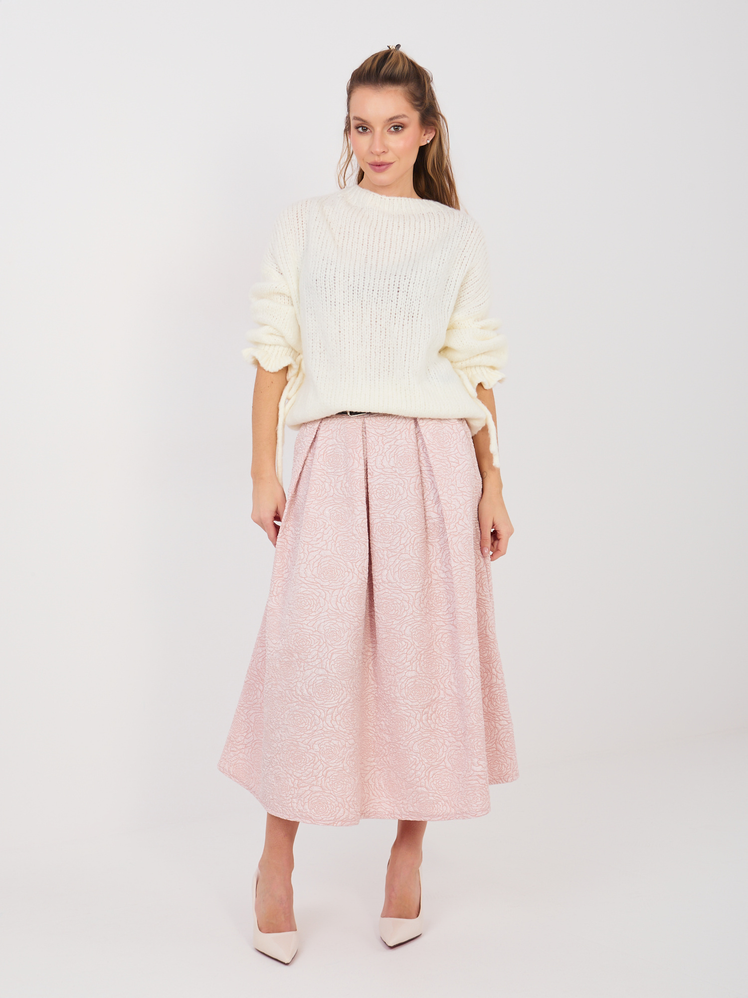 Ez a nőies, bővülő fazonú midi szoknya elegáns és kifinomult választás munkahelyi vagy alkalmi megjelenésekhez. A különleges textúrájú, virágmintás anyag egyedi karaktert ad a darabnak, miközben a midi hossz klasszikus, jól hordható sziluettet biztosít. A derékrészen elhelyezett öv szépen hangsúlyozza az alakot, az oldalzsebek pedig praktikus részletként egészítik ki a stílusos megjelenést. Záródás nélküli kialakítása kényelmes viseletet nyújt, így a szoknya könnyedén kombinálható elegáns blúzzal vagy letisztult felsővel is.