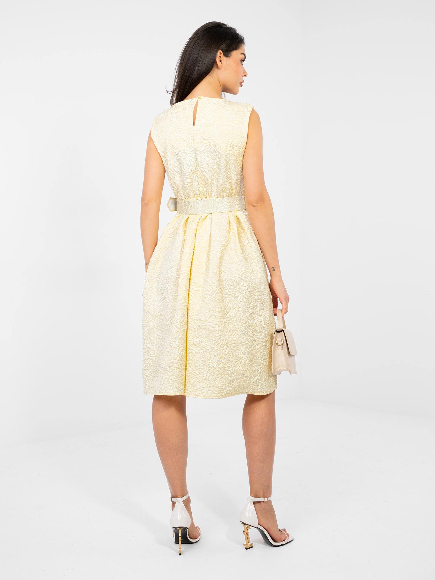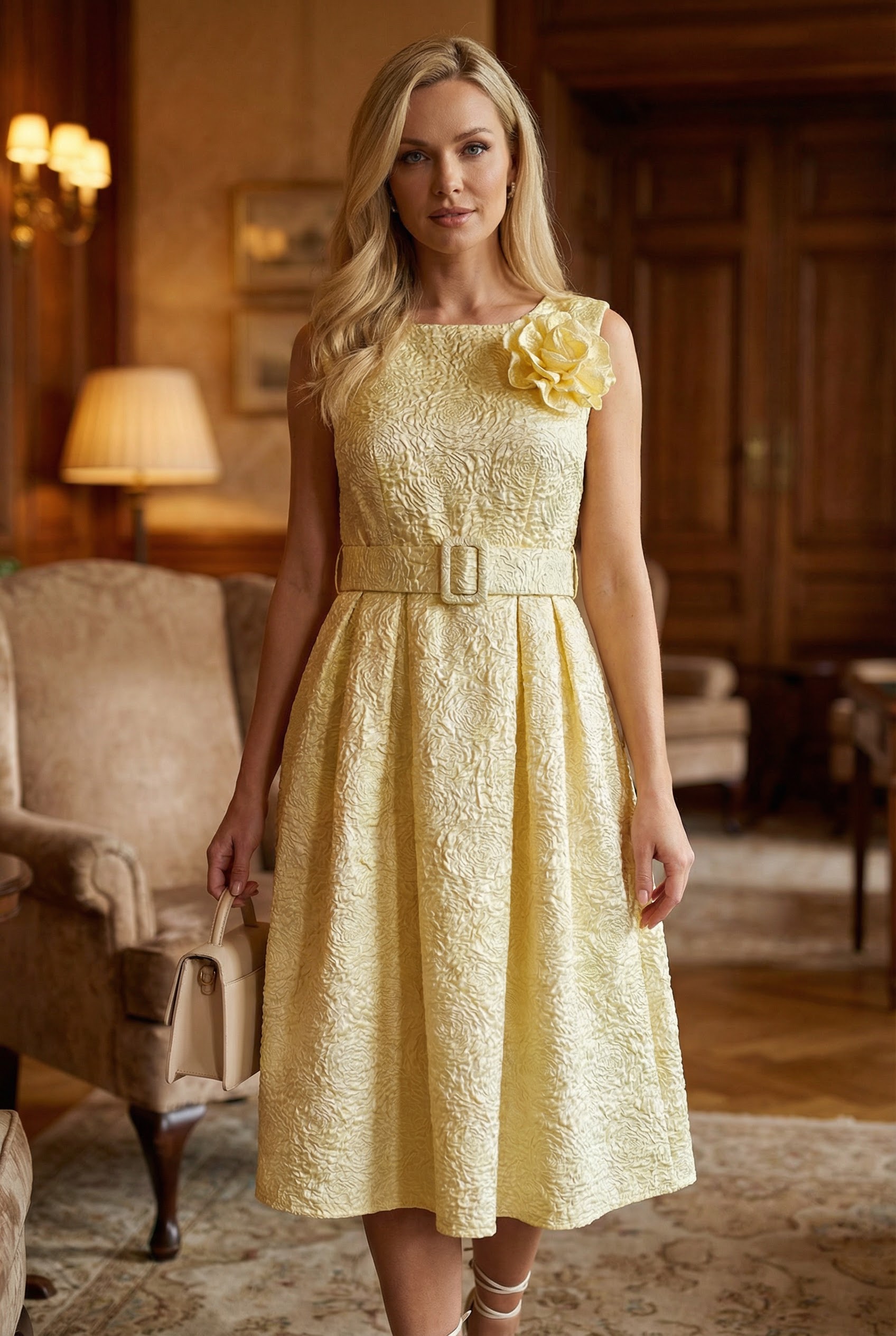 Ez az elegáns, koktél stílusú ruha nőies és kifinomult választás alkalmi eseményekre vagy esti programokra. A térd alá érő, enyhén bővülő fazon könnyed esést biztosít, miközben szépen hangsúlyozza a derékvonalat. A kerek nyakkivágás klasszikus megjelenést ad, az ujjatlan kialakítás pedig légies, elegáns hatást kelt. A különleges textúrájú anyag finom karaktert kölcsönöz a ruhának, a deréknál elhelyezett öv és a dekoratív bross pedig stílusos részletként emeli ki az összképet. Ideális választás ünnepi alkalmakra, rendezvényekre vagy elegáns megjelenésekhez.