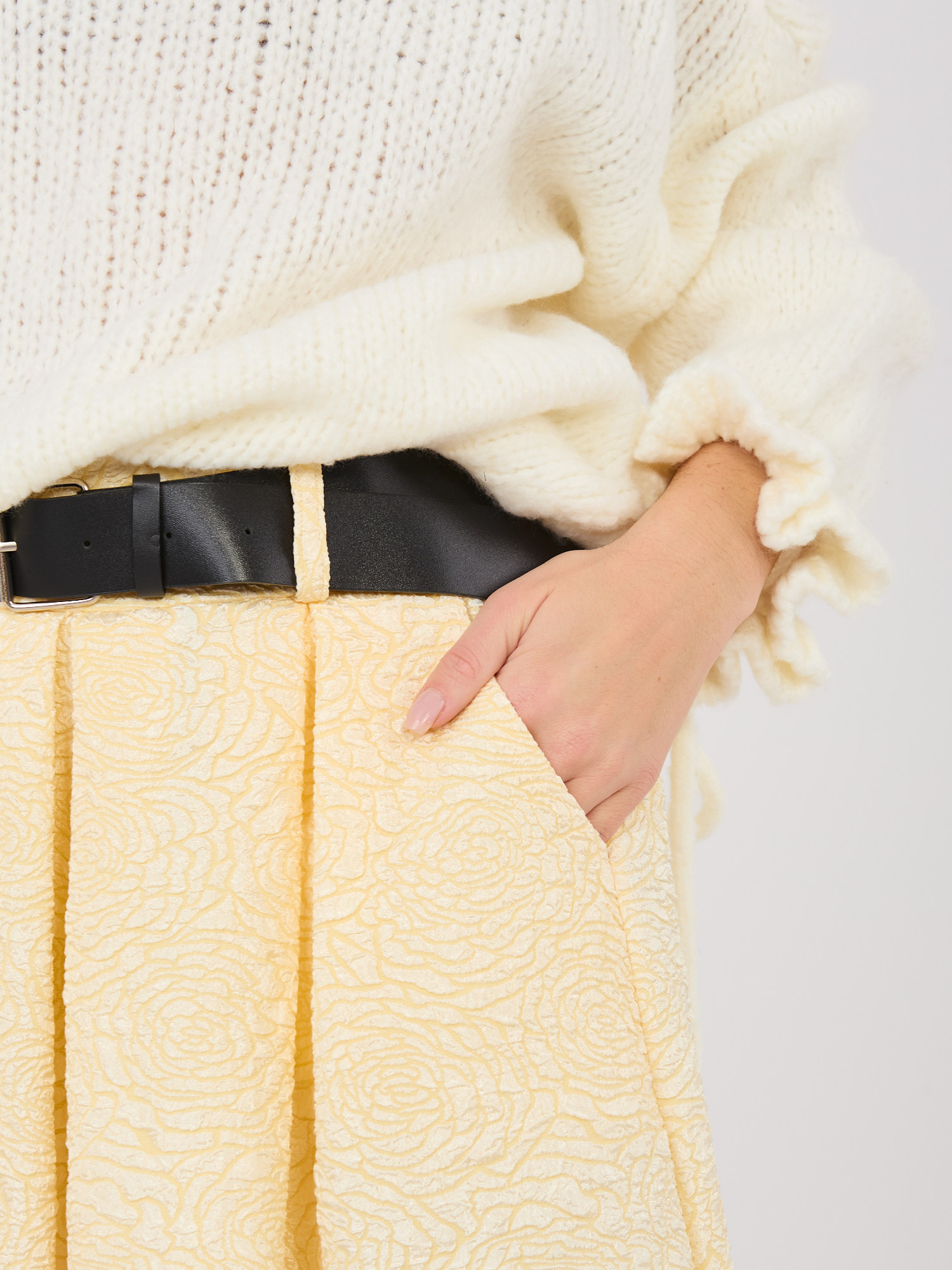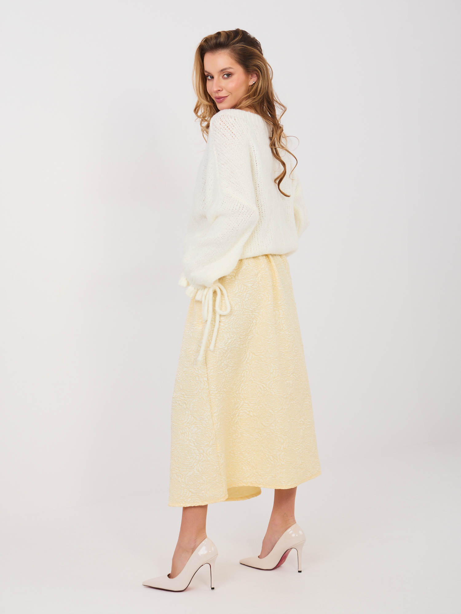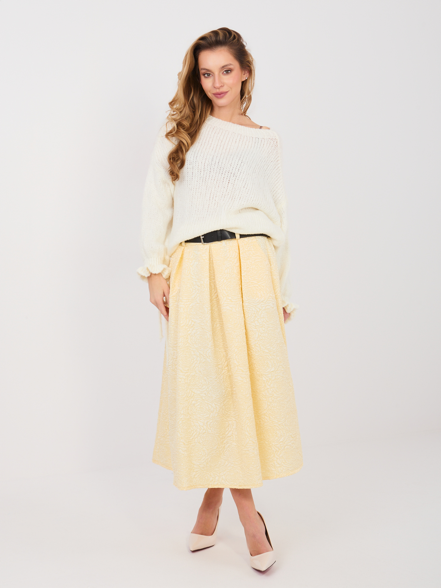 Ez a nőies, bővülő fazonú midi szoknya elegáns és kifinomult választás munkahelyi vagy alkalmi megjelenésekhez. A különleges textúrájú, virágmintás anyag egyedi karaktert ad a darabnak, miközben a midi hossz klasszikus, jól hordható sziluettet biztosít. A derékrészen elhelyezett öv szépen hangsúlyozza az alakot, az oldalzsebek pedig praktikus részletként egészítik ki a stílusos megjelenést. Záródás nélküli kialakítása kényelmes viseletet nyújt, így a szoknya könnyedén kombinálható elegáns blúzzal vagy letisztult felsővel is.