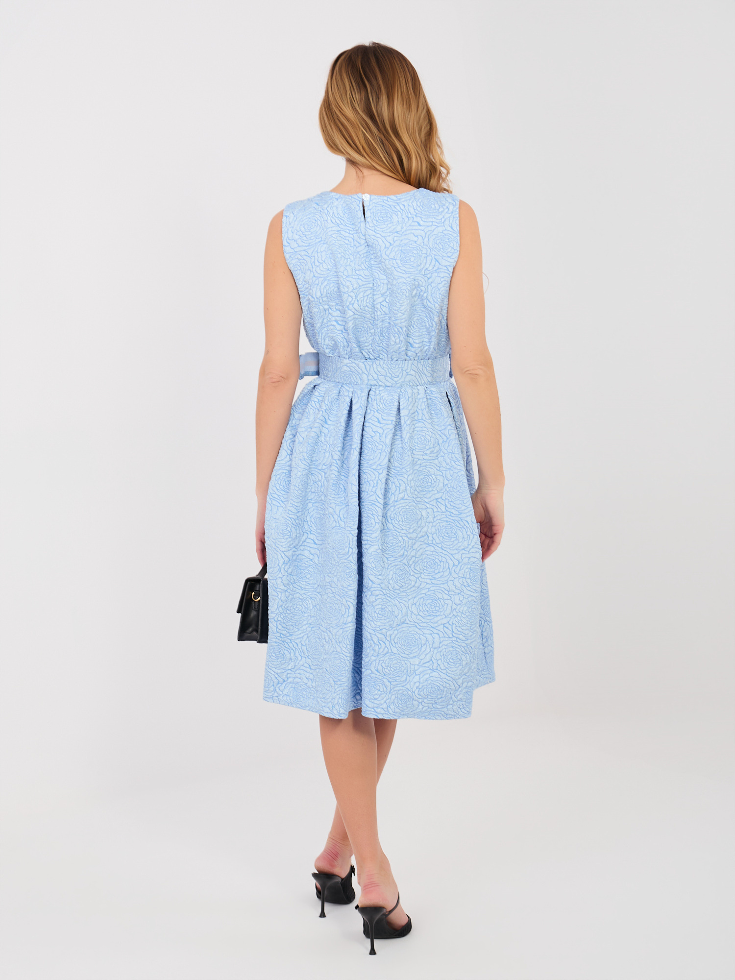 Ez az elegáns, koktél stílusú ruha nőies és kifinomult választás alkalmi eseményekre vagy esti programokra. A térd alá érő, enyhén bővülő fazon könnyed esést biztosít, miközben szépen hangsúlyozza a derékvonalat. A kerek nyakkivágás klasszikus megjelenést ad, az ujjatlan kialakítás pedig légies, elegáns hatást kelt. A különleges textúrájú anyag finom karaktert kölcsönöz a ruhának, a deréknál elhelyezett öv és a dekoratív bross pedig stílusos részletként emeli ki az összképet. Ideális választás ünnepi alkalmakra, rendezvényekre vagy elegáns megjelenésekhez.