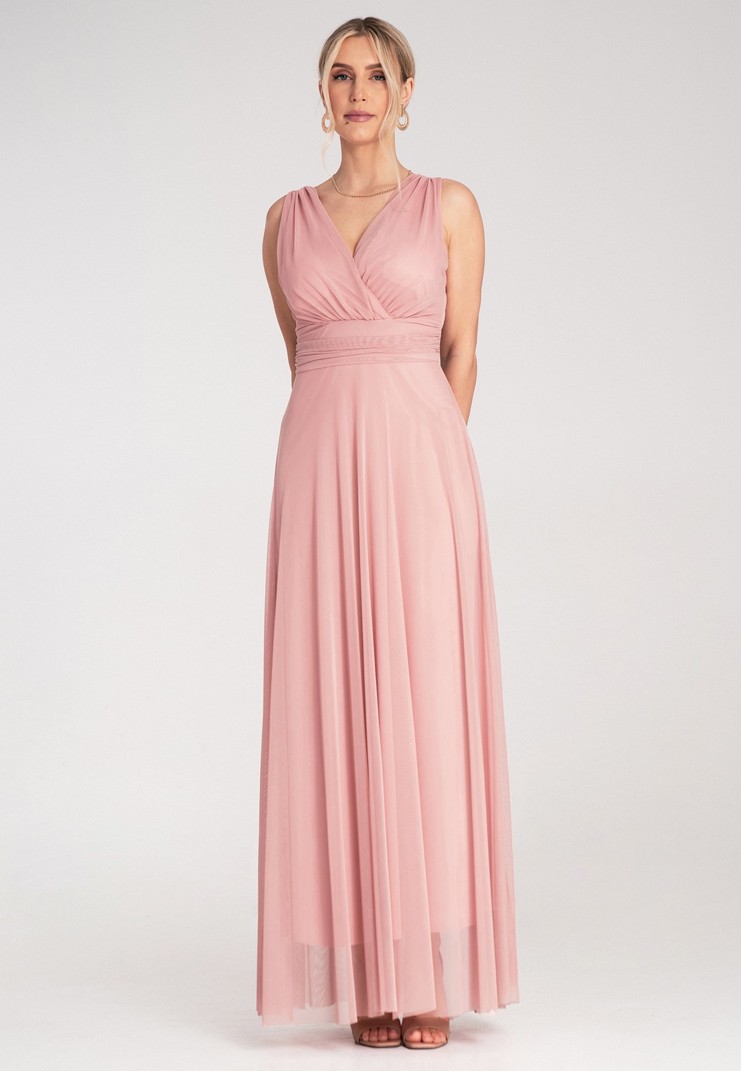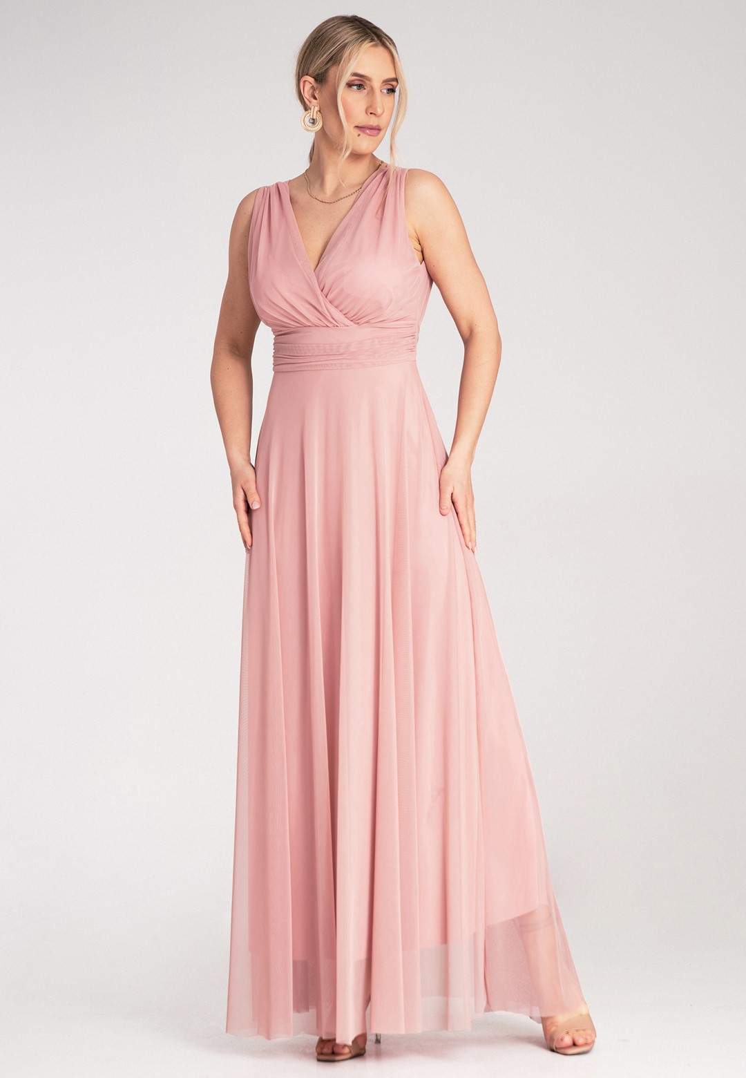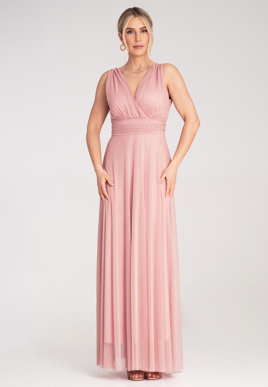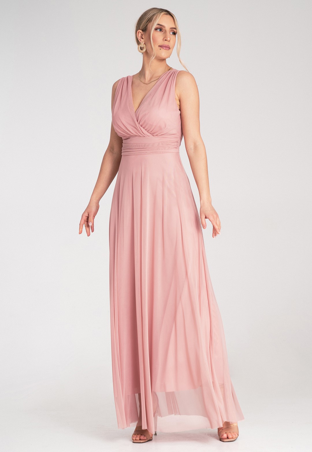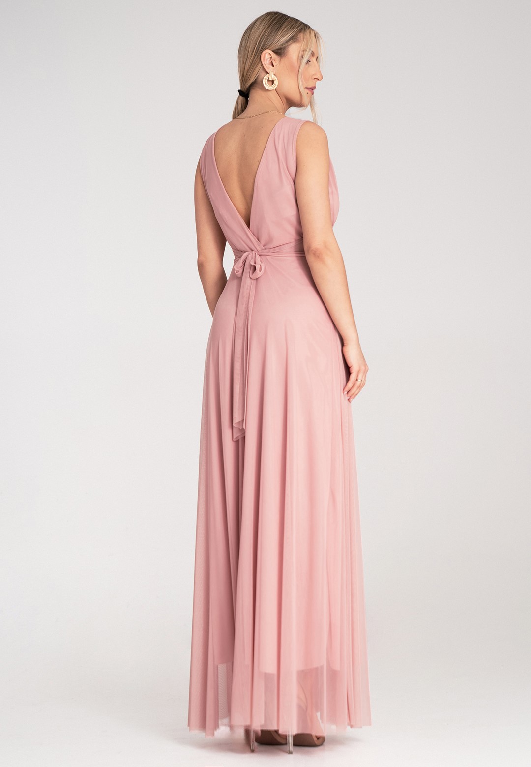 Ez a nőies maxi ruha elegáns és légies megjelenést biztosít minden alkalomra. Ujjatlan kialakítása és elöl átlapolt, V-dekoltázsa finoman hangsúlyozza a felsőrészt, míg a hátul mélyen kivágott fazon különleges, érzéki hatást kelt. A mellrésznél enyhén ráncolt megoldás és a mell alatt futó széles pánt szépen formálja az alakot, kiemelve a derékvonalat. A hátul masnira köthető rész nemcsak praktikus, hanem romantikus részletként teszi még egyedibbé a ruhát.