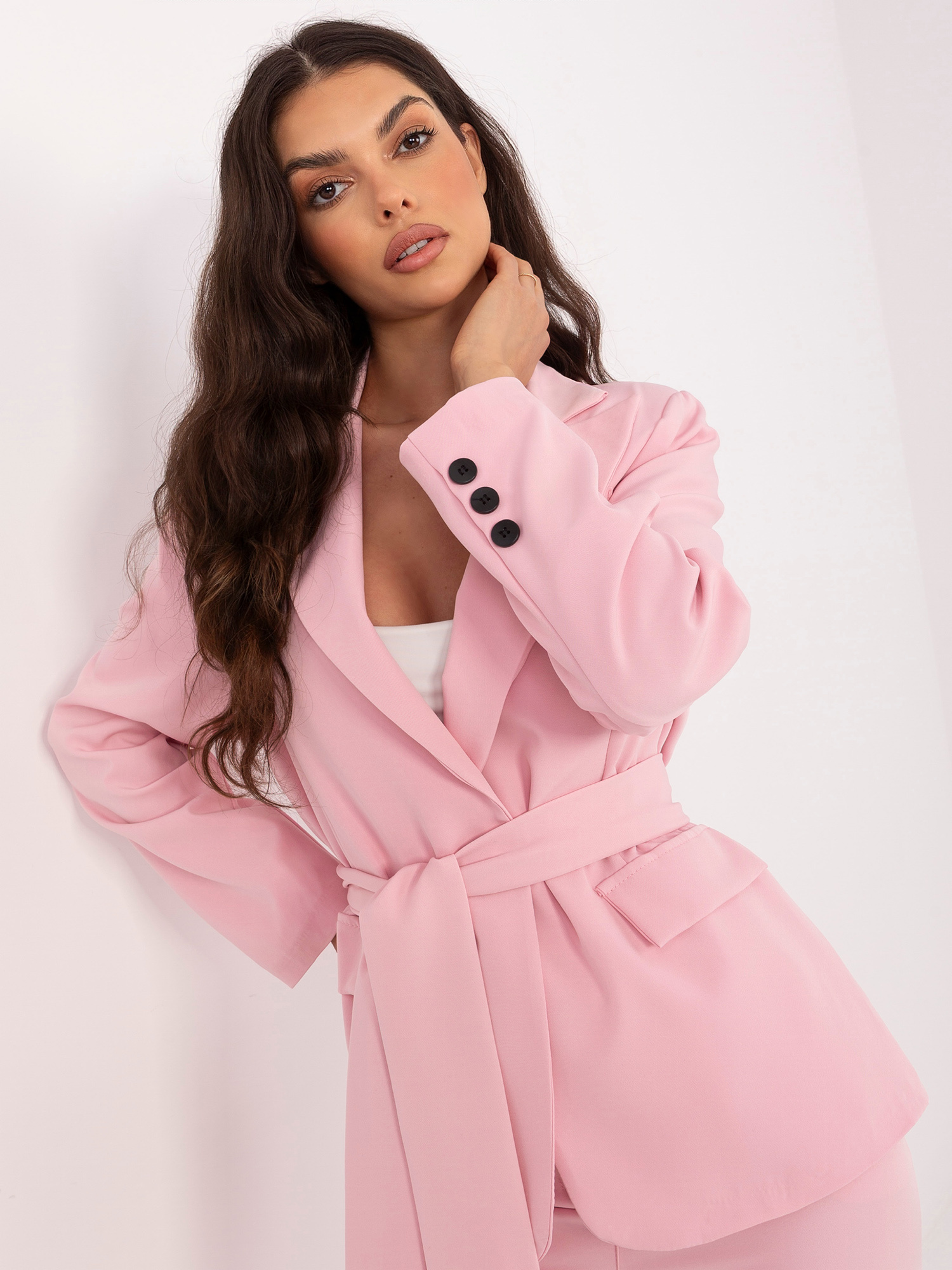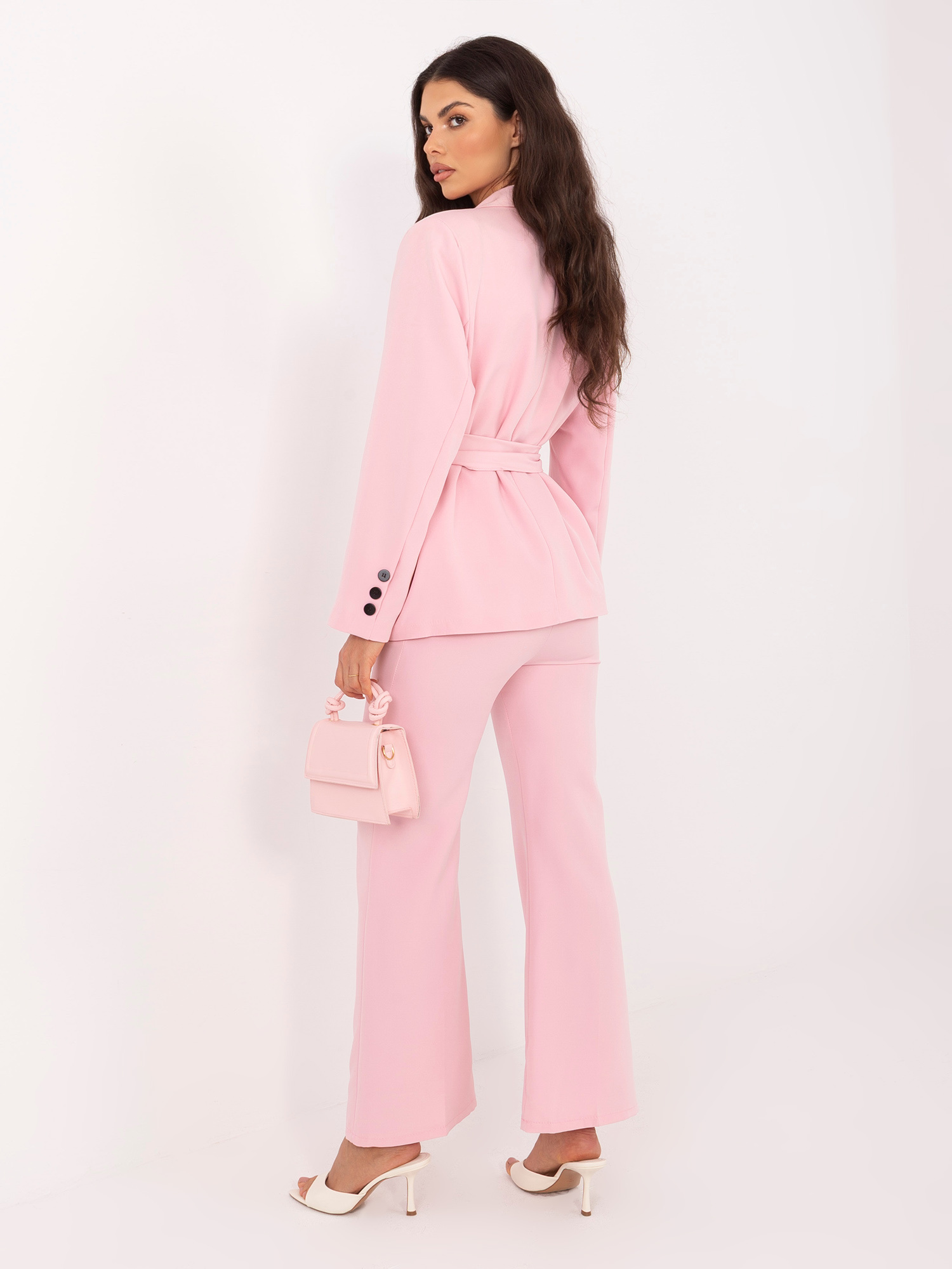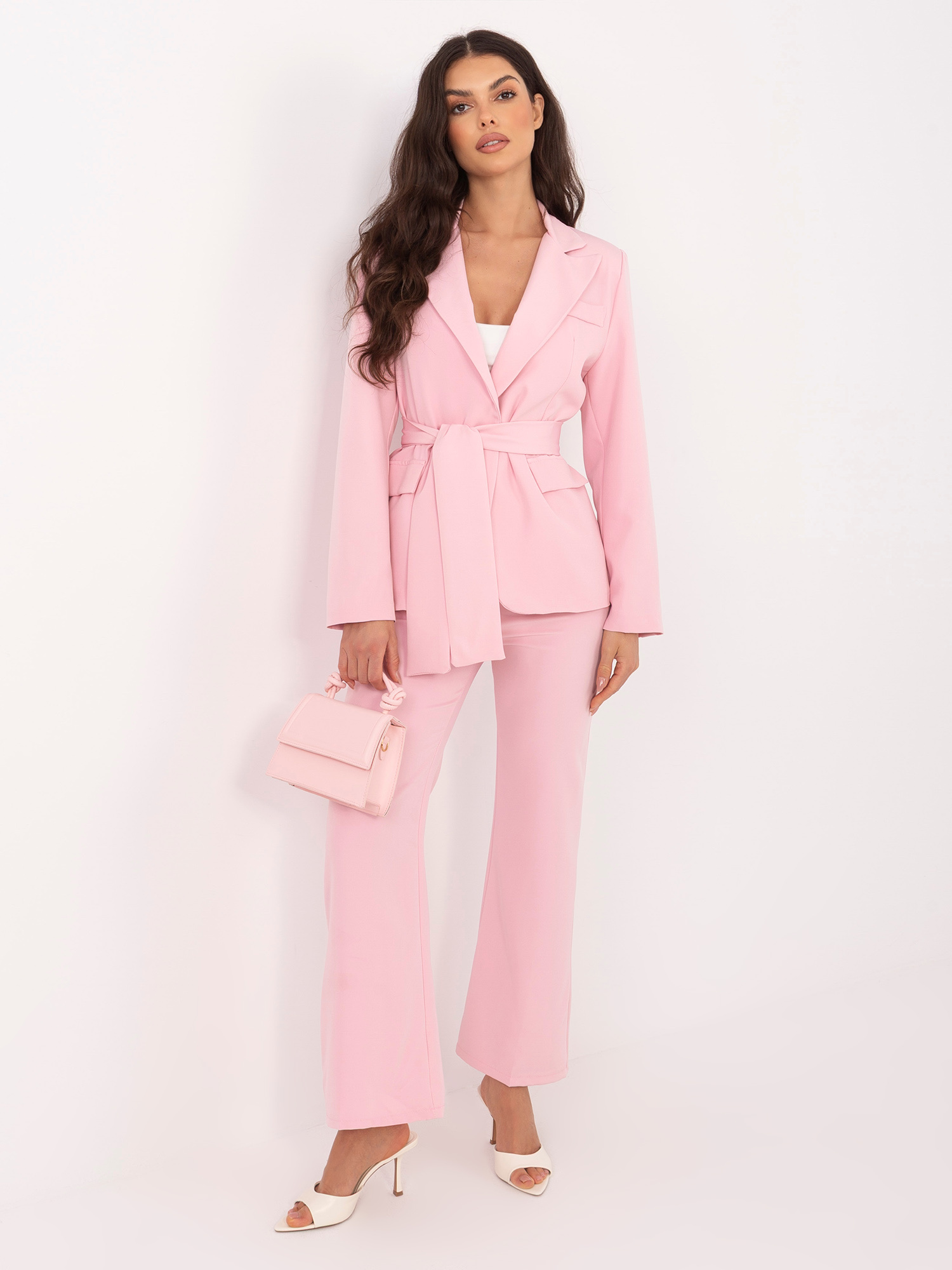 A zakó hosszú ujjú, bélelt kialakítású, amely strukturált, elegáns tartást ad az összhatásnak. A hozzá tartozó öv kiemeli a derekat, nőies sziluettet formálva. A nadrág magas derekú, széles szárú fazonja optikailag nyújtja az alakot, miközben kényelmes viseletet biztosít egész nap.