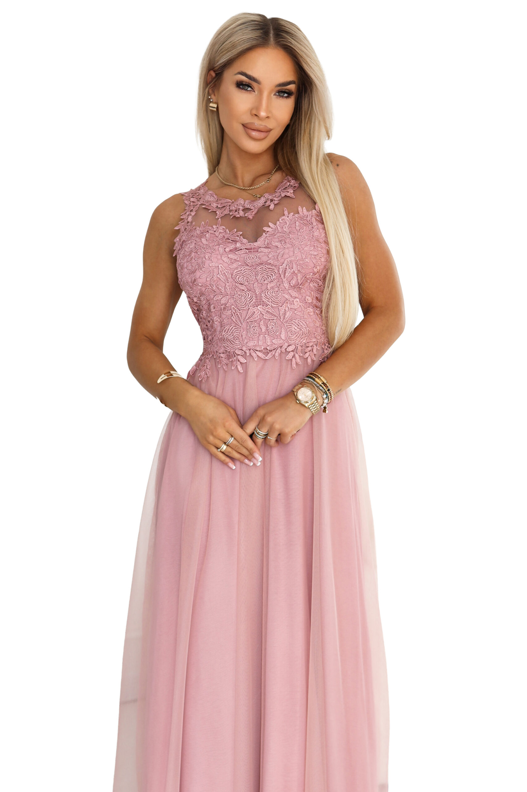 Ez a Numoco maxi ruha romantikus eleganciát és finom nőiességet sugároz, amely tökéletes választás különleges alkalmakra. A lágyan eső tüll szoknyarész légies mozgást biztosít, miközben könnyed, kifinomult megjelenést ad. A csipkével díszített felsőrész gondosan kidolgozott részletei elegáns karaktert kölcsönöznek, a finoman áttetsző betét pedig különleges, mégis visszafogott hatást teremt. A testhez simuló felsőrész szépen kiemeli a sziluettet, a hátrészen kialakított kivágás és csipkés részlet pedig nőies, látványos megoldás.